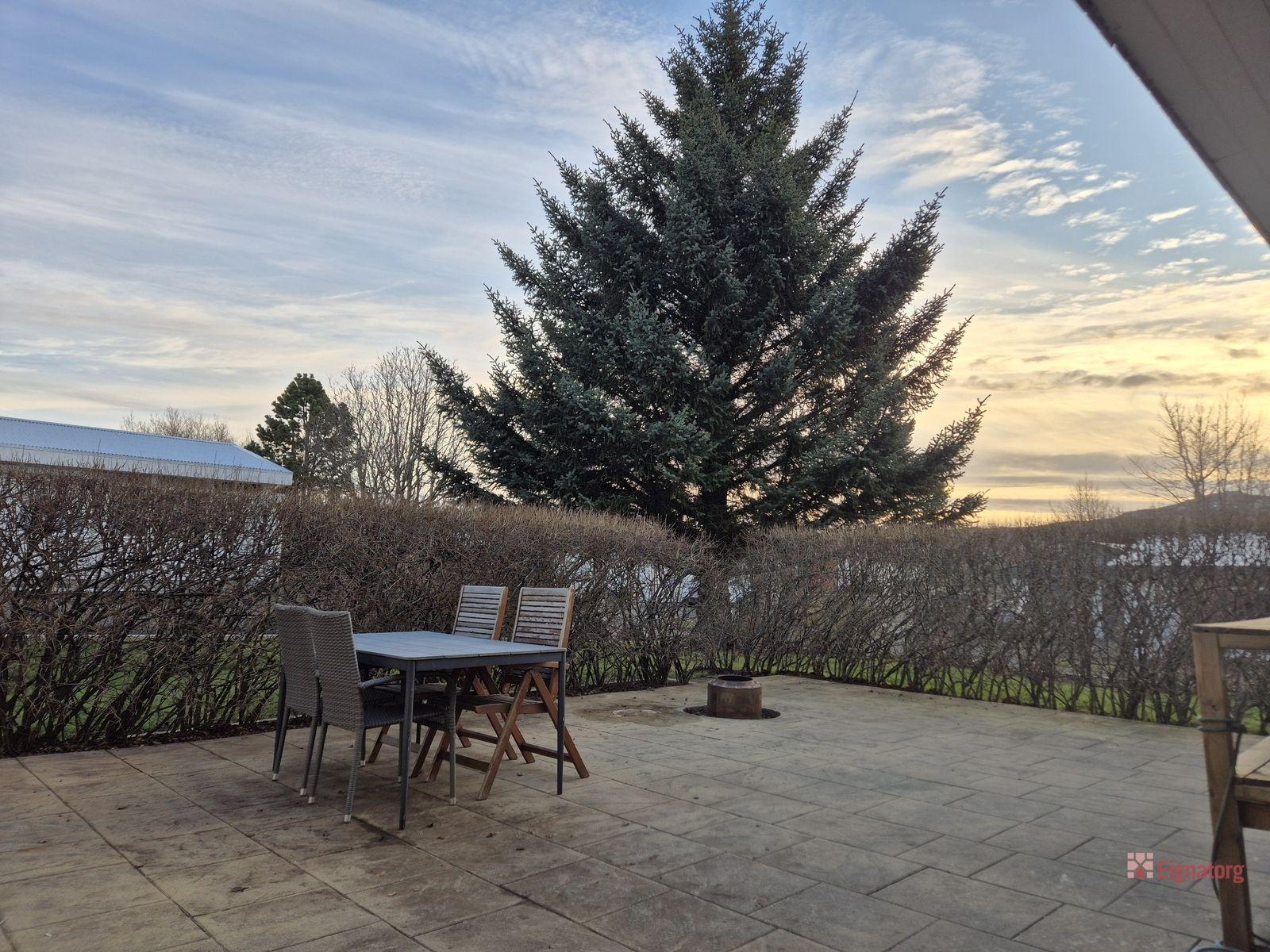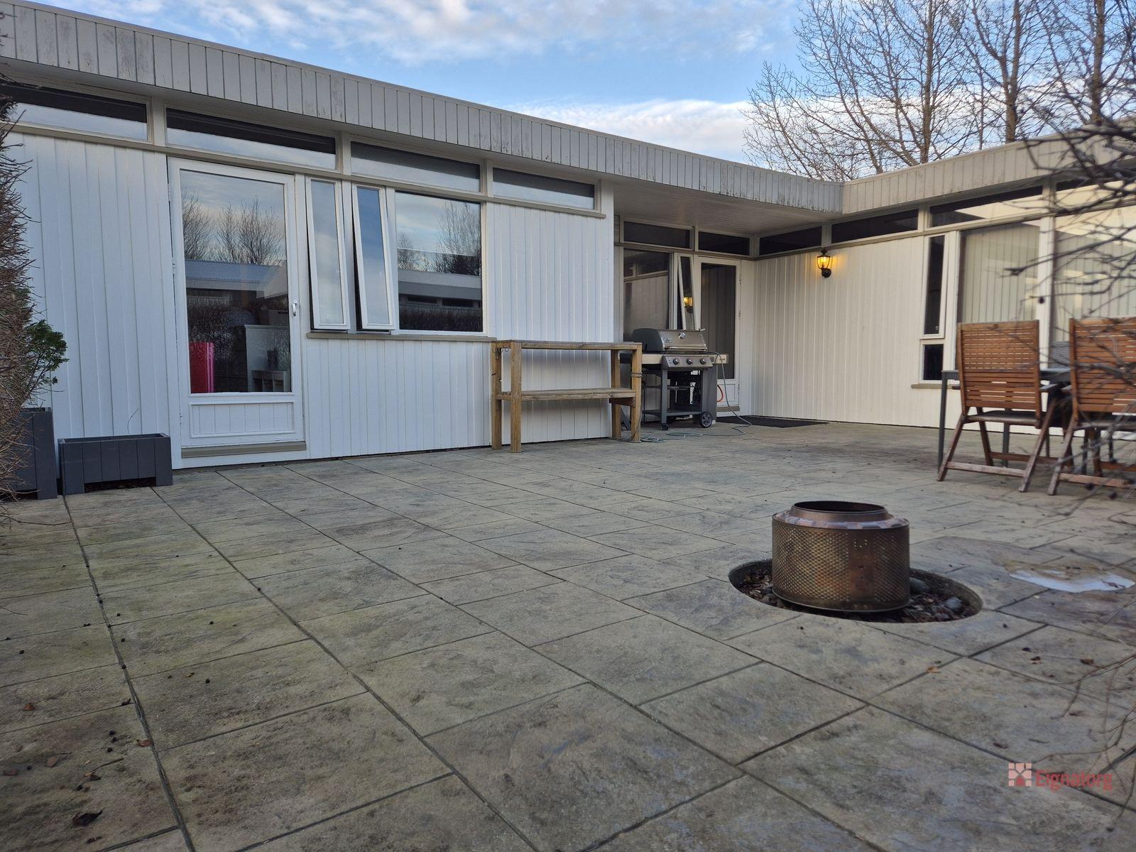 Nánari lýsing: Forstofa með flísum á gólfi. Hol með flísum á gólfi og hurð út á sólverönd sem er steypt með munstursteypu. Rúmgott og fallegt eldhús með flísum á gólfi, vandaðri innréttingu og granít borðplötum, borðkrók og tveimur gluggum. Inn af eldhúsi er rúmgóð geymsla með flísum á gólfi sem nýtt er sem skrifstofa. Þvottahús með flísum á gólfi, snyrtingu og sérsmíðari innréttingu, glugga og hurð út. Rúmgóð og björt stofa og borðstofa með parketi á gólfi og gluggum á þrjá vegu. Svefnherbergisgangur með parketi á gólfi. Baðherbergi með flísum á gólfi og veggjum, innréttingu, baðkari, sturtuklefa og glugga. Tvö minni herbergi með parketi á gólfi og skápum. Hjónaherbergi með parketi á gólfi og skápum. Herbergi með parketi á gólfi, skápum og hurð út á sólveröndina.