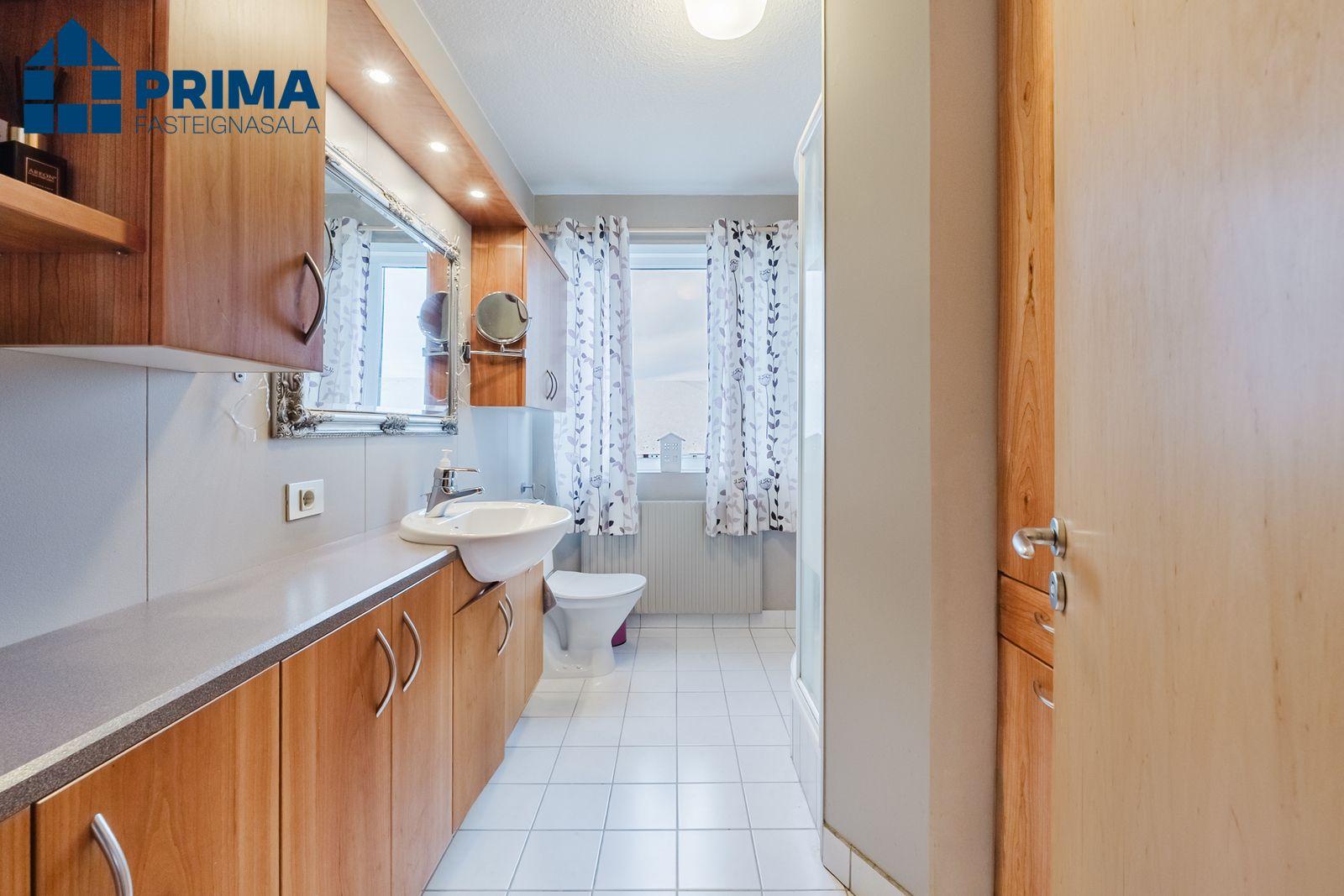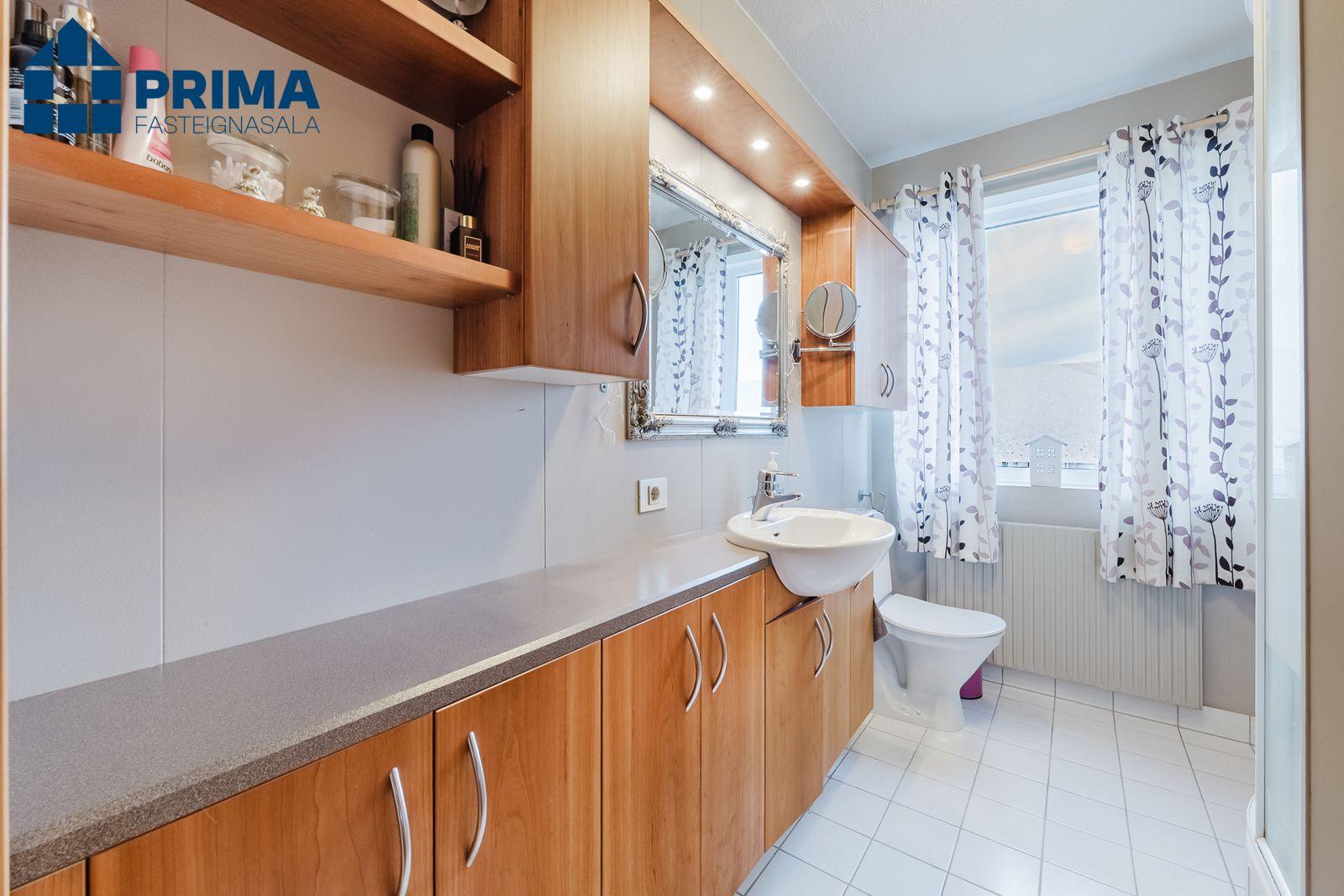 Baðherbergið: Viðar innrétting, Sturtuklefi. Flísar á gólfi og á huta veggjar. Aðstaða fyrir þvottavél og þurrkara inn á baðherbergi.
