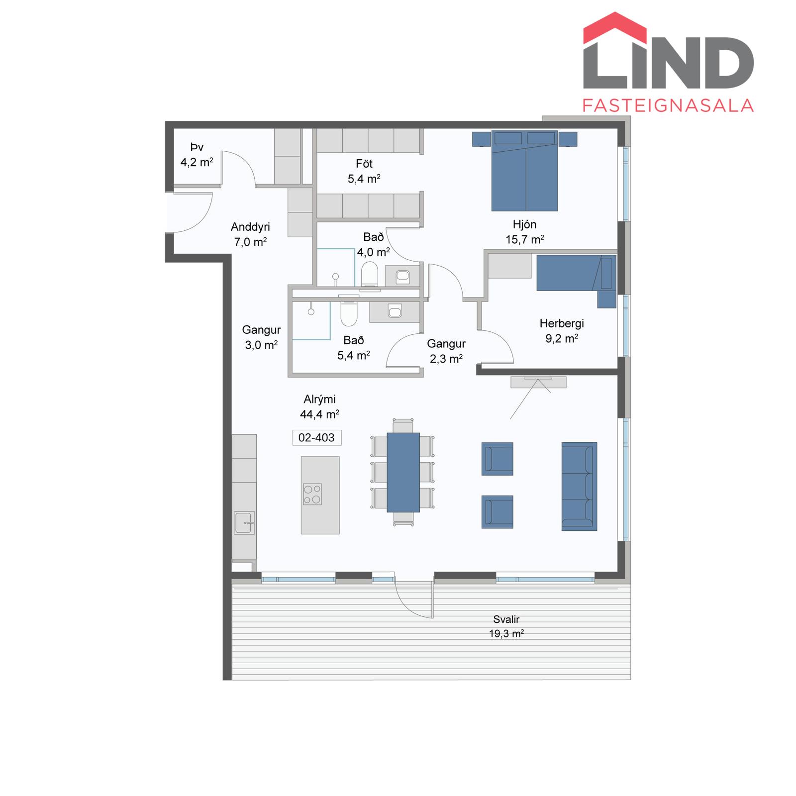 Nánari lýsing: Íbúðin skiptist í forstofu, gang, eldhús í alrými með eyju sem er opið við stofu/borðstofu, 2 svefnherbergi (þar af er hjónasvíta með sér baðherbergi og fataherbergi), 2 baðherbergi, fataherbergi og þvottaherbergi. Útgengi á svalir til suðurs frá stofu.