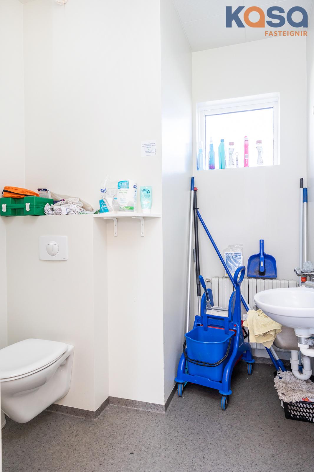 Eignin skiptist í afgreiðslu, skrifstofu & lager/bakrými ásamt geymslum í kjallara hússins. Í sameign á hæðinni er gangur, kaffistofa, salerni og starfsmanna inngangur. Verslunarrýmið, skrifstofan og bakrými er skráð 96,4 fm og geymslur 113,9 fm. Gluggar eru á geymslu í kjallara. Veggir í verslunarrýminu eru léttir og því lítið mál að breyta innra skipulagi eignarinnar.