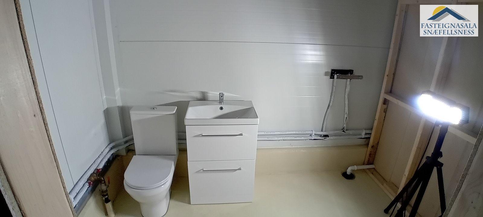 Eignin verður afhent með fullbúnu baðherbergi sem verið er að ganga frá. Þá er möguleiki á að koma upp eldunaraðstöðu í húsnæðinu.