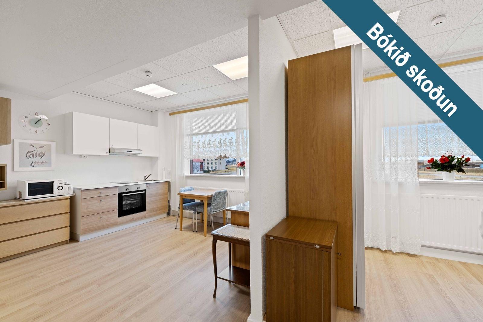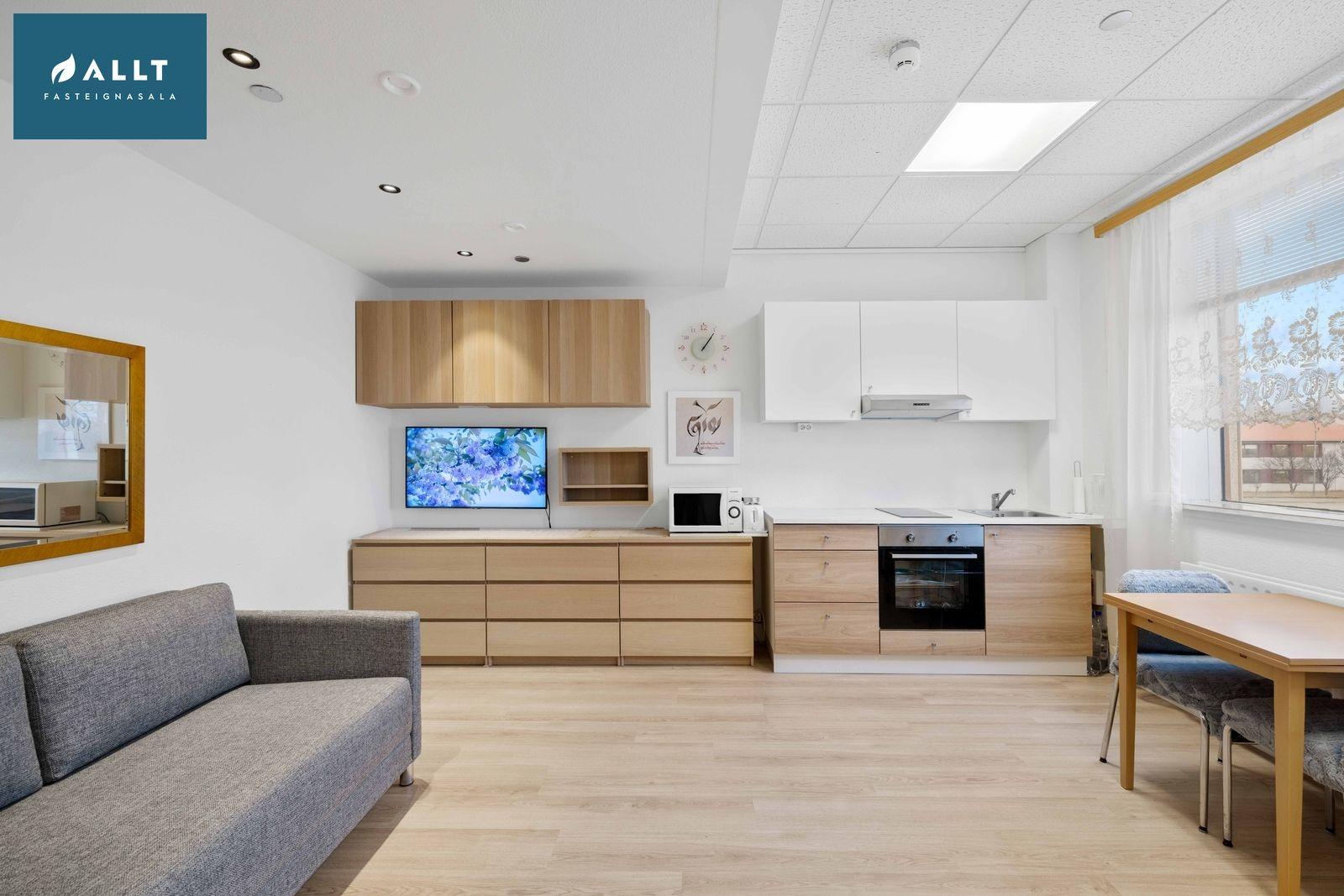 Eignin er virkilega sæt og kjörin til fyrstu kaupa eða sem fjárfestingartækifæri til útleigu. Eignin hefur alrými með eldhúsinnréttingu, stofu og borðstofu. Forstofa er með opnum klæðaskáp, þaðan er svefnherbergisskot og gott baðherbergi með baðkari. Aðstaða fyrir þvottavél og þurrkara er við forstofu. Sér geymsla fylgir íbúðinni í sameign.