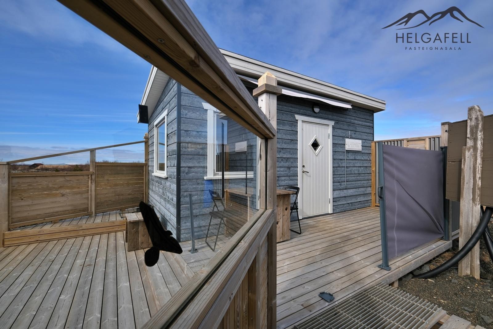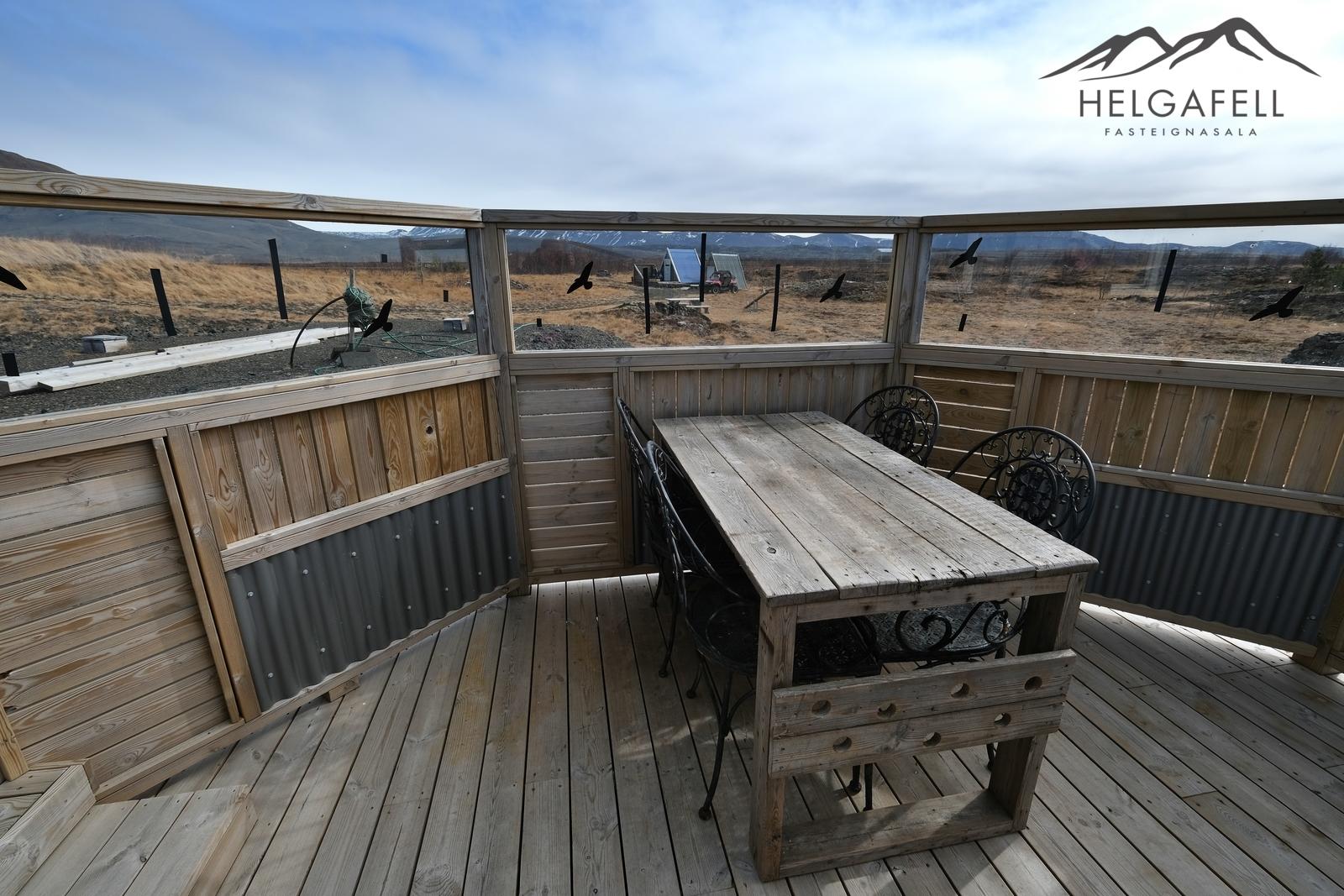 Sumarhúsið sem er 14,9 fm er með skolplagnir. Rotþró komin. Aðal rafmagnstaflan er í kassa fyrir utan húsið. 3 fasa rafmagn. Selst með öllu helsta innbúi utan persónulegra muna. Nýleg þvottavél og þurrkari. Verðmætaskápur (byssuskápur), borð og skápar eru á hjólum svo gott er að færa ef þarf. Tvær lausar eldunarhellur, airfryer, örbylguofn, ísskápur með frysti, markísa, sér hönnuð útiborð og bekkir.