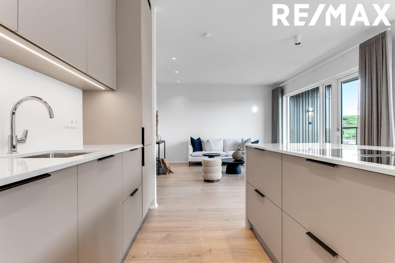 Eldhús: Parket á gólfi, gott skápa- og borðpláss, innréttingin er frá Selós, framhliðar eru matt beige, grábrúnar að lit, borðplötur eru úr 20mm Quartz steini með undirlímdum vaski úr stáli. Eldhústæki eru frá AEG. Innbyggður ísskápur, frystir og uppþvottavél fylgir. Skúffur eru með mjúklokunarbúnaði, og LED lýsing undir efri skápum. Höldur eru svartar grip höldur frá Selós.