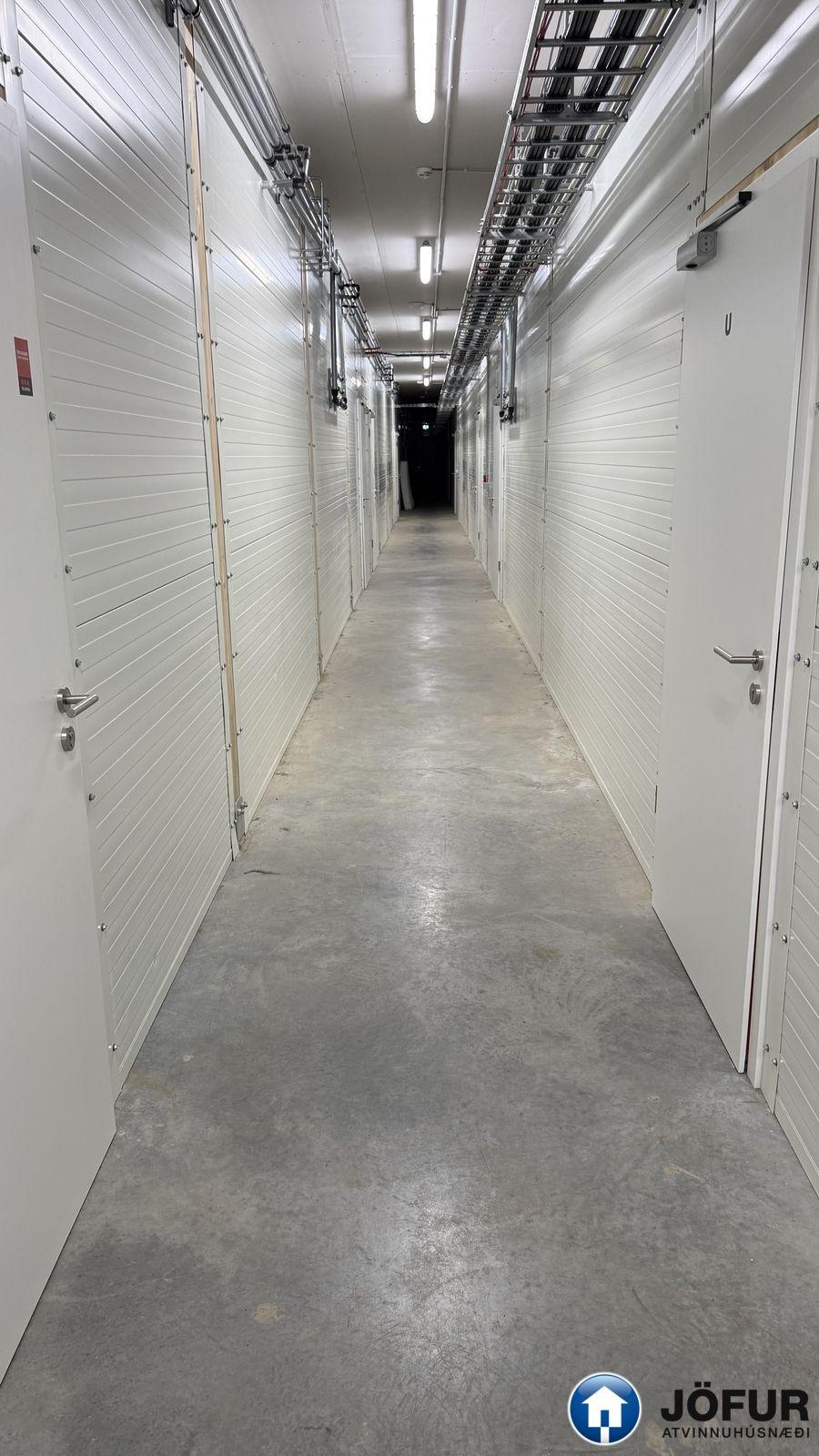 Stór innkeyrsluhurð og inngönguhurð er á rýminu. Mikil lofthæð. Málað gólf. Salerni er á neðri hæð.