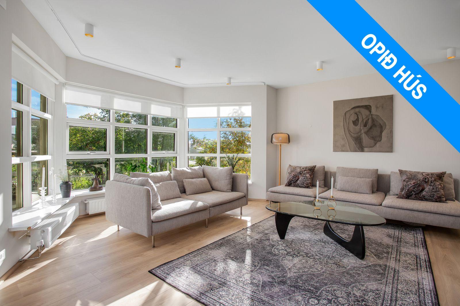 Nánari lýsing. Komið er inn í forstofu með flísum á gólfi og góðum fataskápum. Stór og björt stofa og borðstofa með nýlegu parketi á gólfi og gluggum á þrjá vegu. Gert ráð fyrir arin í stofu. Út frá stofu eru stórar skjólgóðar flísalagðar suðursvalir. Sérlega fallegt opið eldhús með fallegri IKEA innréttingu og dúk á gólfi. Þvottahús er við hlið eldhúss með flísum á gólfi og niðurfalli í gólfi.