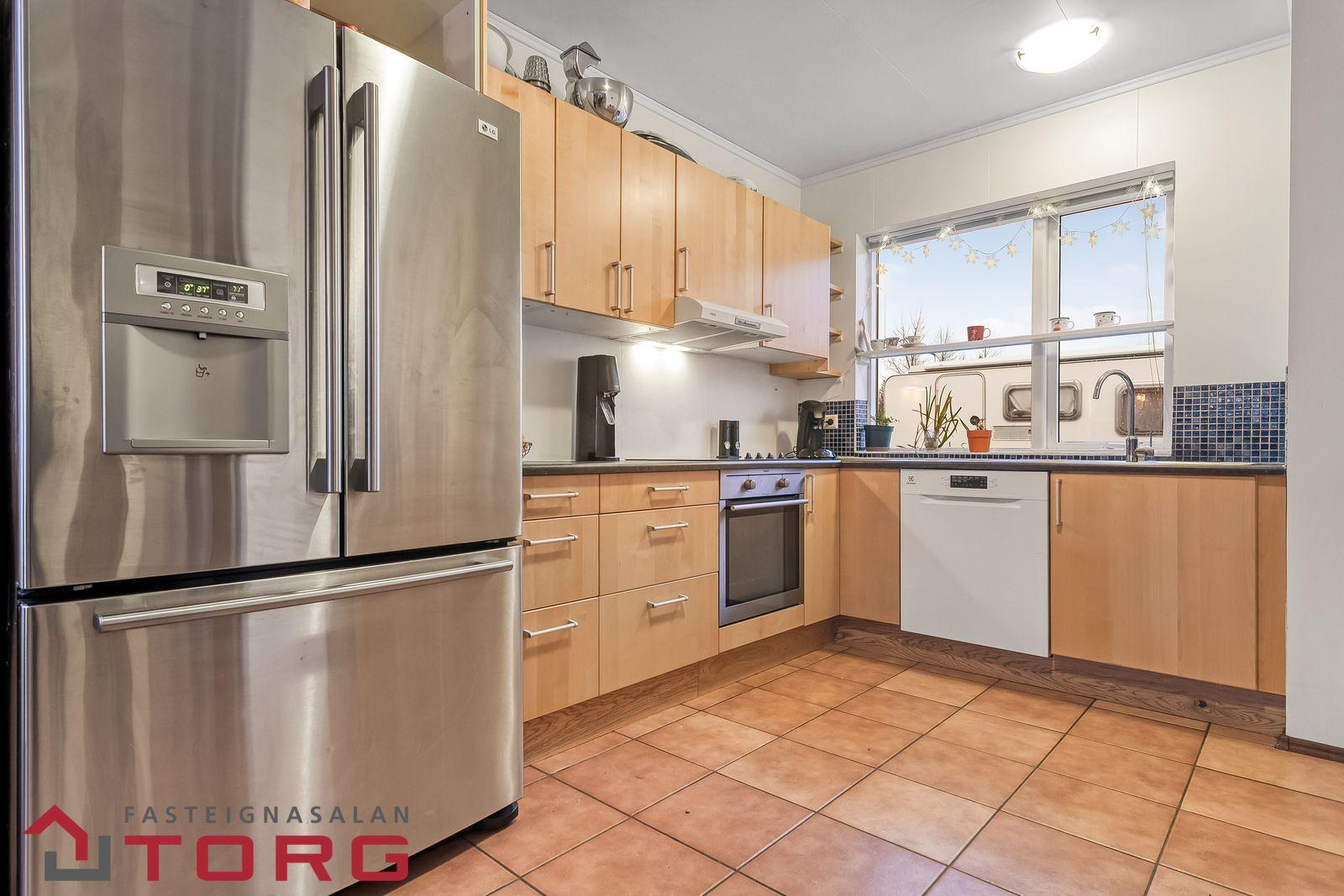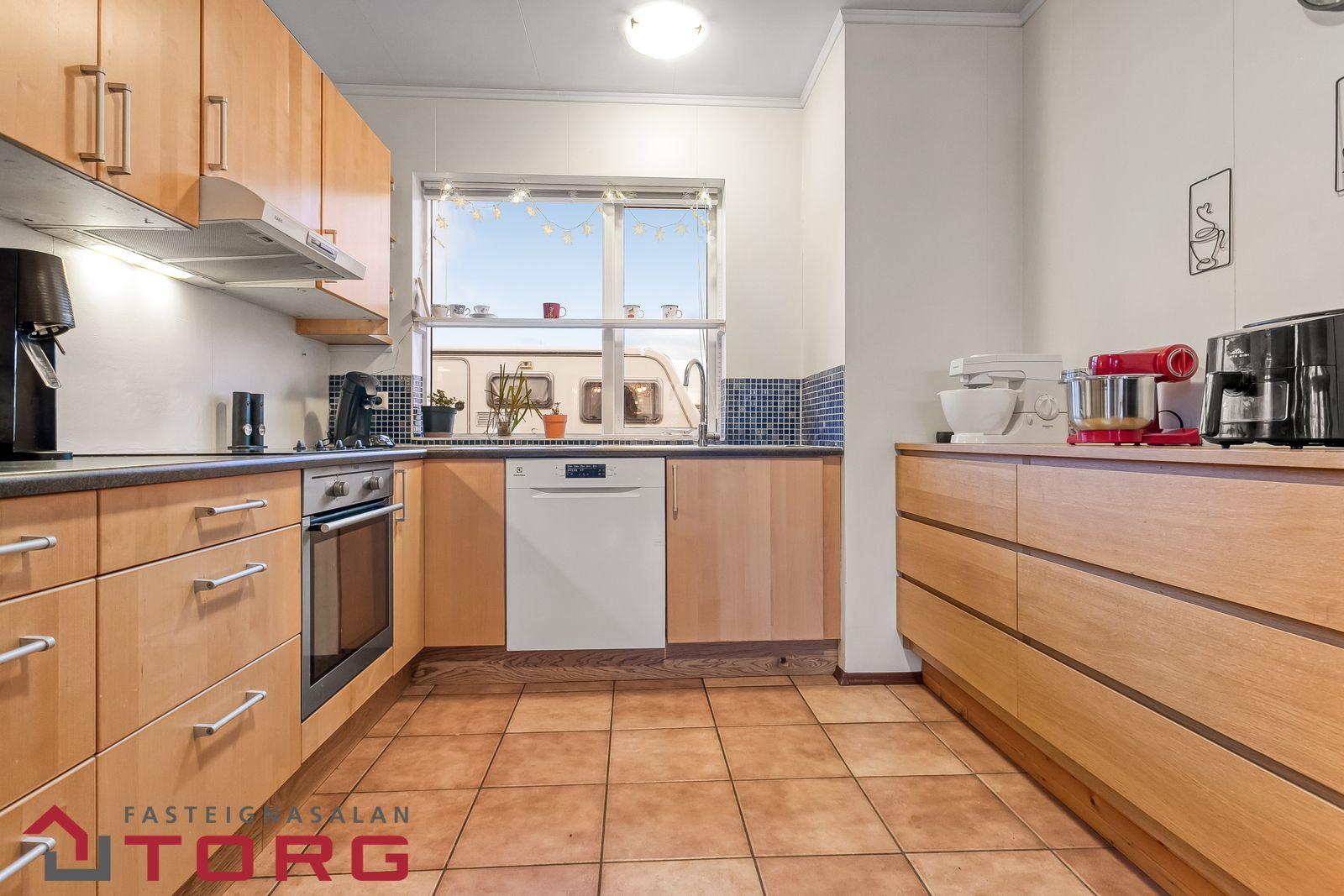 Eldhús. Viðarinnrétting með góðu hirsluplássi. Helluborð, loftgleypir, bakaraofn í vinnuhæð. Tæki frá AEG. Tengi fyrir uppþvottavél. Gluggar fyrir ofan vask. Mósaikflísar í kringum vaskinn. Ísskápur má fylgja með.