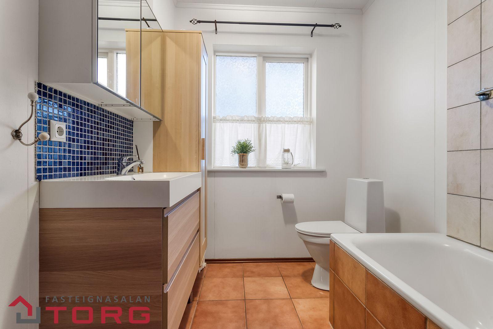 Baðherbergi. Gott baðherbergi með glugga. Salerni, Baðkar með sturtu, viðarinnrétting. Flísar á gólfi og fyrir ofan baðkar.