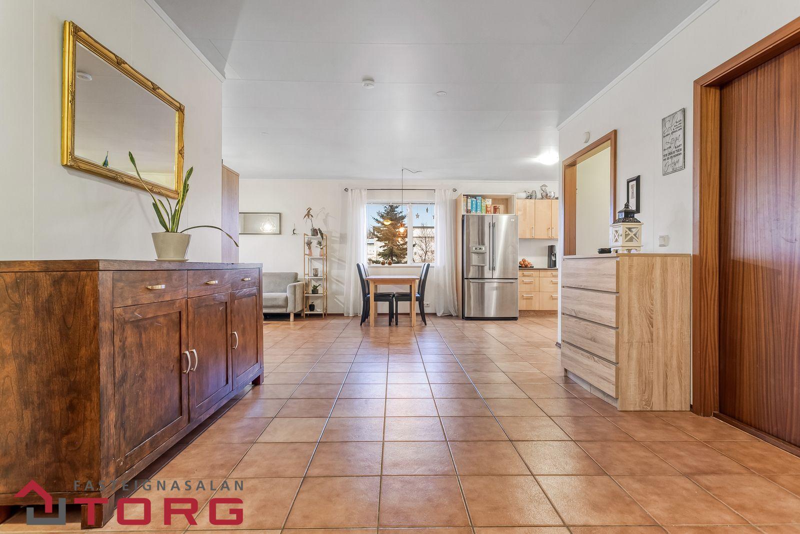 Alrými. Flísar á gólfi. Stórt, bjart og mikið rými með miklum möguleikum. Stofa, borðstofa, eldhús.