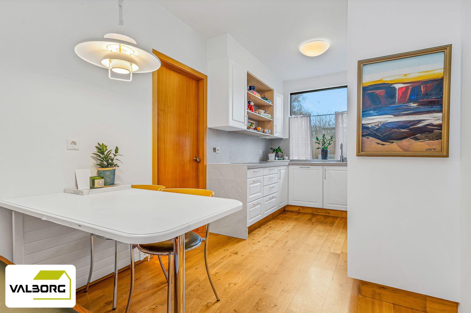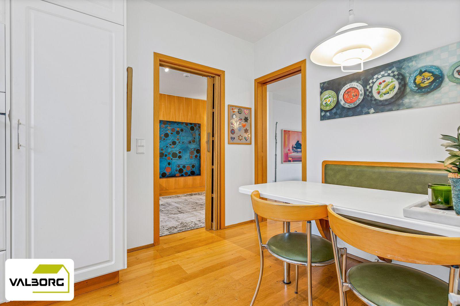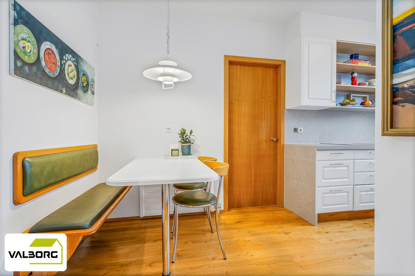 Eldhús: Falleg hvít innrétting með innbyggðum ísskáp og ofni í vinnuhæð. Góður borðkrókur og parket á gólfi.