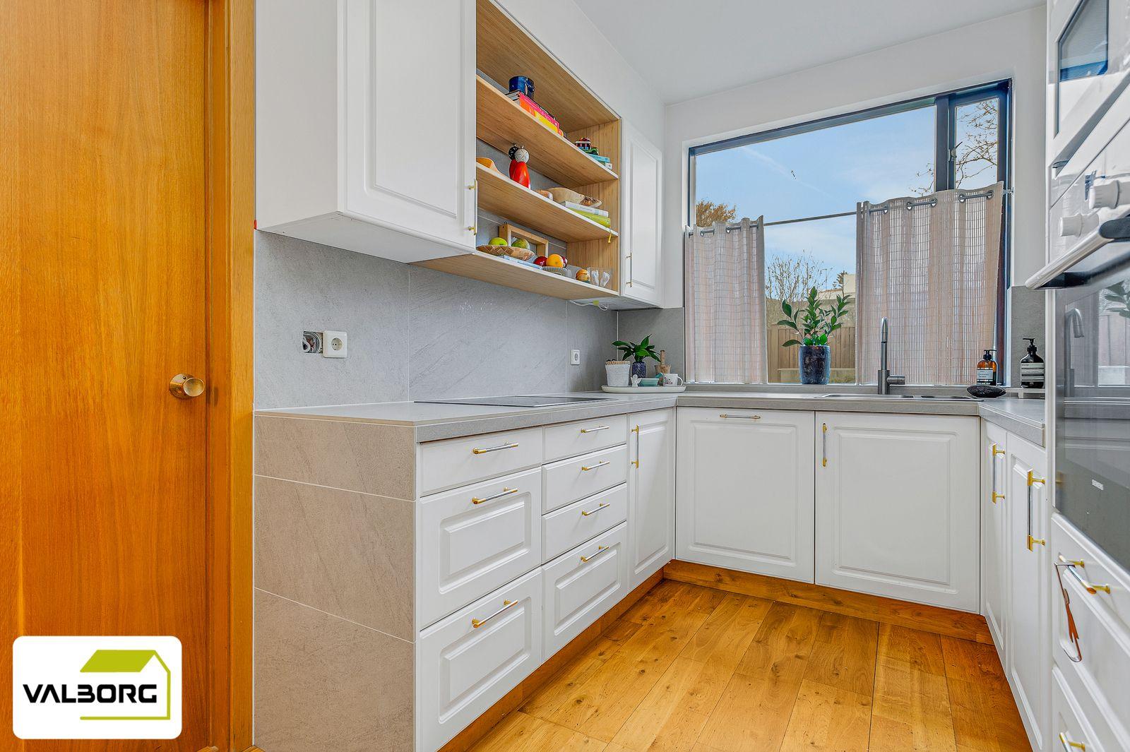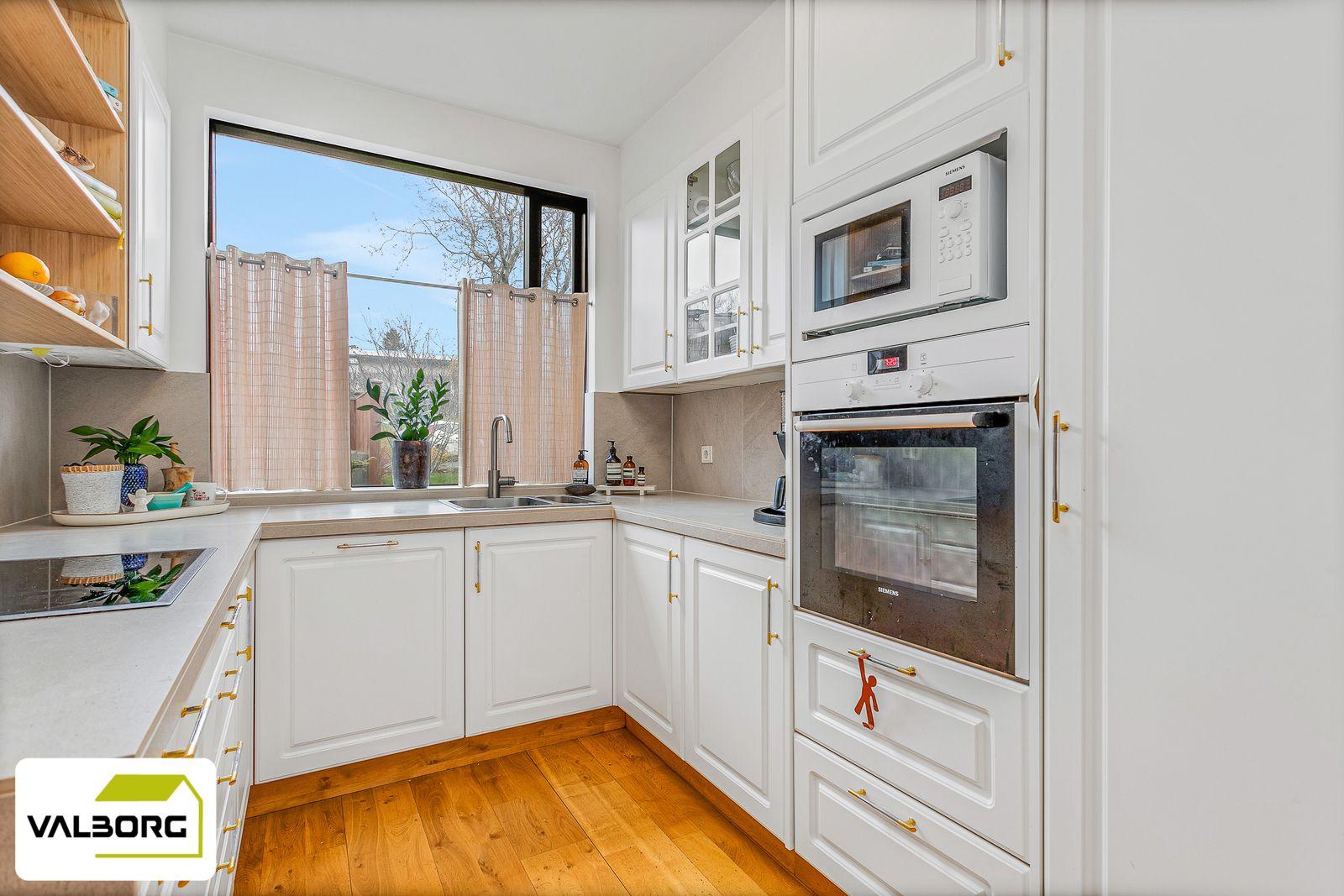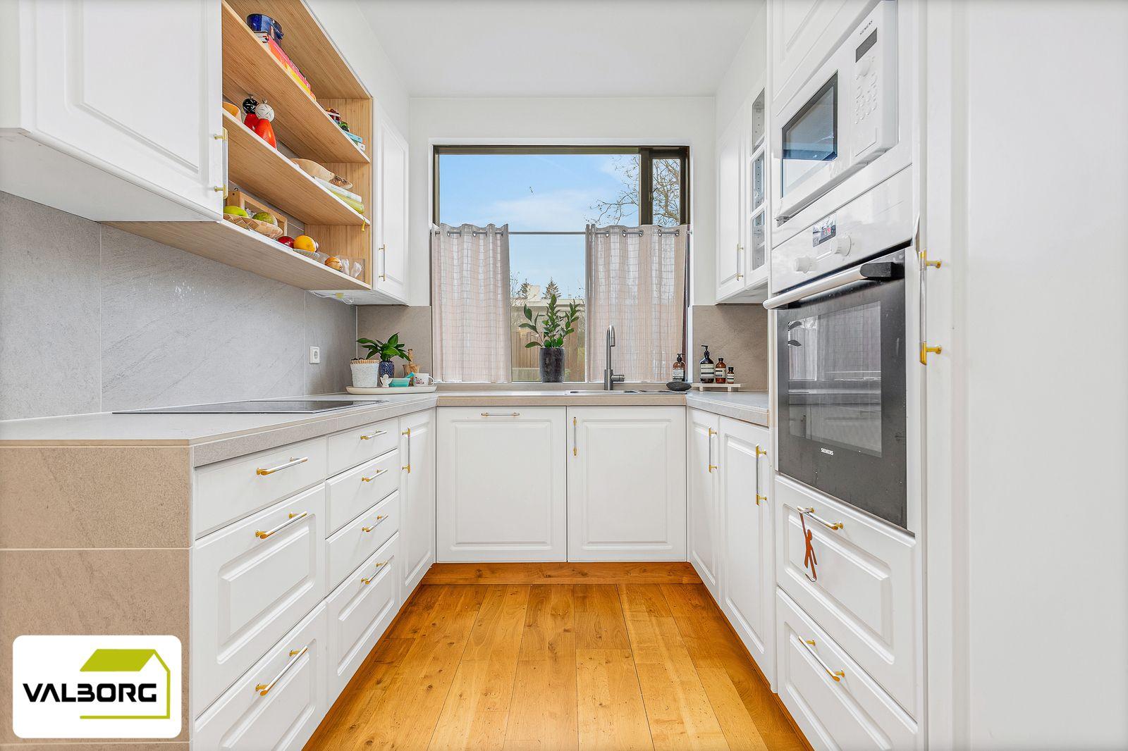 Eldhús: Falleg hvít innrétting með innbyggðum ísskáp og ofni í vinnuhæð. Góður borðkrókur og parket á gólfi.