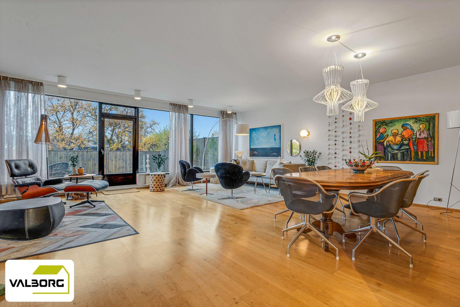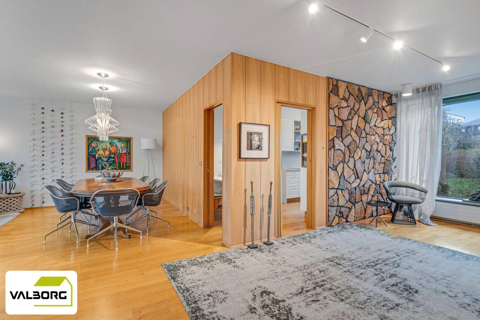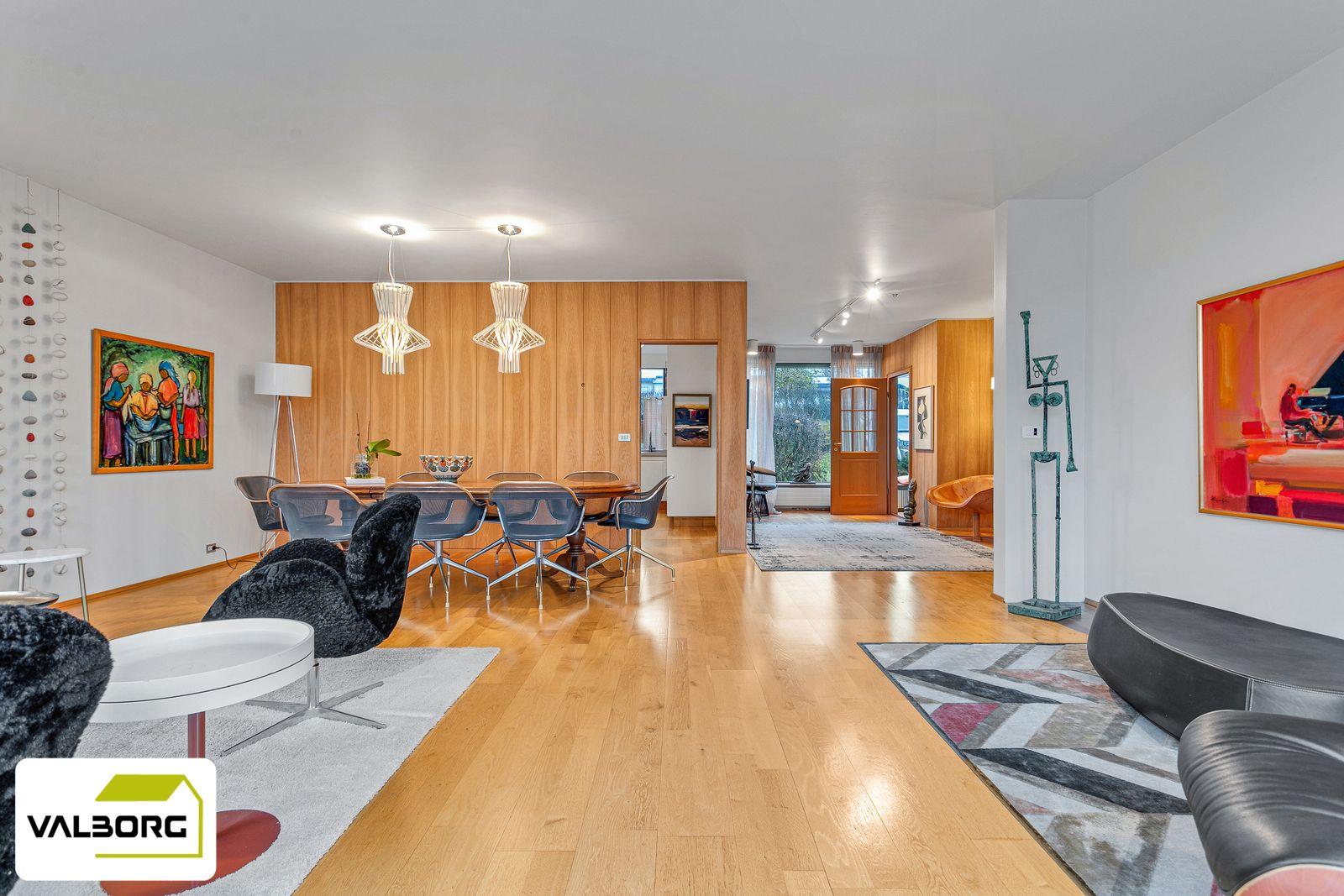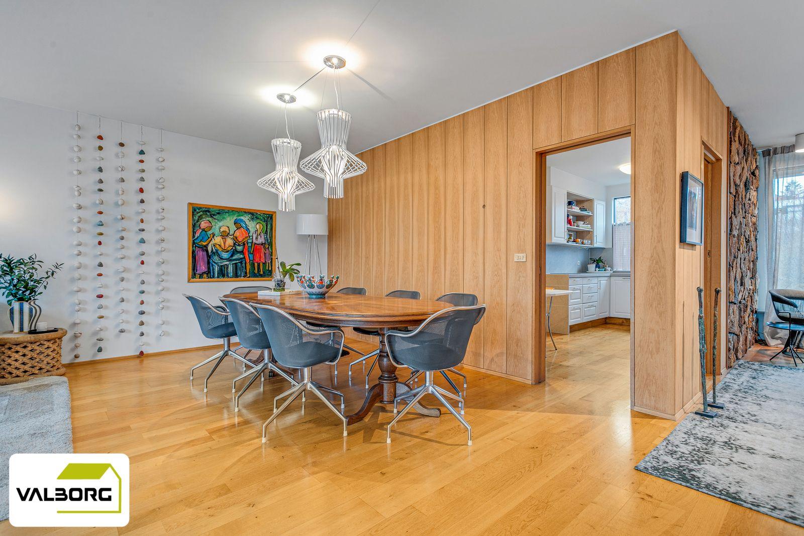 Stofa/borðstofa: Mjög rúmgóð og björt með stórum gluggum og útgengi í glæsilegan, gróinn suðurgarð með sólpöllum og skjólveggjum.
