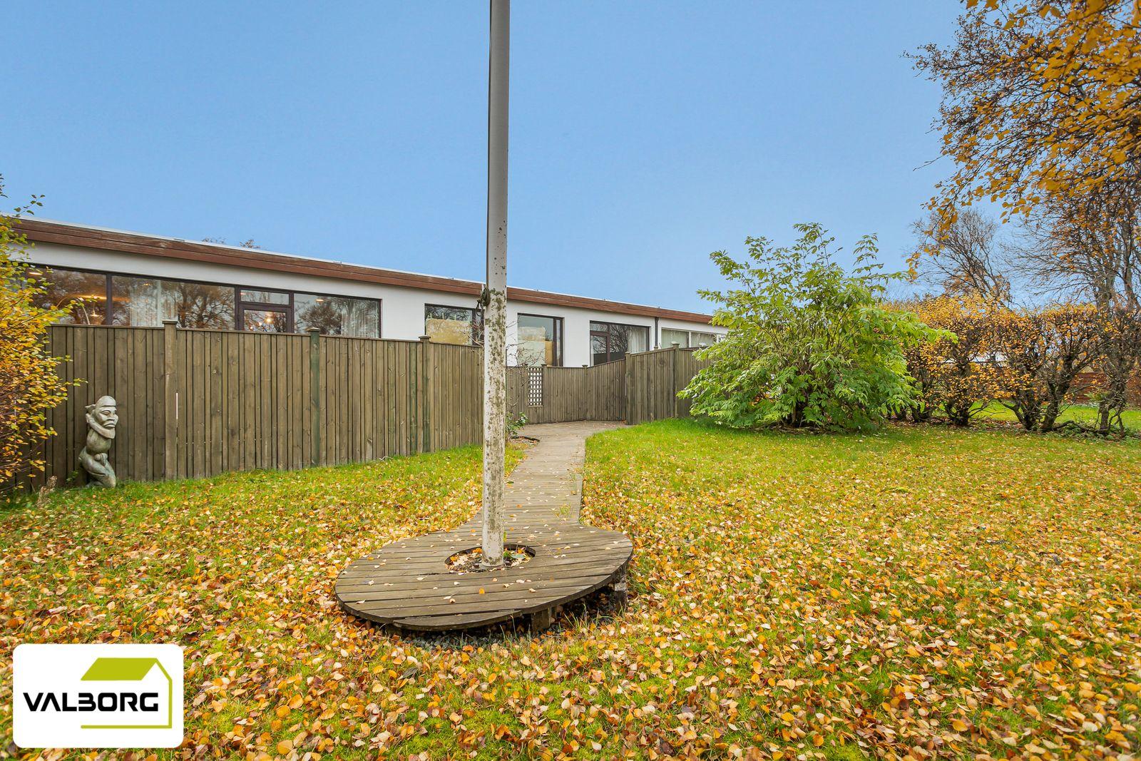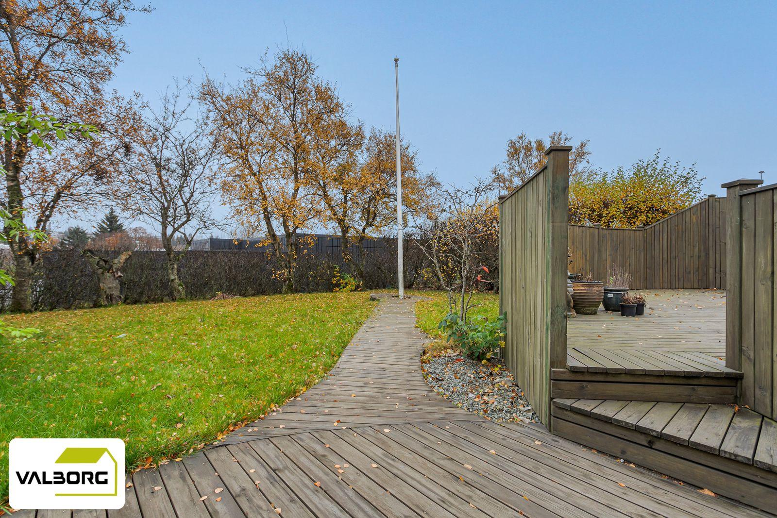 Fallegur og vel gróinn garður með sólpöllum og skjólveggjum. Snjóbræðsla í innkeyrslu.