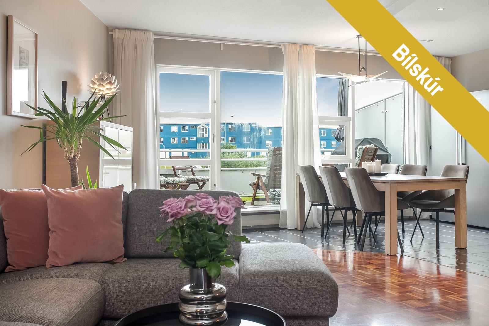 Nánari lýsing: Inngangur/hol: Komið inn á gang með flísum. Þvottahús: Mjög rúmgott, nýtt bæði sem geymsla og þvottahús. Innaf ganginum. Flísar á gólfi Svefnherbergi: Bjart herbergi með flottu útsýni. Parketlagt gólf. Svefnherbergi: Bjart herbergi með flottu útsýni, fataskápur, parketlagt gólf. Hjónaherbergi: Bjart herbergi með flottu útsýni, fataskápur, parketlagt gólf. Stofa/borðstofa: Stórt rými sem er opið með eldhúsi, gengið út á stórar suðursvalir. Parketlagt gólf. Eldhús: Opið með stofu, hvít innrétting með bakaraofn og eldavél. Flísalagt gólf. Baðherbergi: Baðkar með sturtu hengi, salerni, innrétting með stórri handlaug með tveimur blöndunartækjum. Þvottahús: Innaf ganginum, tengi fyrir þvottavél og þurrkara. Bílskúr: 26 fermetrar