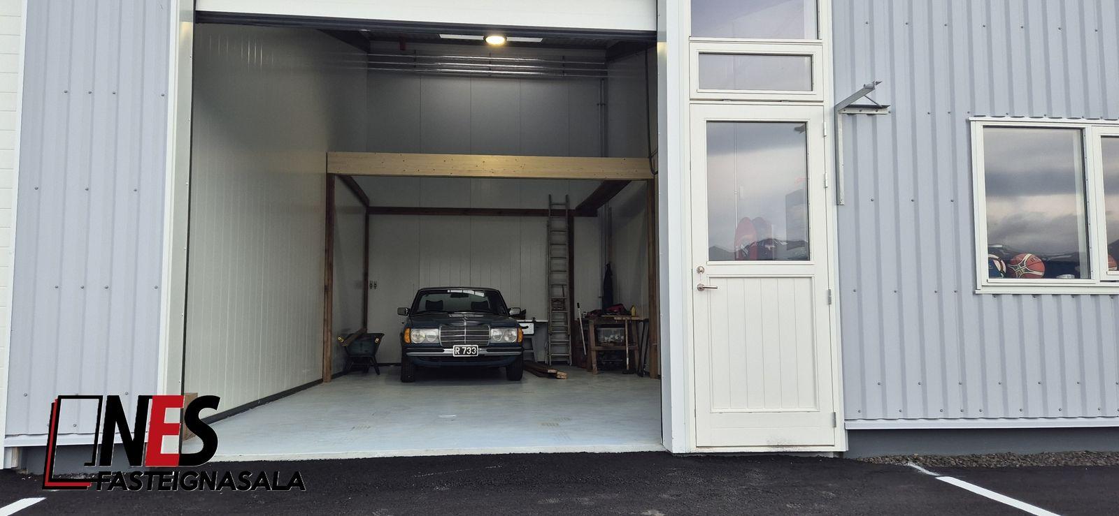 Stór rafdrifinn hurð með fjarstýringu og göngu hurð. Hiti í gólfi. Stútar fyrir klósett og ræstivask. Túða upp úr þaki til að tengja loftræstingu frá baðherbergi. Niðurföll fyrir innan og utan hurð. Rafmagnsmælir er fyrir hvert bil. Lóð er fullfrágengin með malbikuðu plani.