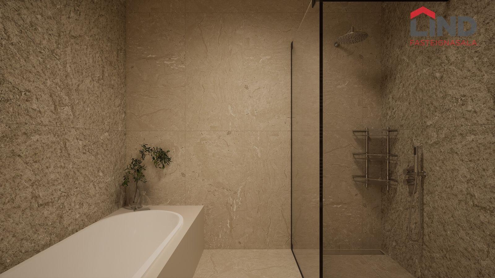 Baðherbergi: Flísar á gólfi og vegg að hluta. Rúmgóð sturta með sturtu gleri ásamt baðkari. Innrétting frá Selós. Borðplötur eru sér smíðaðar úr Dekton stein 20mm þykkar með undirlímdum vaski.