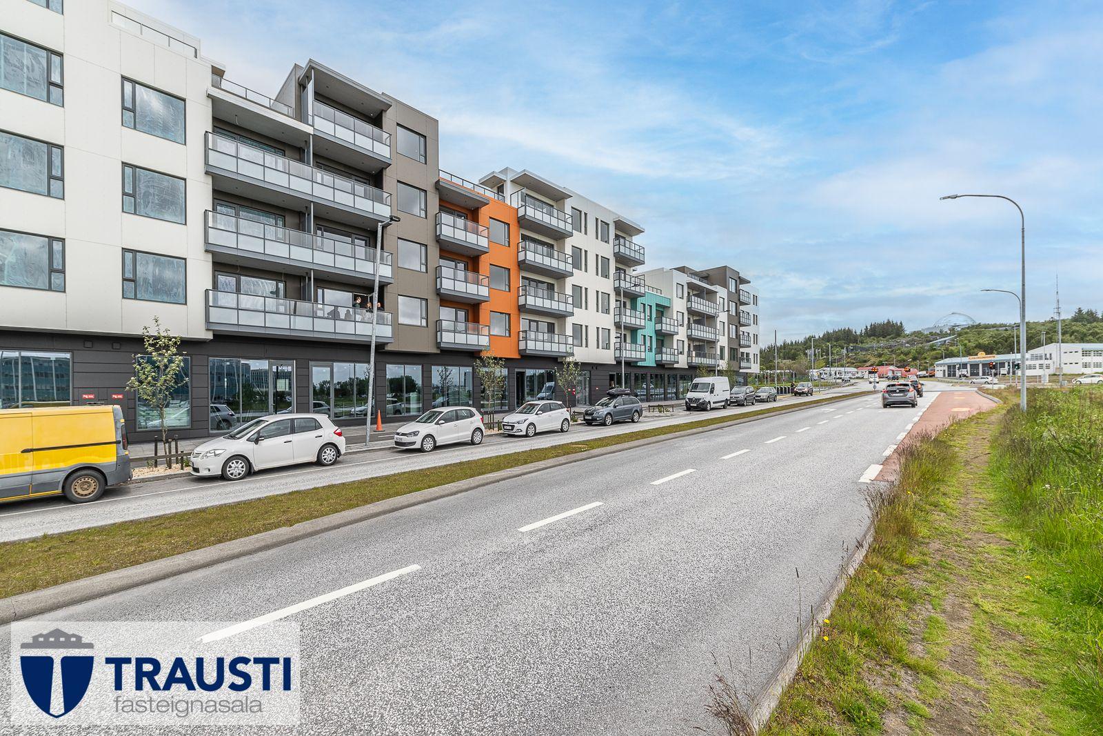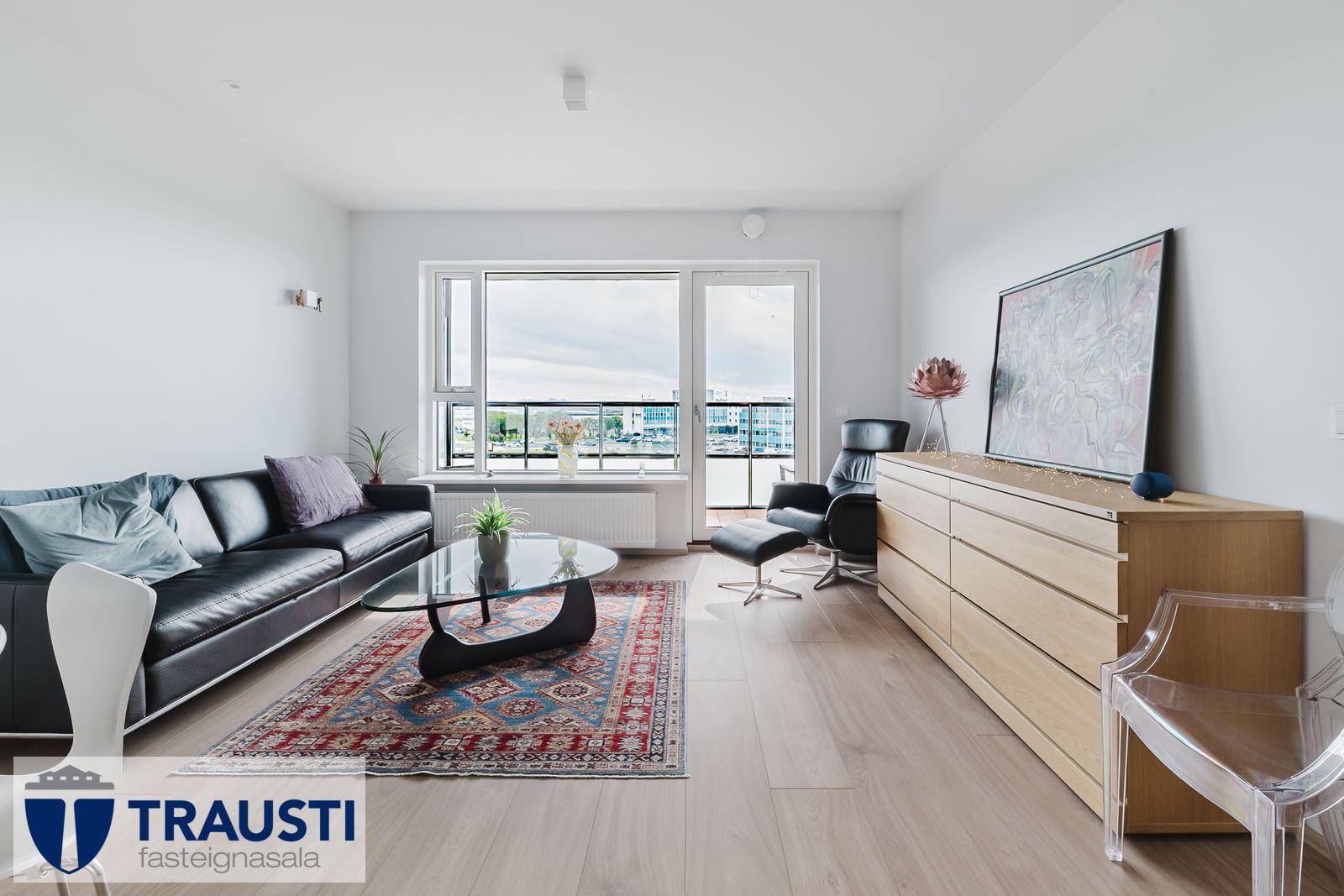 Nánari lýsing eignar: Þegar komið er upp á fjórðu hæð er sérinngangur inn í íbúðina eftir löngum gangi með útsýni yfir garðinn en þessi íbúð er ein með aðgang að ganginum. Forstofa með flísum á gólfi og yfirhafnaskáp. Úr forstofu er gengið út á 37,4 fm þaksvalir þar sem hægt er að koma fyrir heitum potti. Stofa og opið eldhús, hvít innrétting með eyju. Gengið er út á suður svalir frá stofu/eldhúsi Rúmgóð þrjú svefnherbergi, með fataskáp. Baðherbergi með sturtu, ljósri innréttingu, handlaug og upphengdu salerni og handklæðaofn. Sér þvottahús með flísum á gólfi. Geymsla í kjallara, innan bílskúrs 11,6 fm Bílskúr með stálvaski, 48,7 fm Bílastæði í lokuðu bílastæðahúsi, fyrir fram skúr nr. B21 Stór og fallegur garður er í miðju bygginganna með leiktækjum fyrir börn.