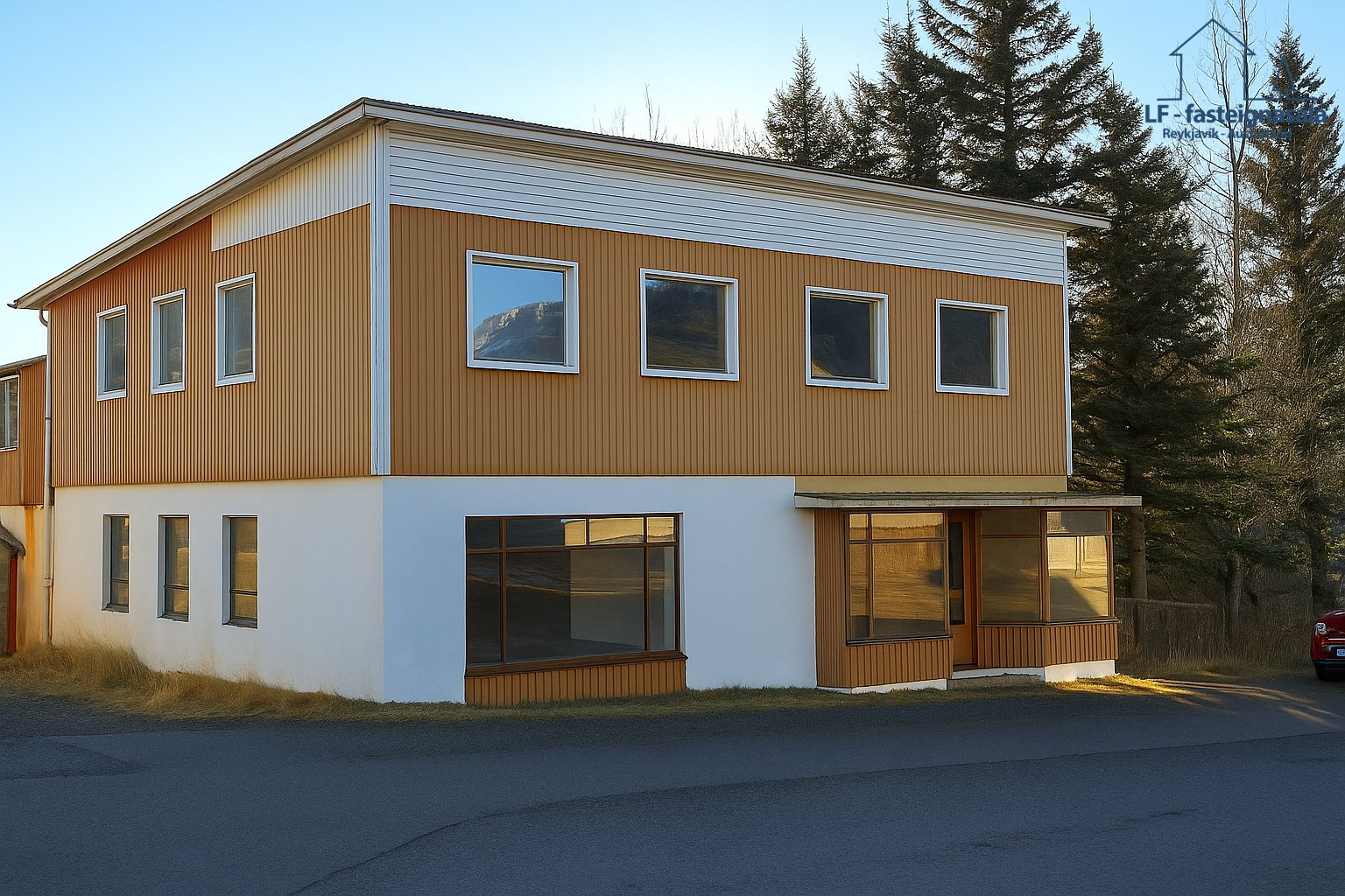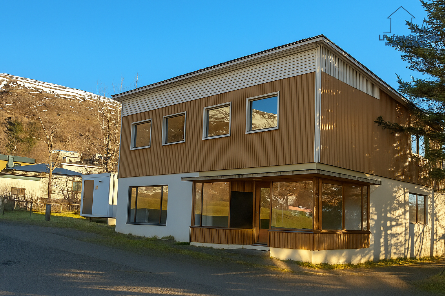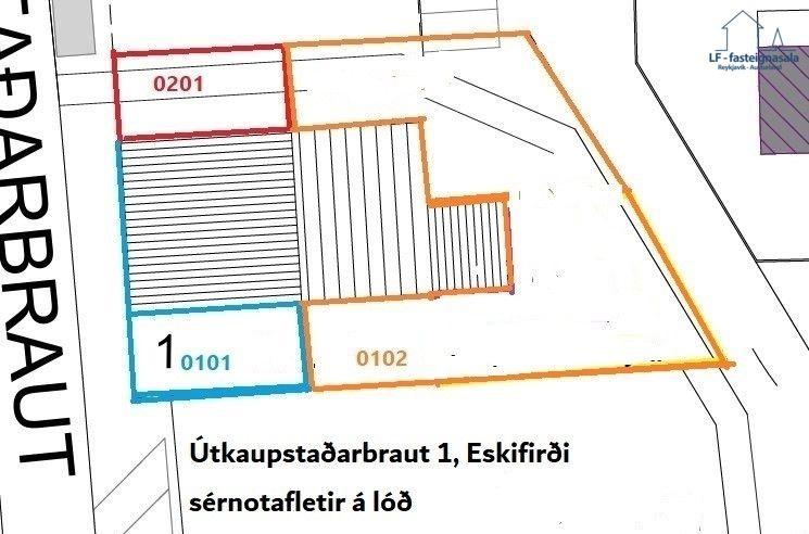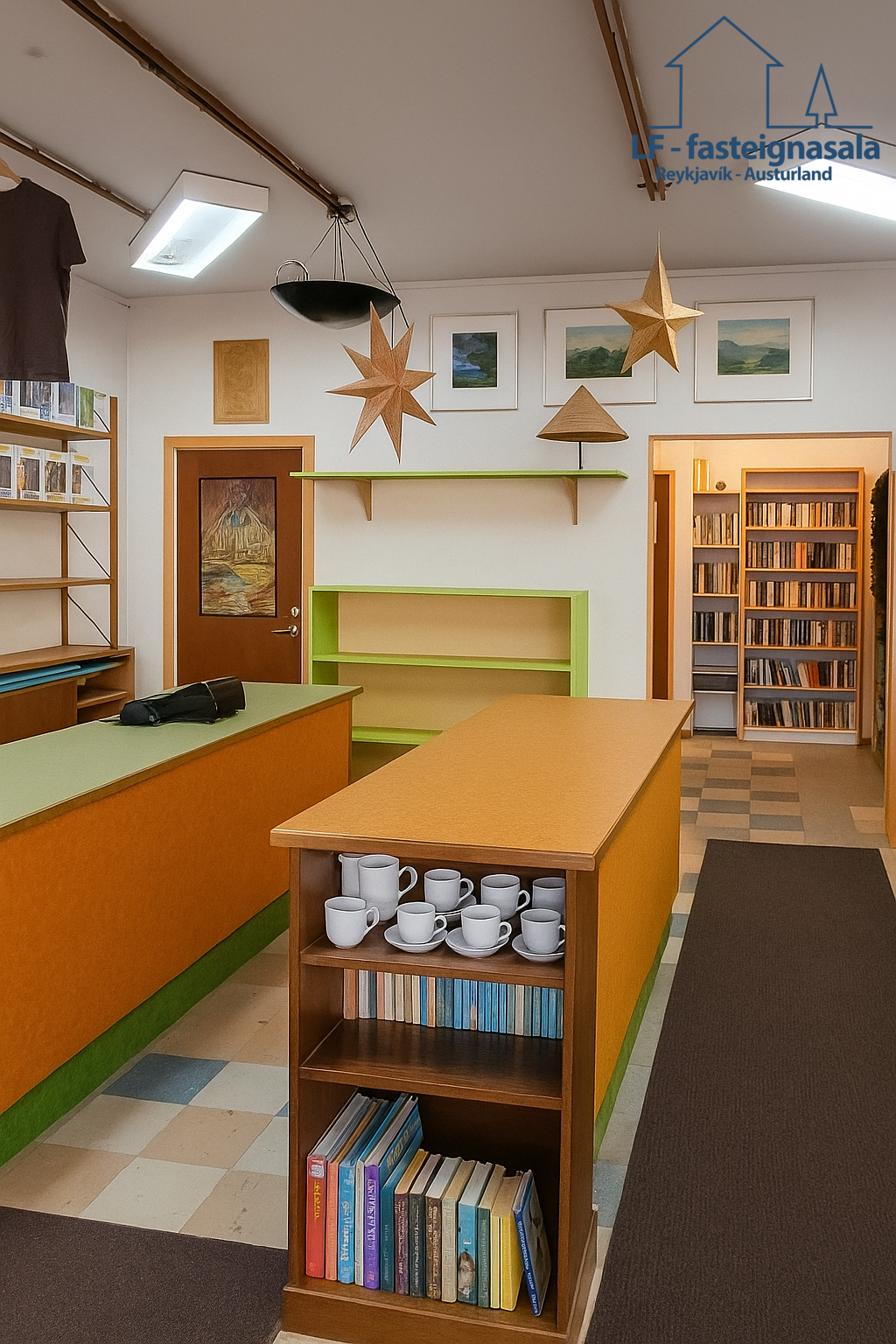 Lf-fasteignasala/Lindin fasteignir s. 893-1319 og Þórdís Pála Reynisdóttir löggiltur fasteignasali thordis@lindinfasteignir.is kynna: Útkaupstaðarbraut 1 neðri hæð, vesturendi, Eskifirði. Um er að ræða eignarhluta í steinsteyptri neðri hæð hússins. Stærð eignarinnar er 107 fermetrar. Húsið var byggt sem verslunarhúsnæði og hefur lengst af hýst verslun. Eignaskiptasamningur er í þinglýsingarferli og er húsinu með honum skipt í 3 fasteignir. Verslunarrýmið sem hér um ræðir og íbúð fyrir ofan það ásamt eignarhluta á 2 hæðum í austurhluta hússins og því rými fylgir viðbygging á einni hæð. Gengið er upp eitt þrep frá götu inn í nokkuð stórt rými sem er í dag tvískipt með léttum vegg sem auðvelt er að fjarlægja. Hluti af þessu rými er stórt herbergi með breiðum opnum dyrum (gráar vinilflísar á gólfi og bókahillur). Inn af rýminu er í dag salerni og lítill gangur sem er stúkaður af með léttum vegg sem auðvelt er að fjarlægja, úr þessum litla gangi eru einnig dyraop sem í dag er lokað með plötu ínn í herbergið sem er nefnt hér fyrir ofan. Norðan megin við létta vegginn í stóra rýminu var skrifstofa og úr henni eru dyr inn í bakherbergi sem er handan við létta vegginn sem stúkar áður nefndan lítinn gang af. Við hlið þess rýmis er rúmgott geymsluherbergi með hillum. Löng og mjó geymsla er við hlið létta veggsins sem skiptir stóra rýminu í tvennt í dag. Gamalt vatnsinntak er í þessari geymslu. Hitaveita er í húsinu og er hún í dag sameiginlega fyrir þetta rými og íbúðina fyrir ofan en austurendinn er með sér hita. Verslunargluggarnir á vestur hlið hússins og á SV horninu eru úr tekki. Í flestum rúðum er mjög þykkt einfalt gler en a.m.k. ein stór rúða er með tvöföldu gleri. Gólfefni eru upprunalegar linoleum- og vinilflísar. Gluggar á norðurhlið eru lokaðir af að innanverðu og eru orðnir mjög lélegir. Rýmið býður upp á ýmsa skemmtilega notkun og er húsið mjög vel staðsett fyrir verslun og eða kaffihús eða veitingastað t.d. Einngi væri hægt að gera glæsilega íbúð með mikilli lofthæð í rýminu en seljandi kýs frekar að selja einhverjum sem hyggir á atvinnustarfssemi í húsinu en skoðar auðvitað öll tilboð.