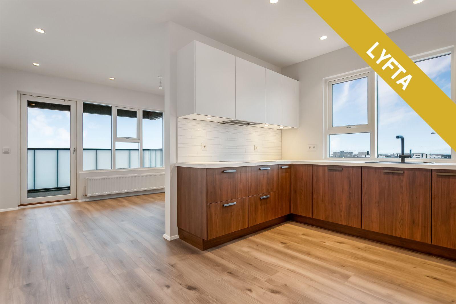 Nánari lýsing: Forstofa: Skápur, flísalagt. Eldhús: Hvít innrétting frá GKS. Ofn í vinnuhæð, vifta. Span helluborð, innbyggður kælir og frystir og uppþvottavél. Tæki frá AEG. Innbyggð lýsing undir efri skápum. Parket á gólfi. Stofa , borðstofa og eldhús mynda opið rými. Parket á gólfi. Útgengt út á hellulagðan sérafnotareit. Svefnherbergi: Fataskápur. Parket á gólfi Hjónaherbergi: Fataskápar. Parket á gólfi Baðherbergi: Innrétting með handlaug. Speglaskápur. Upphengt salerni. Sturta með sturtugleri.Handklæðaofn. Ljósar flísar á gólfi og veggjum.
