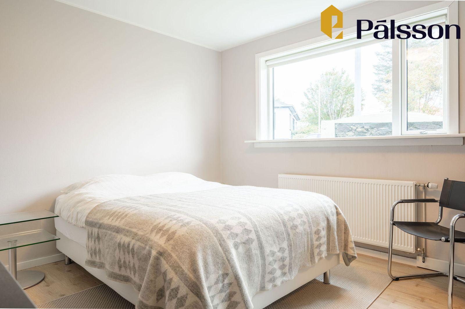 Tvö svefnherbergi, annað rúmgott en hitt minna. Fataskápar í báðum herbergjum. Harðparket á gólfum.
