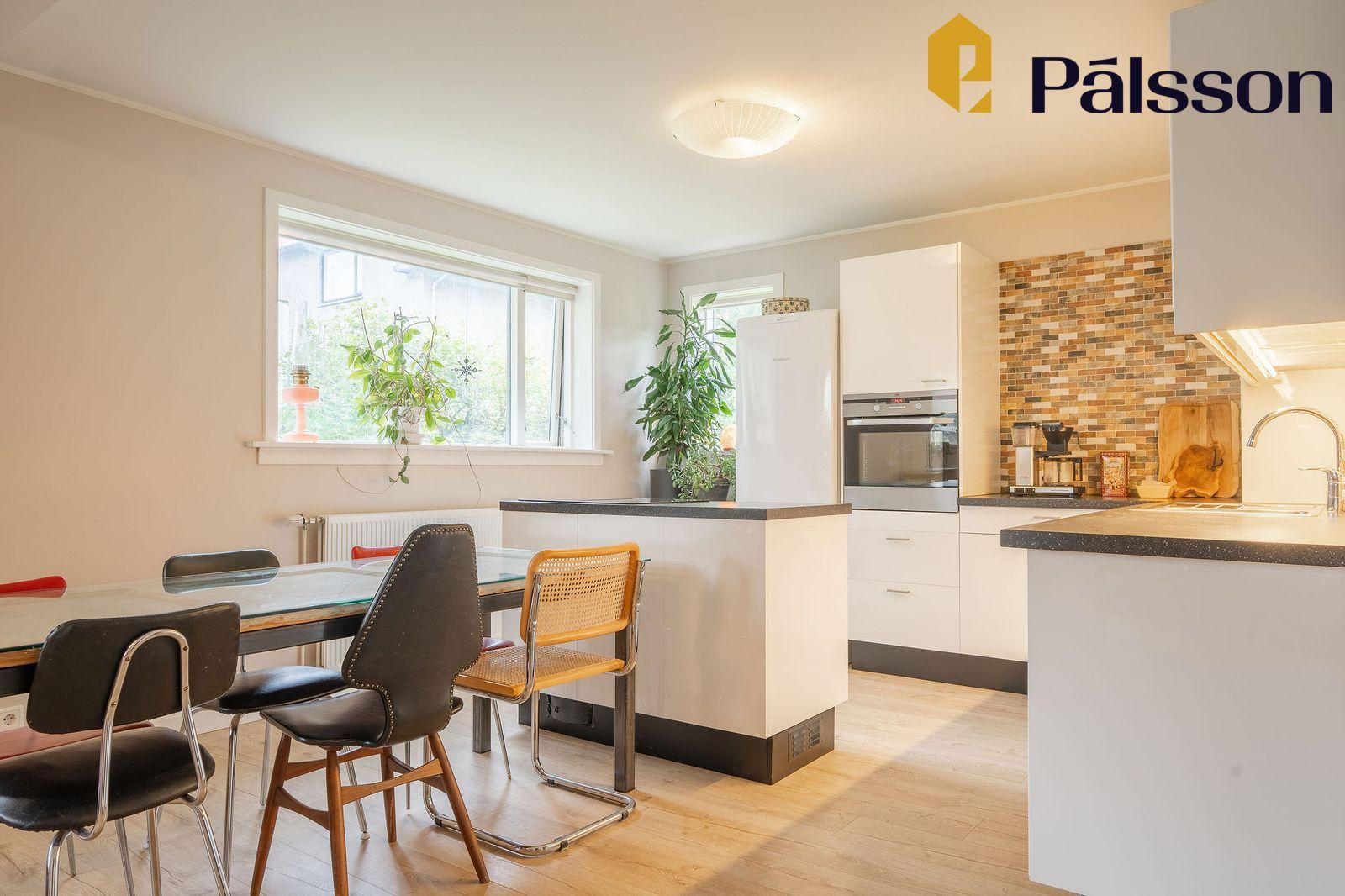 borðstofa eru saman í einu opnu björtu rými. Hvít háglans eldhúsinnrétting með dökkri borðplötu. Flísalagðir veggir milli efri og neðri skápa. Spanhelluborð á eyju og ágæt vinnuaðstaða. Harðparket á gólfi.