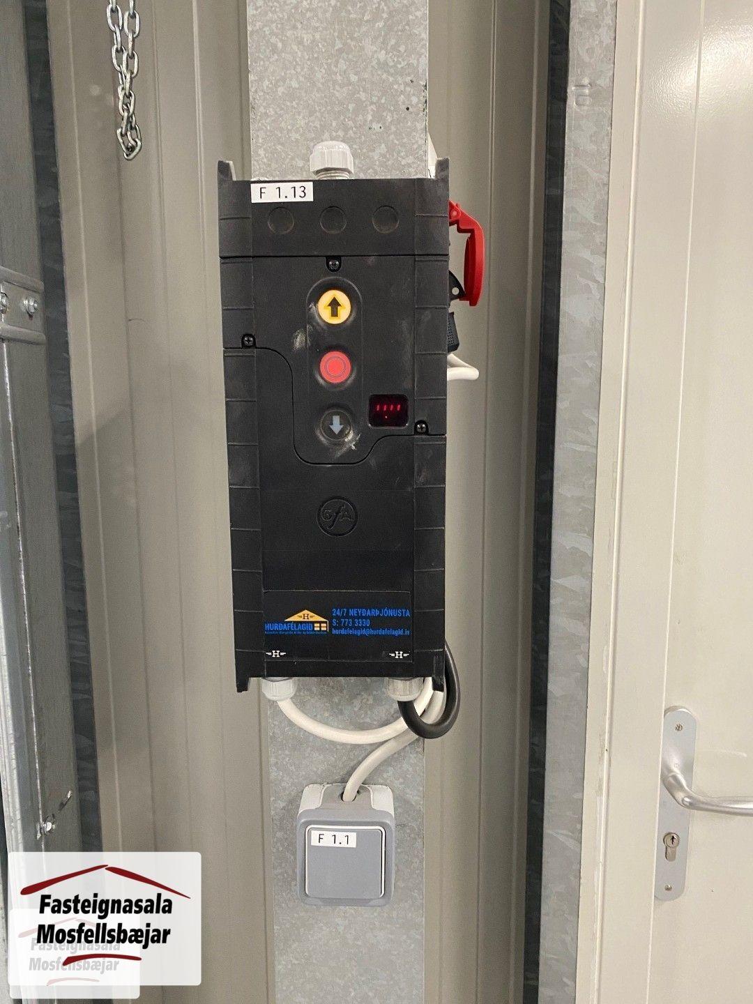 Innkeyrsluhurð er 3,5 m breidd x 3,5 m hæð, með rafdrifnum hurðaopnara.