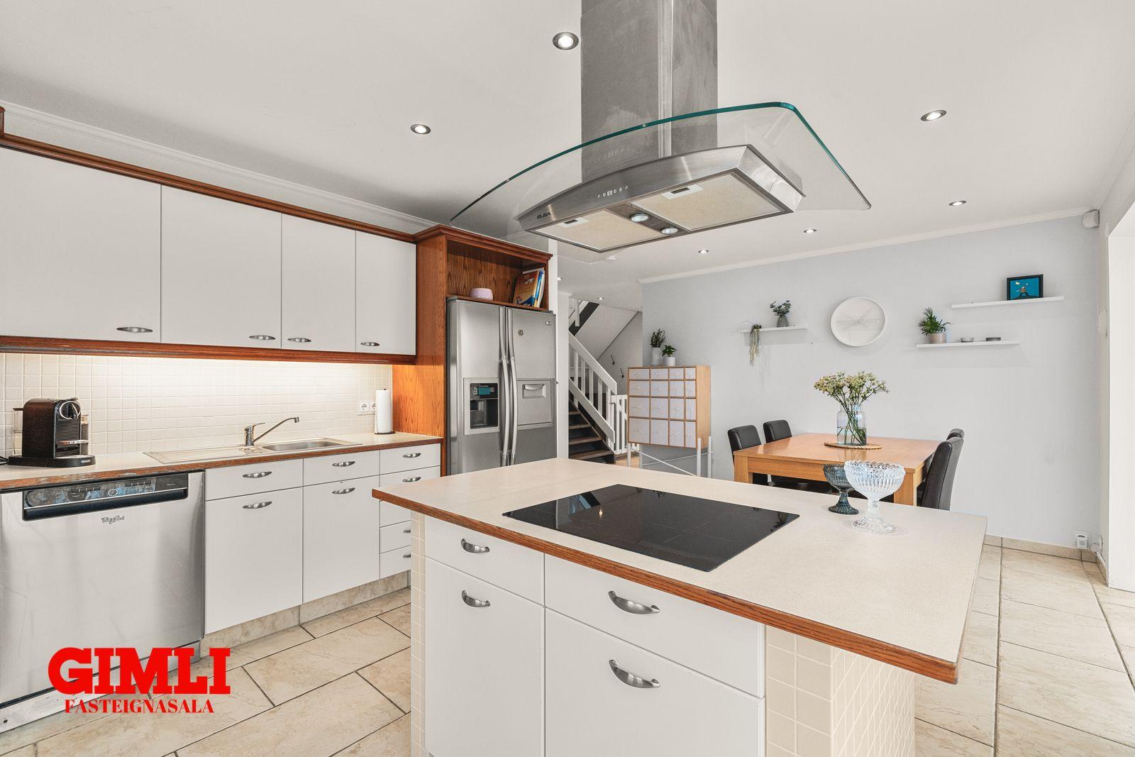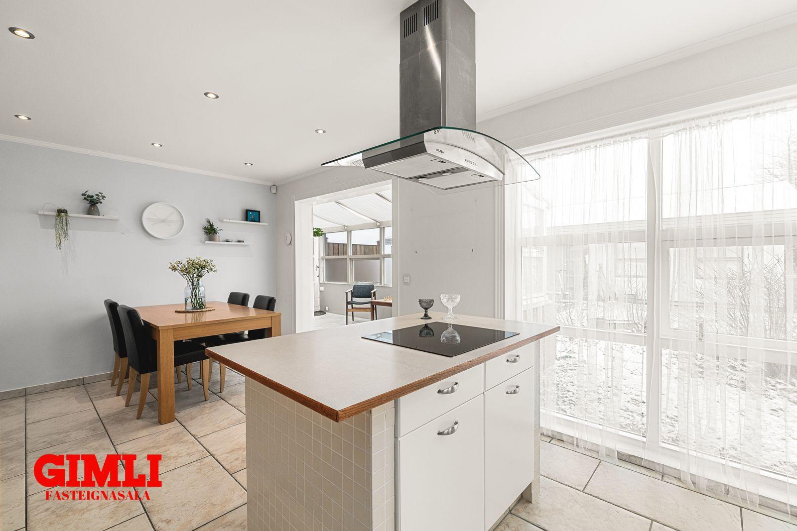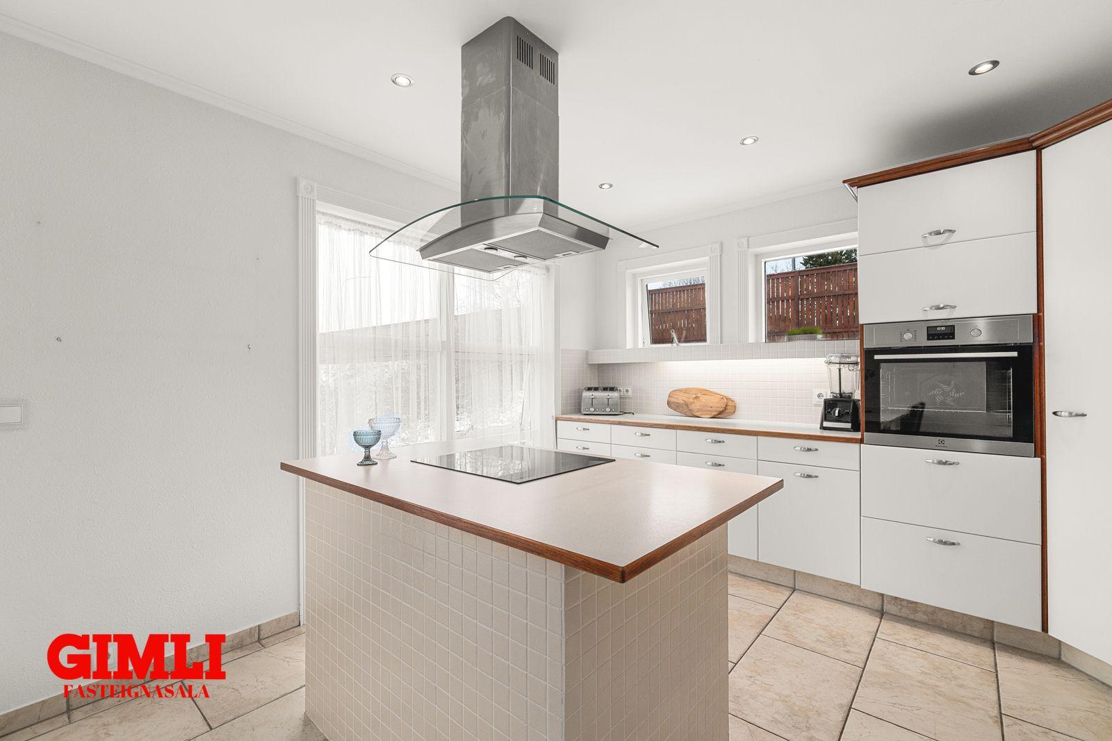 eldhús með góðu skápaplássi, eyju með helluborði, ofn í vinnuhæð, tengi fyrir uppþvottavél, borðkrók og flísum á gólfi. Úr eldhúsi er gengið inn í flísalagða
