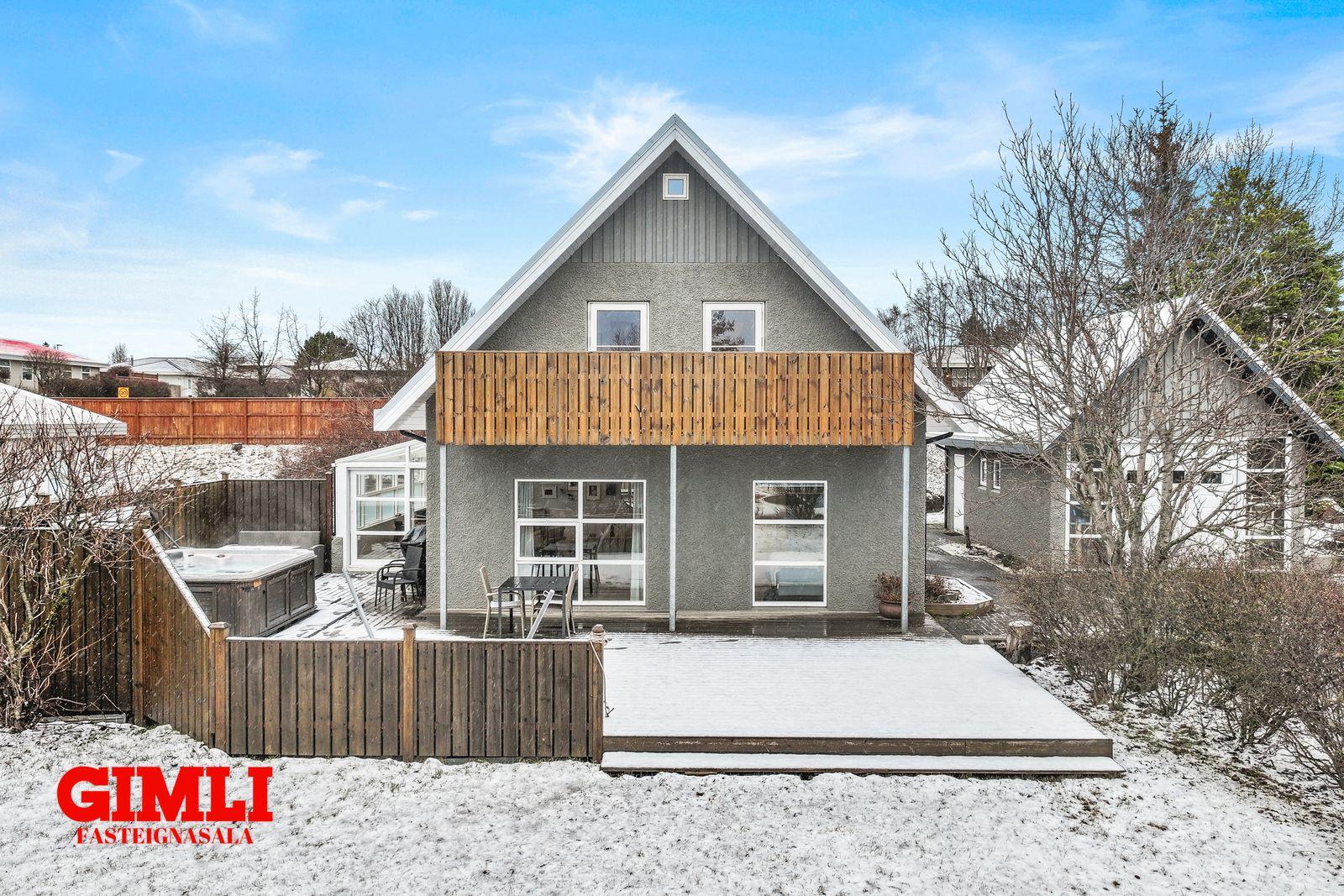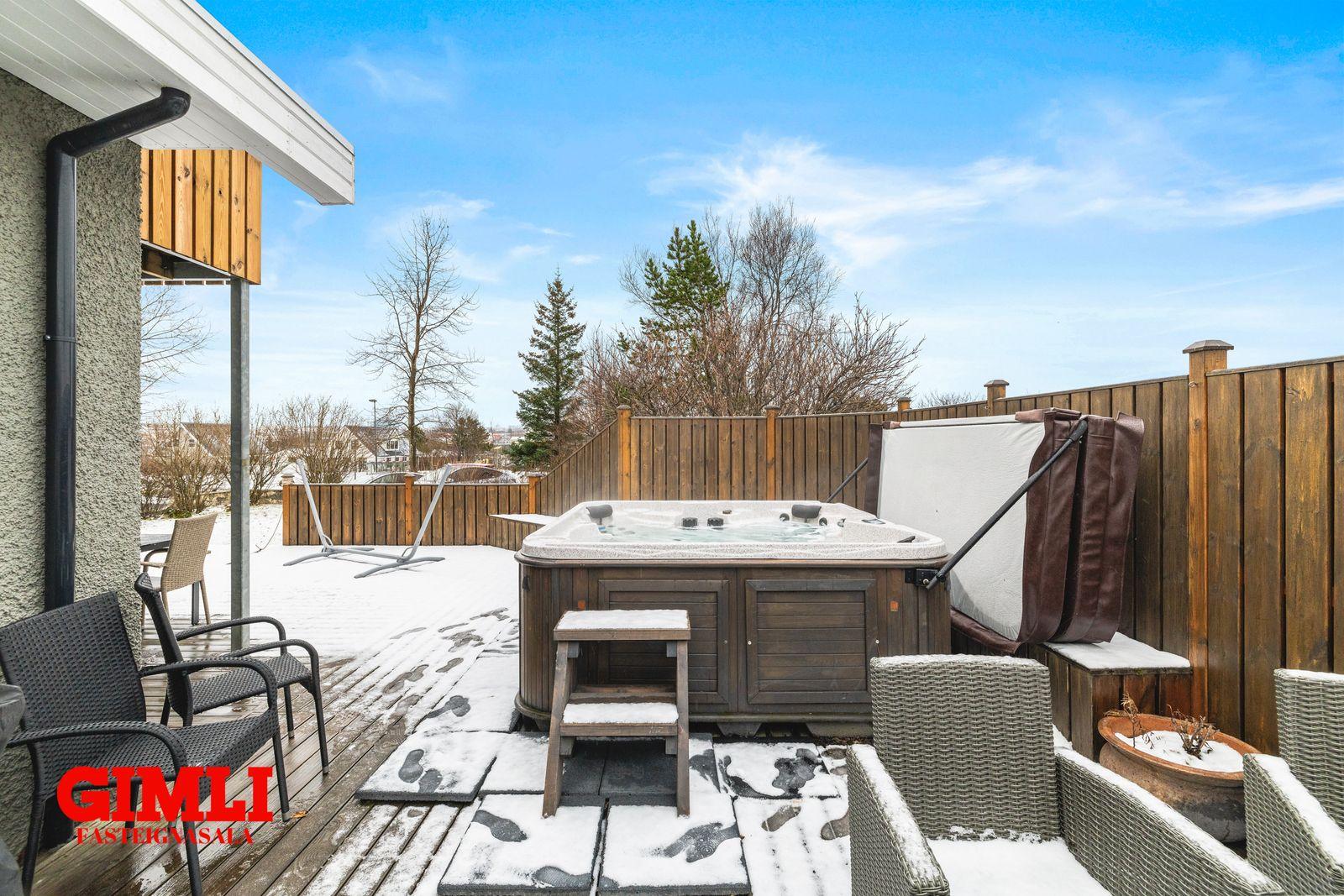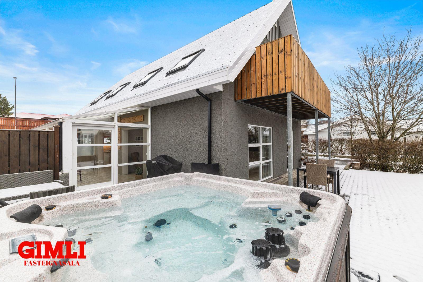 sólríka timburverönd þar sem að lagt hefur verið fyrir heitum potti. Úr sólstofu er innangengt inn í