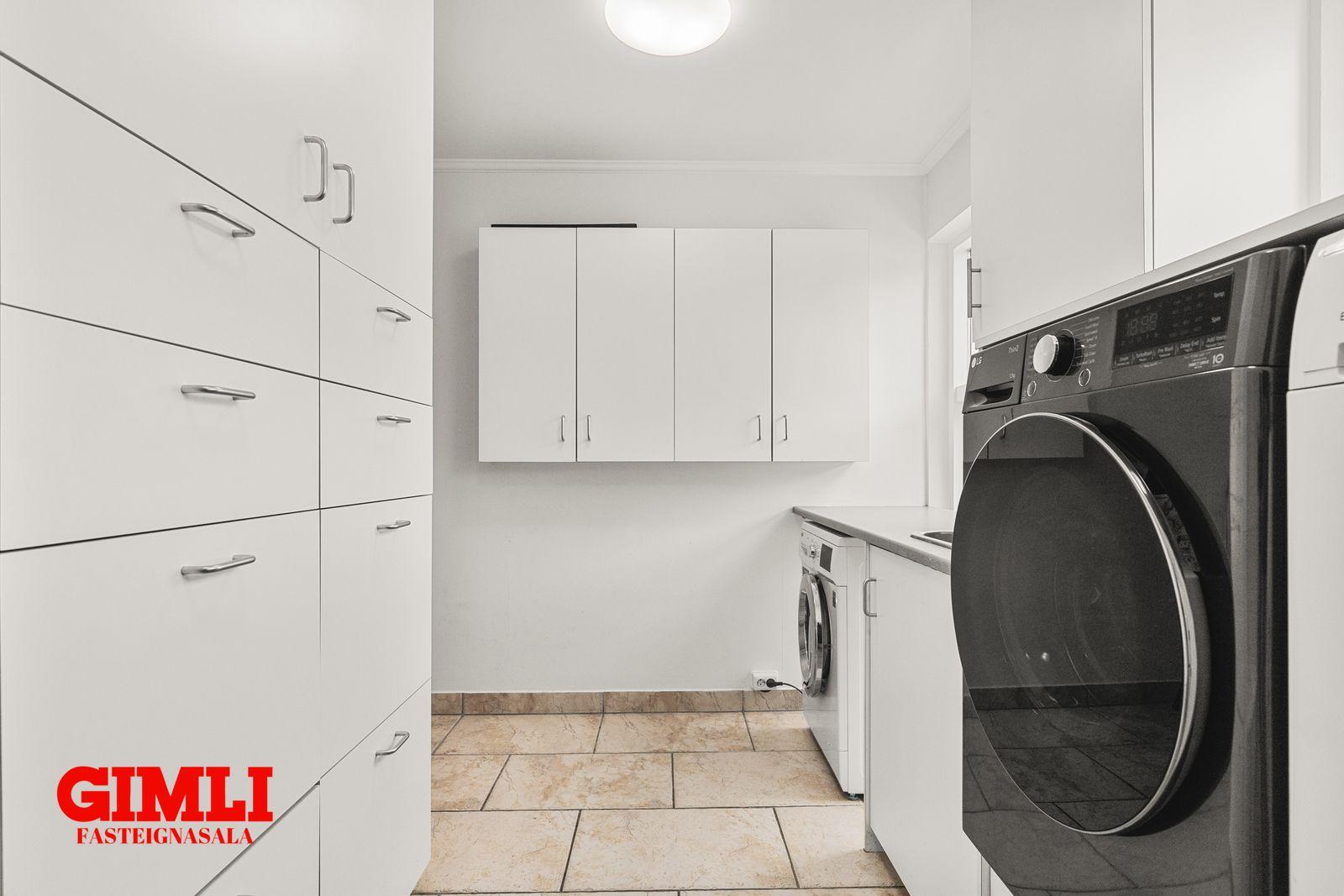 þvottahús með innréttingu, vask, opnanlegum glugga og útgengi út í garð. Rúmgott
