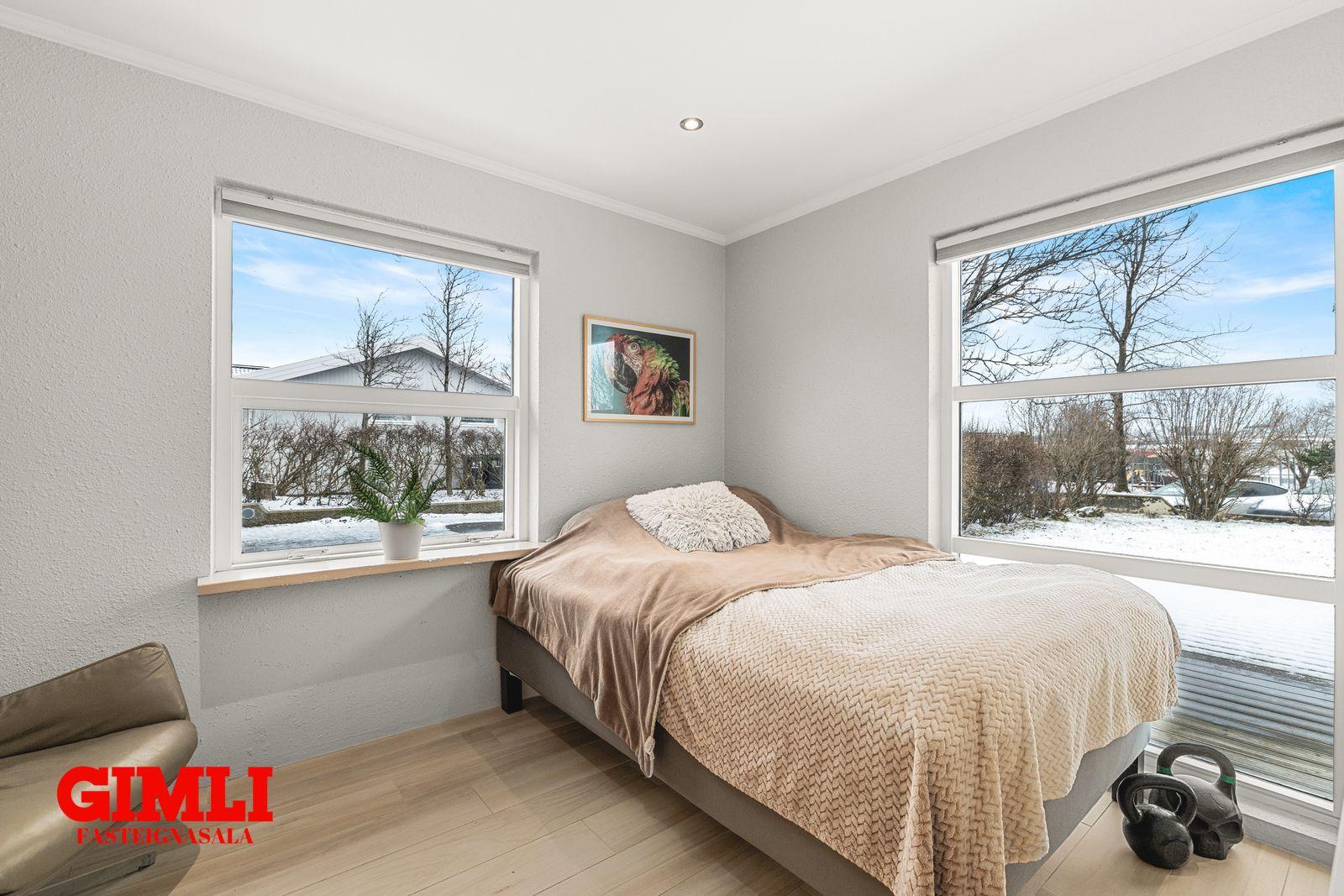 Hjónaherbergi er með fataskáp og harðparketi á gólfi. Úr hjónaherbergi er útgengt út á góðar svalir. Barnaherbergin eru þrjú með plastparketi á gólfi og útgengi er úr einu þeirra út á svalir. Fallegt