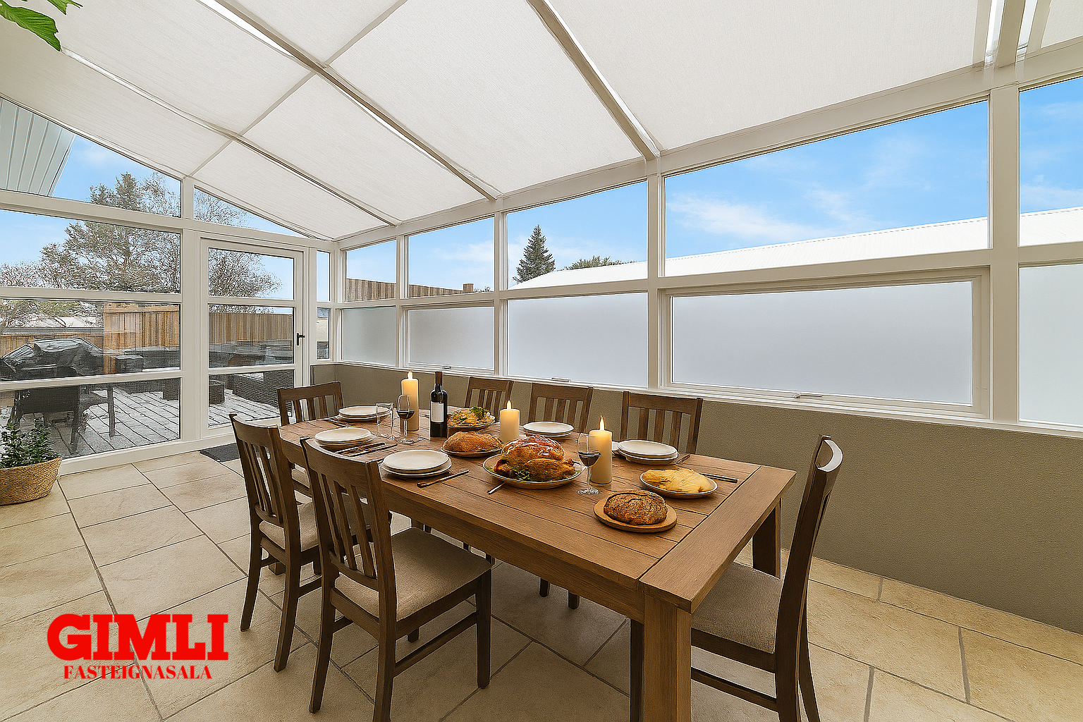 sólstofu og þaðan út á skjólgóða og