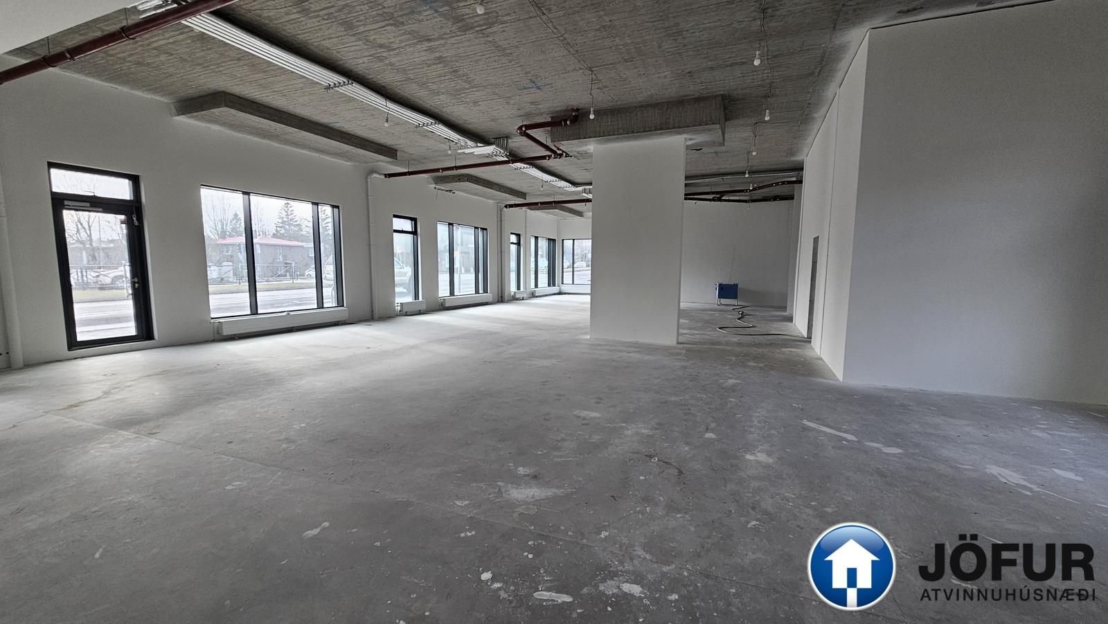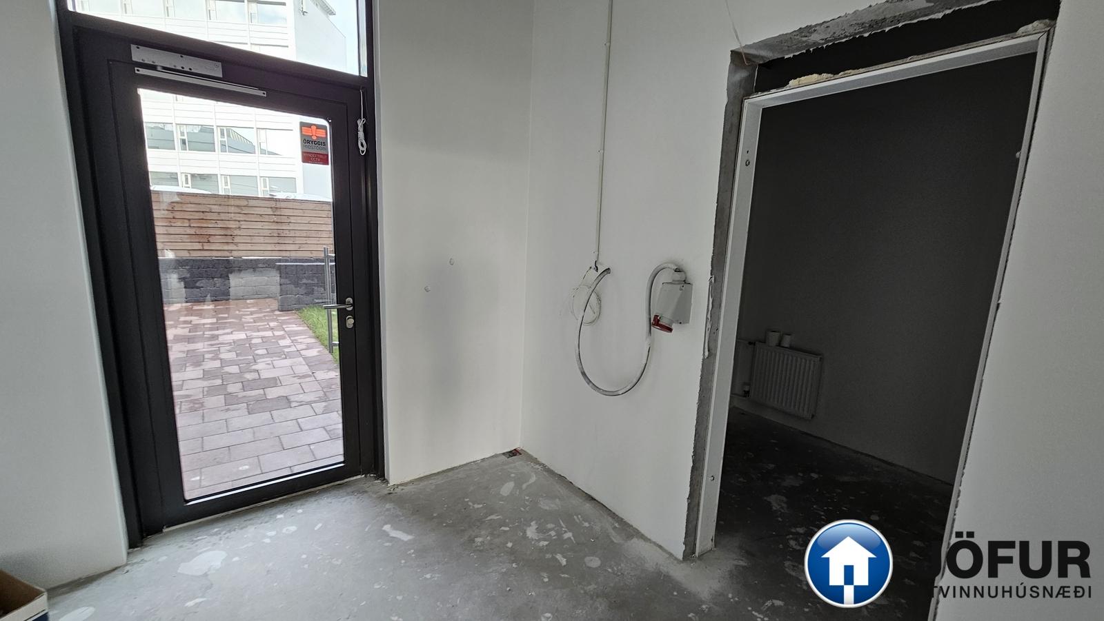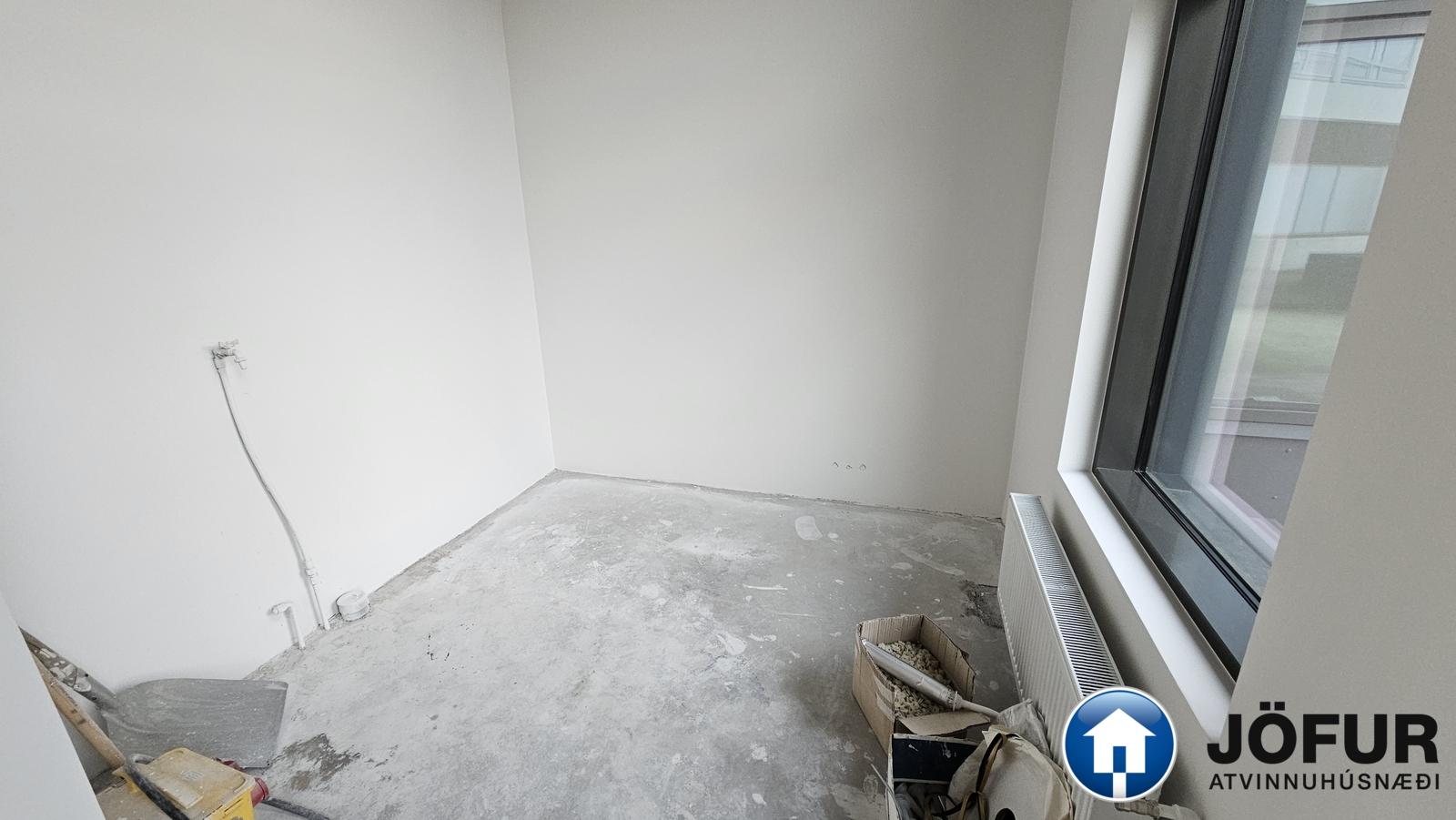 Skilalýsing: Rýmið afhendist tilbúið til innréttinga, loft og veggir grunnmáluð, gólf tilbúið til flotunar, rafmagnstafla komin upp og vinnulýsing. Allir neysluvatnsstútar tilbúnir til tengingar.