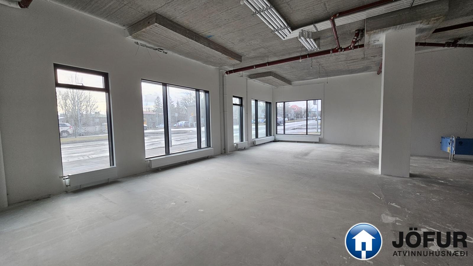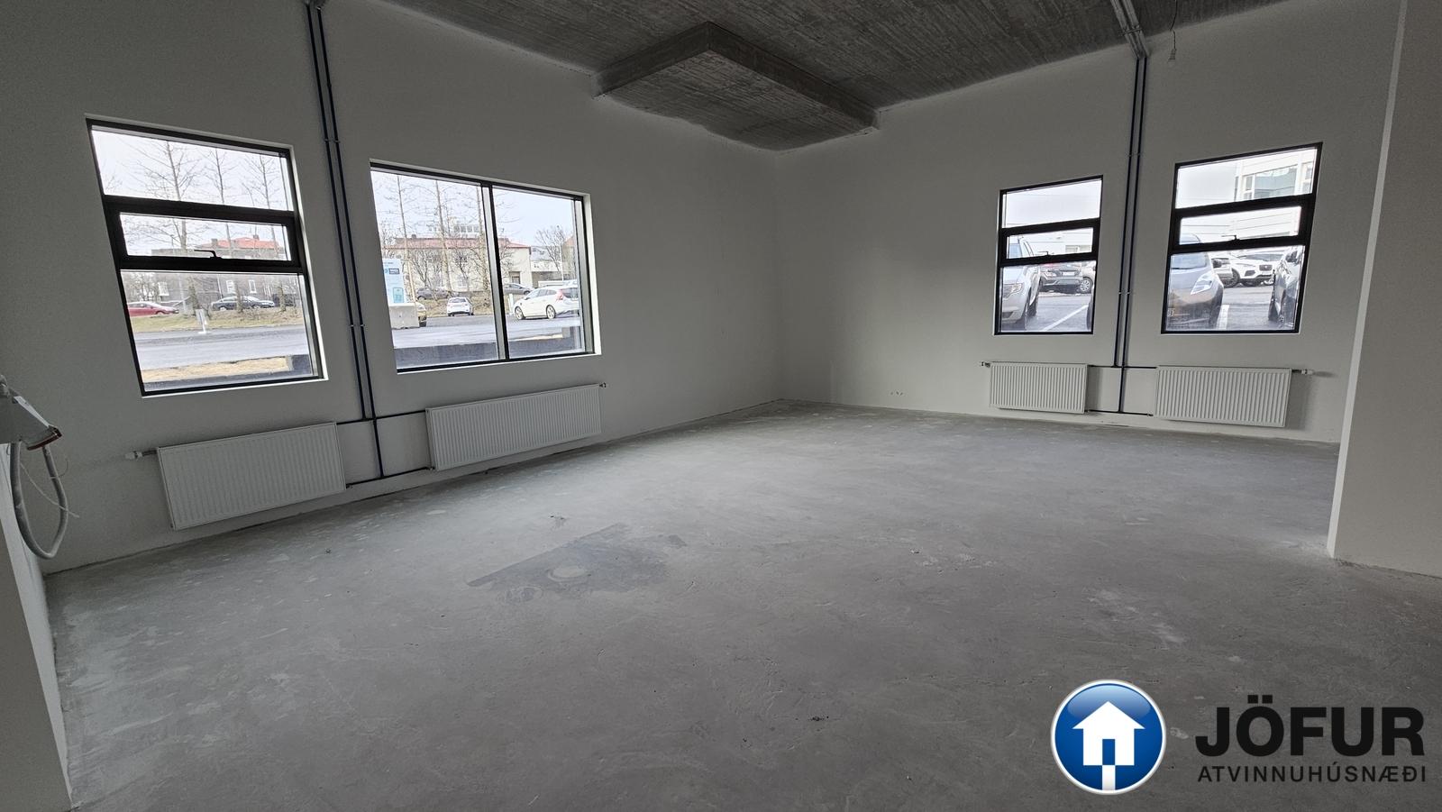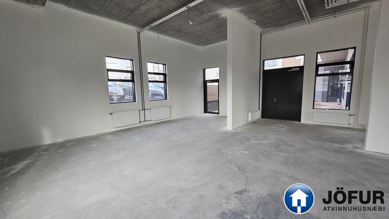 Skilalýsing: Rýmið afhendist tilbúið til innréttinga, loft og veggir grunnmáluð, gólf tilbúið til flotunar, rafmagnstafla komin upp og vinnulýsing. Allir neysluvatnsstútar tilbúnir til tengingar.
