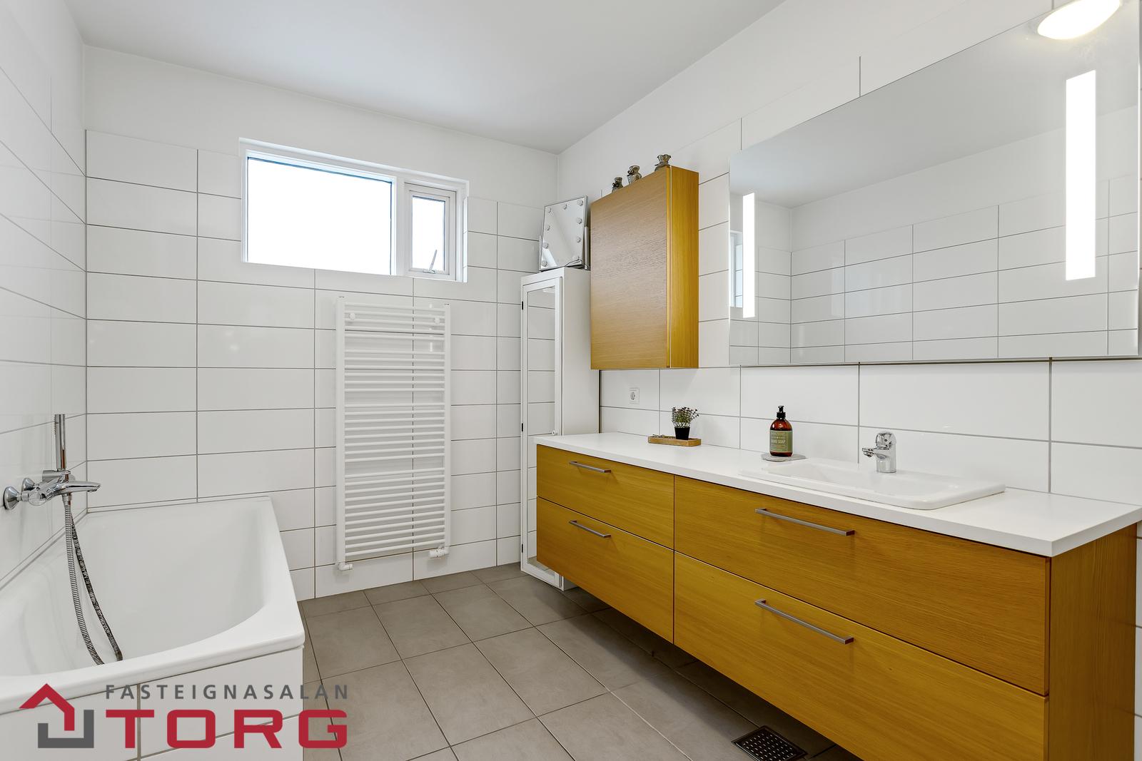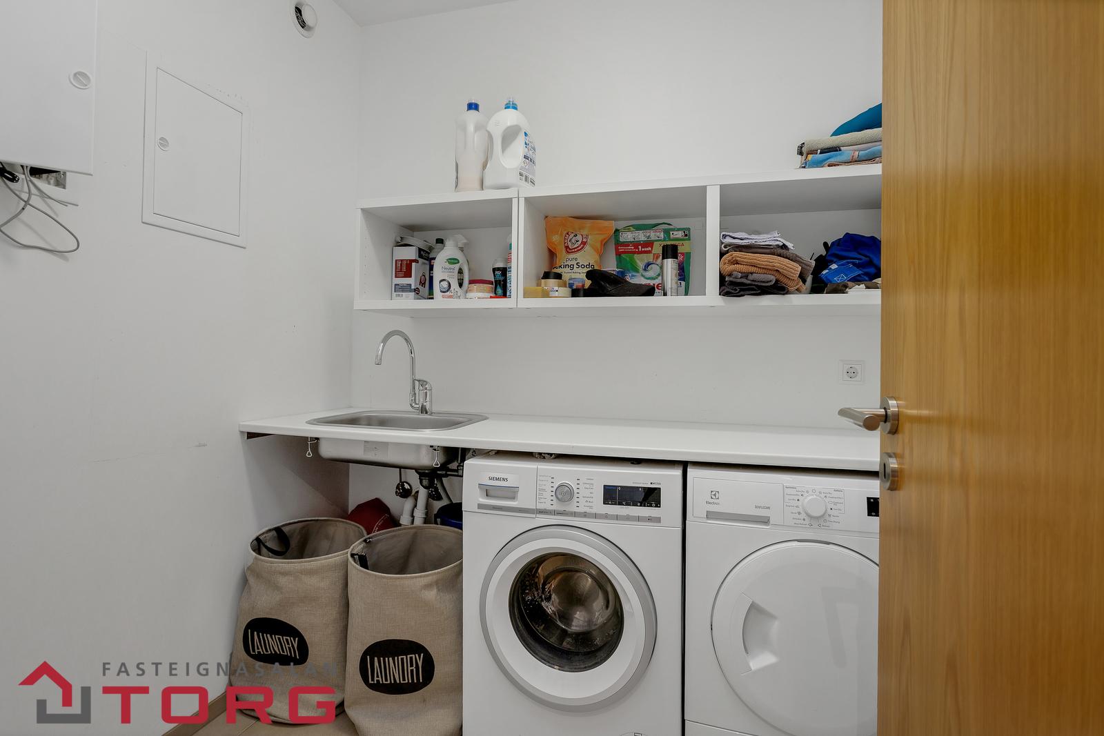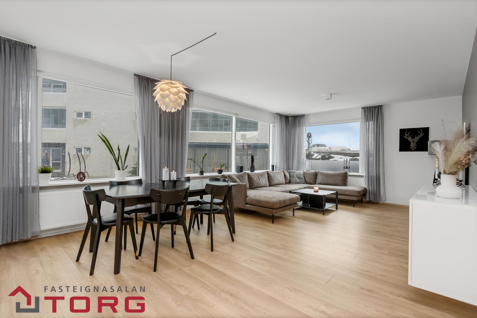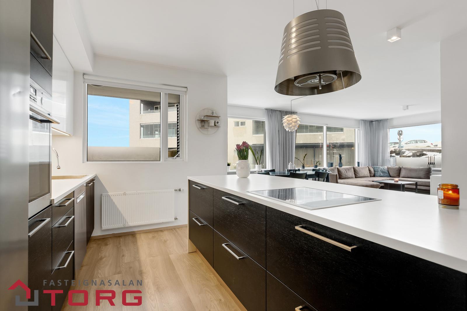 Fasteignasalan TORG kynnir: Glæsileg þriggja herbergja íbúð á fyrstu hæð með miklu útsýni í litlu þriggja hæða fjölbýlishúsi með lyftu, tvær verandir, þvottahús og geymsla innan íbúðar. Öll rými eru rúmgóð. Flísar og nýlegt harðparket er á gólfum. Tvö sérmerkt bílastæði annað með rafhleðslustöð. Eignin er skráð skv fmr 134,1 fm og allir fermetrar eru innan íbúðar. Allar nánari upplýsingar veitir Hafdís Rafnsdóttir löggiltur fasteignasali gsm 820-2222 eða hafdis@fstorg.is Nánari lýsing: Forstofa: Komið er inn í rúmgóða forstofu með flísum á gólfi og mjö góðum fataksápum. Stofa: Stofan er rúmgóð og björt og rúmar einnig borðstofu, mikið útsýni, útgengt út á verönd í norð-austur. Hjónaherbergi: Hjónaherbergið er mjög rúmgott og með góðu skápaplássi. Herbergi: Mjög rúmgott með harðparketi á gólfi og góðum fataskáp. Baðherbergi: Baðherbergið er með flíslögðu gólfi og á veggjum að hluta. Bæði baðkar og sturta er á baðherberginu ásamt upphengdu salerni, fallegri innréttingu, handklæðaofni og opnanlegum glugga. Þvottahús: innan íbúðar er gott þvottahús með flísum á gólfi og vinnuborði með vaski. Eldhús: Falleg innrétting frá HTH með góðu skápaplássi, stór eyja með gufugleypi og keramikhelluborði, hægt er að sitja við eyjuna. Tengi er fyrir uppþvottavél og ofninn er í vinnuhæð. Geymsla: Innaf eldhúsi er geymsla með harðparketi á gólfi og opnanlegum glugga. Verönd: Tvennar aflokaðar verandir eru við eignina. Aðkoma: Bílastæði eru tvö og bæði sérmerkt, annað þeirra með rafhleðslustöð. Stéttar sem eru næst húsi eru hellulagðar og snjóbræðslulögn í gangstíg framan við húsið. Engar tröppur heldur aðeins brautir og því aðgengi gott. Sameiginleg hjóla-og vagnageymsla. Húsið er klætt að utan og því viðhaldslítið. Niðurlag: Þetta er rúmgóð og falleg íbúð með góðu aðgengi og fallegu útsýni við Austurkór 98 í Kópavogi. Allar nánari upplýsingar veitir Hafdís Rafnsdóttir löggiltur fasteignasali gsm 820-2222 eða hafdis@fstorg.is Um skoðunar- og aðgæsluskyldu: Í lögum um fasteignakaup nr. 40/2002 er kveðið á um ríka skoðunarskyldu kaupenda á fasteignum. Fasteignasalan TORG bendir væntanlegum kaupendum á að kynna sér vel ástand fasteigna við skoðun og fyrir tilboðsgerð og ef þurfa þykir að leita til sérfræðinga um nánari ástandsskoðun. Almennt getur kaupandi ekki borið fyrir sig að ástand eignar sé annað en það sem hann hefði mátt sjá við slíka skoðun. Forsendur söluyfirlits: Söluyfirlit er samið af fasteignasala í samræmi við ákvæði laga nr. 70/2015. Þær upplýsingar sem fram koma í söluyfirliti þessu eru sóttar í opinberar skrár, til seljanda sjálfs og eftir atvikum til húsfélags. Seljandi veitir upplýsingar um eign í samræmi við upplýsingaskyldu laga um fasteignakaup nr. 40/2002, og ábyrgist að þær séu réttar. Fasteignasali sannreynir að þær upplýsingar séu réttar með sjónskoðun á eigninni. Fasteignasali getur ekki fullyrt um ástand og eiginleika þeirra hluta fasteigna sem ekki eru aðgengilegir og sjást ekki berum augum, t.d. lagnir, dren, skólp og þak. Það sama á við um staðhæfingar seljanda eignar um viðhald og einstaka framkvæmdir. Gjöld sem kaupandi þarf að standa straum af vegna kaupanna: Stimpilgjald af kaupsamningi sem er hlutfall af fasteignamati. Stimpilgjald er 0,8% fyrir einstaklinga (0,4% við fyrstu kaup) og 1,6% fyrir lögaðila. Þinglýsingargjald af kaupsamningi, veðskuldabréfum, veðleyfum o.fl. Þinglýsingargjald er kr. 2.700,- fyrir hvert skjal. Lántökugjald lánastofnunar. Um lántökugjald vísast í gjaldskrá viðkomandi lánveitanda. Umsýsluþóknun fasteignasölu skv. gjaldskrá.