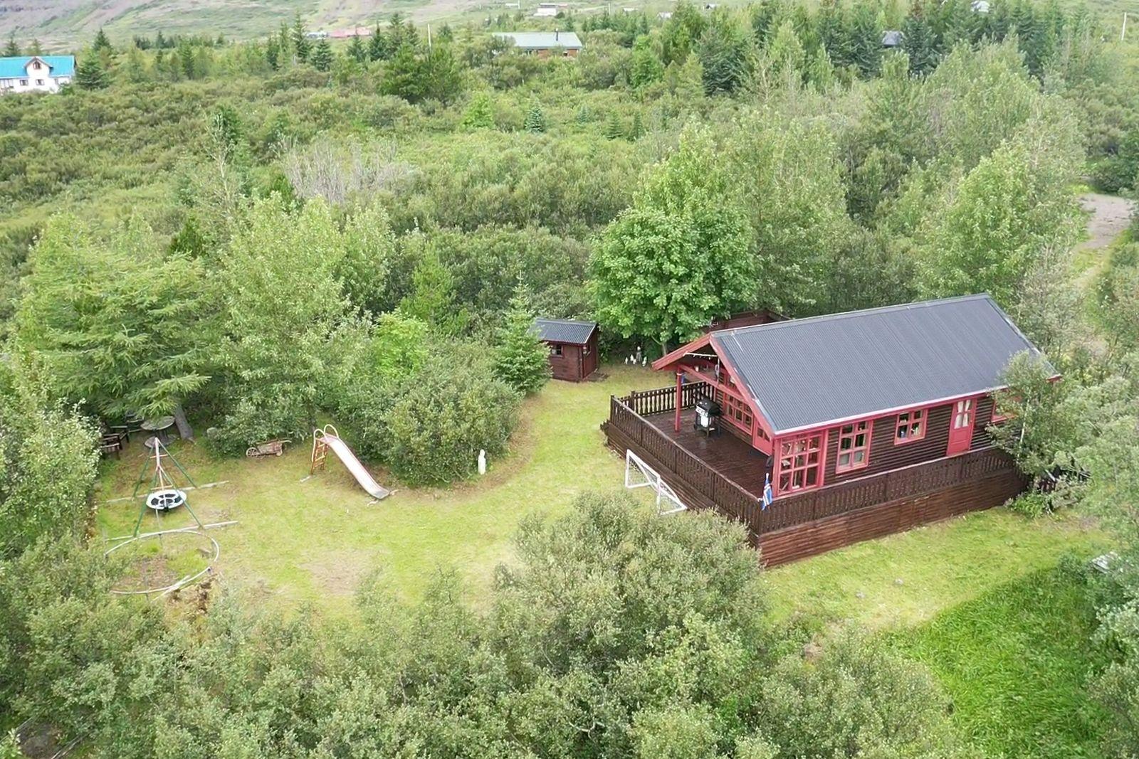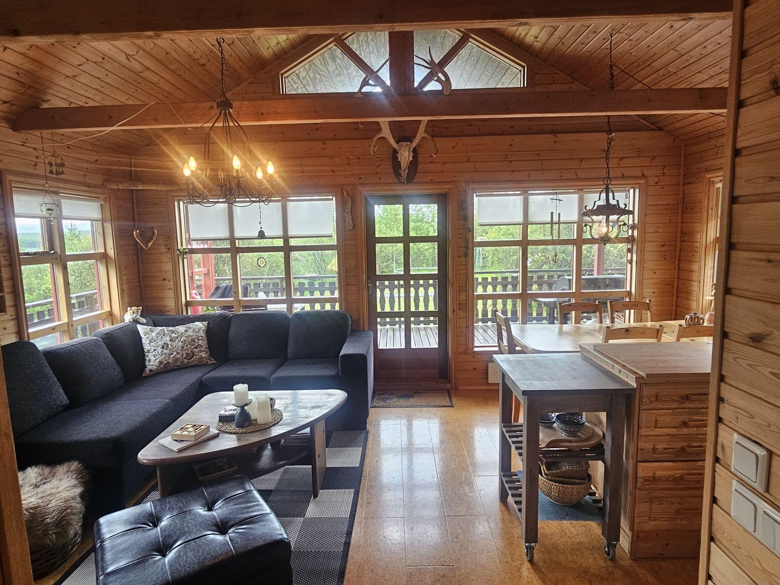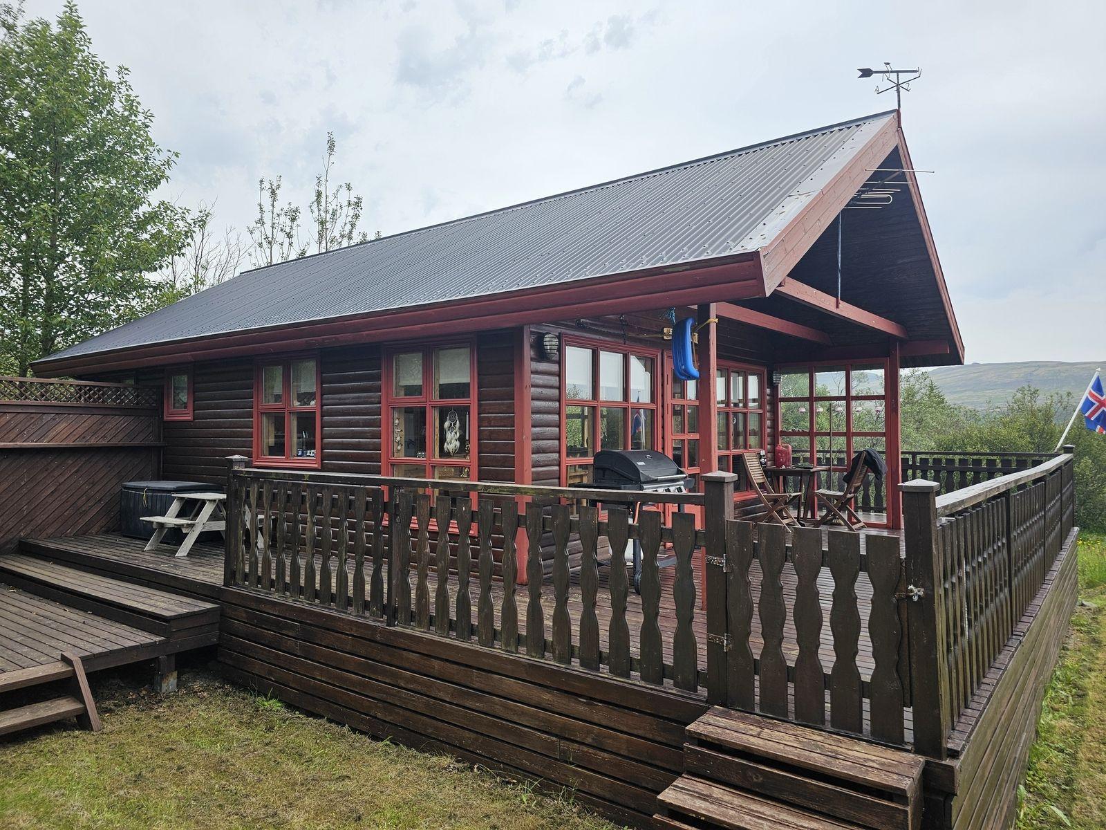 Nánari lýsing: Húsið skiptist í anddyri með fataskáp, alrými, sem er setustofa og eldhús, 2 herbergi og baðherbergi með sturtu. Að auki er svefnloft yfir hluta hússins. Húsið er innréttað með panelklæðningu á veggjum og í lofti en pressaðar spónaplötur eru á gólfi. Eldhúsinnrétting er timbur og í góðu ástandi.