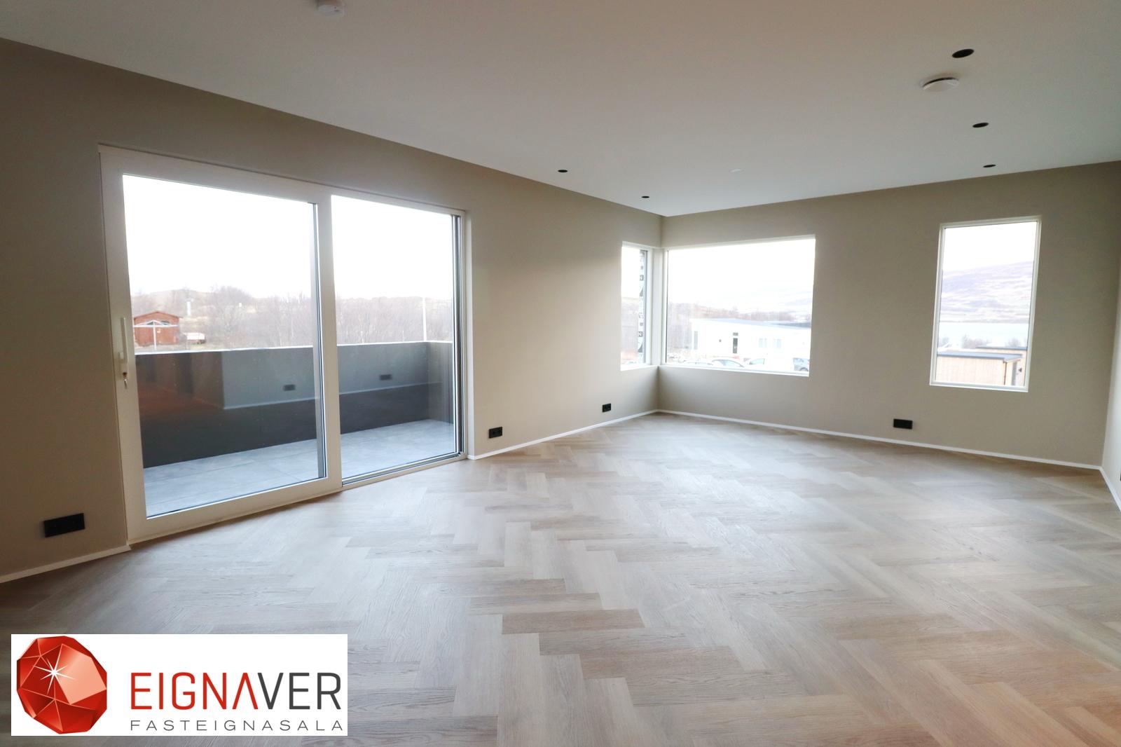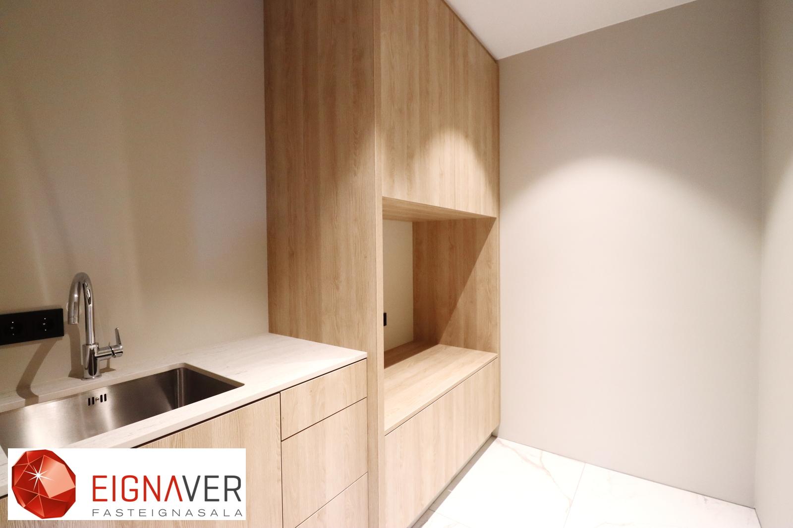 Íbúðin er þriggja herbergja og skiptist þannig; Inngangur, baðherbergi, þvottaherbergi, eldhús, stofa, barnaherbergi og hjónaherbergi. Inn af hjónaherbergi er sér baðherbergi. Íbúðinni fylgir geymsla í kjallara og eru svalir til suðurs. Nánar: Íbúðin afhendist fullfrágengin. Allar innréttingar eru sérsmíðaðar af Húsheild/Hyrnu og eru bekkjarplötur í eldhúsi og baðherbergjum úr steini. Flísar eru á gólfum baðherbergis og þvottahúss og flísar á veggjum baðherbergja, en harðparket er á öðrum gólfum. Innihurðir íbúða eru sérsmíðaðar af Húsheild/Hyrnu úr ljósri eik, það sama á við um allar innréttingar. Kappalýsing er á baðherbergjum, svefnherbergjum og í alrými, loftskiptakerfi er í öllum íbúðum. Hljóðdúkur í loftum og innfelld lýsing. Allt neysluvatn fer í gegnum varmaskipti. Mynd-dyrasími er í íbúðum. Raflögn fyrir hleðslustöð við bílastæði.