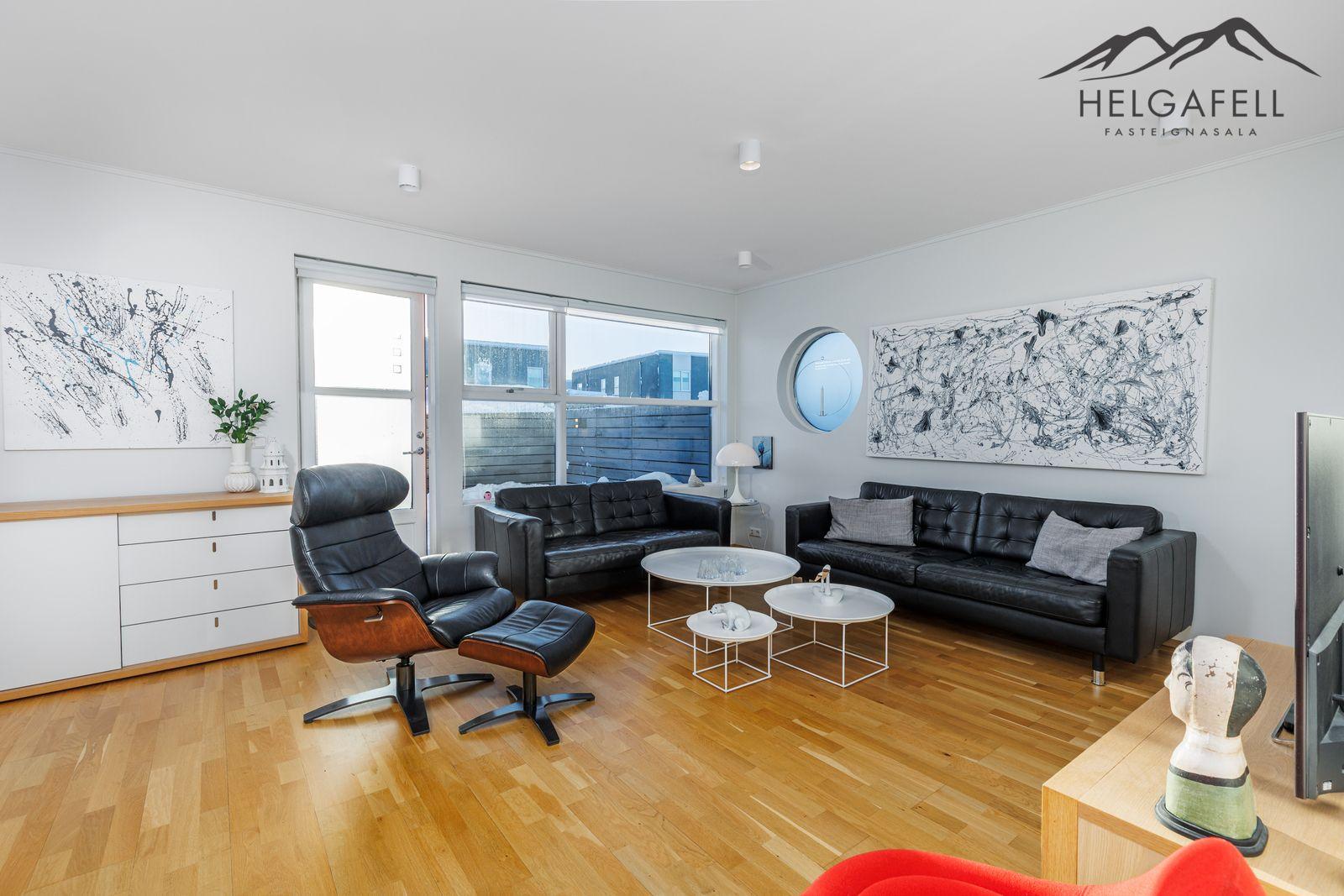 Björt og rúmgóð parketlögð stofa er opin við eldhús. Útgengi á sólpall til suðurs.