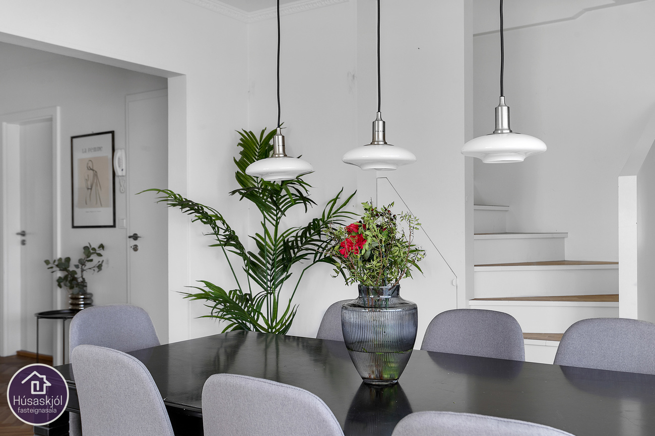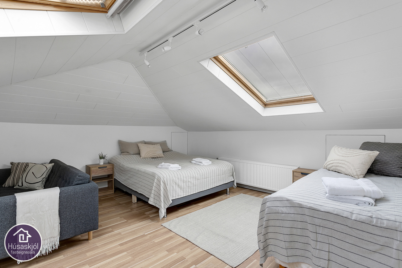 Inngangur er sameiginlegur með neðri hæð. Þaðan er snyrtilegur stigi upp á stigapall með fatahengi. Þegar komið er inn í íbúðina tekur við opið og rúmgott hol með fataskáp sem tengir saman aðrar vistaverur íbúðarinnar.Stofa/borðstofa er rúmgott og bjart rými með stórum gluggum á tvo vegu, til vesturs og norðurs má sjá út á sjó milli húsa í vesturátt. Eldhúsið er endurnýjað með hvítri eldhúsinnréttingu sem er með góðu borð og skápaplássi, rúmgott rými fyrir eldhúsborð og stóla. Endurnýjuð eldhústæki, tveir ofnar í vinnuhæð, keramikhelluborð, háfur, innbyggð uppþvottavél og ísskápur. Einnig eru vaskur og blöndunartæki endurnýjuð. Baðherbergið er með nýlegri ljósri innréttingu sem er með skúffum og innbyggðum vaski og speglaskáp sem er með innbyggðri lýsingu, baðkar með sturtu og gleri, tengi fyrir þvottavél og gólf er flotað og málað. Svefnherbergin eru tvö, hjónaherbergið er rúmgott með góðum upprunalegum fataskápum. Frá stofu er gengið upp á risloftið um nýlegan stiga sem nýtir vel plássið m.a. með innfeldum hirslum meðfram stigauppganginum. Risloftið er bjart og opið alrými með tveimur þakgluggum sem veita góða birtu inn í rýmið. Súðaskápar eru meðfram hliðum rýmisins með góðu geymsluplássi. Risloftið býður uppá á ýmsa möguleika hvort sem er sem sjónvarpsstofa, vinnuherbergi eða herbergi.