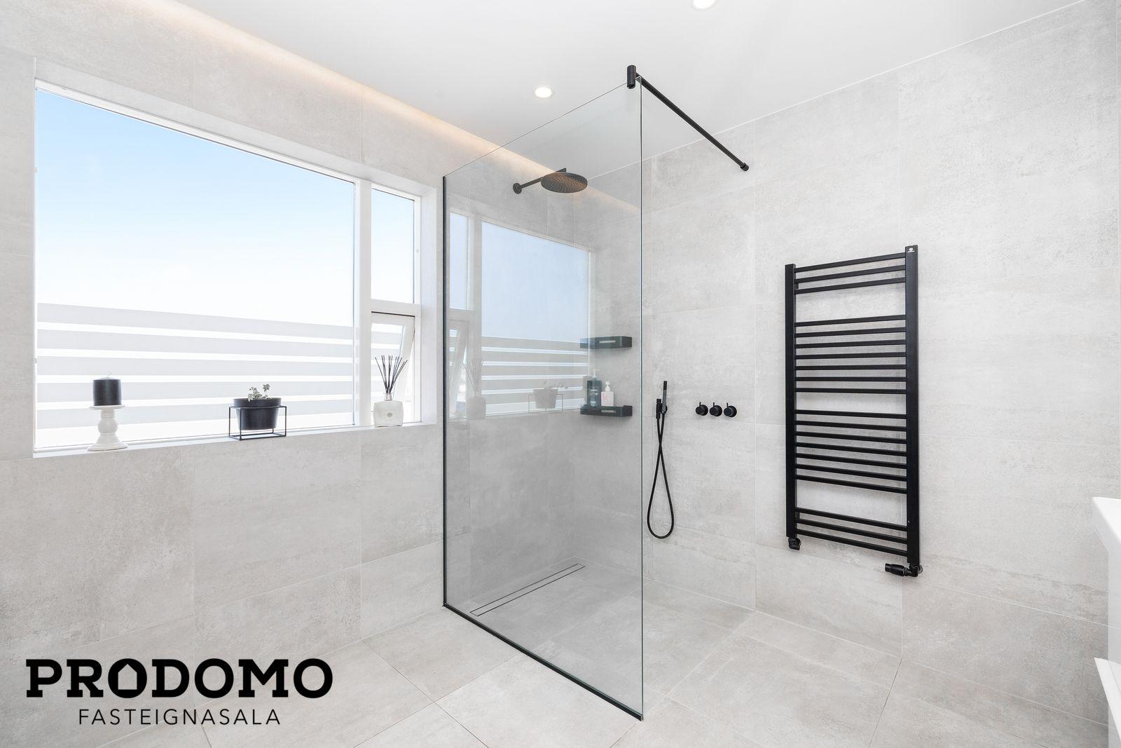 Baðherbergi er með flísum á gólfi og veggjum að mestu. Þar er hvít innrétting, upphengt salerni, handklæðaofn og sturta með innbyggðum tækjum.