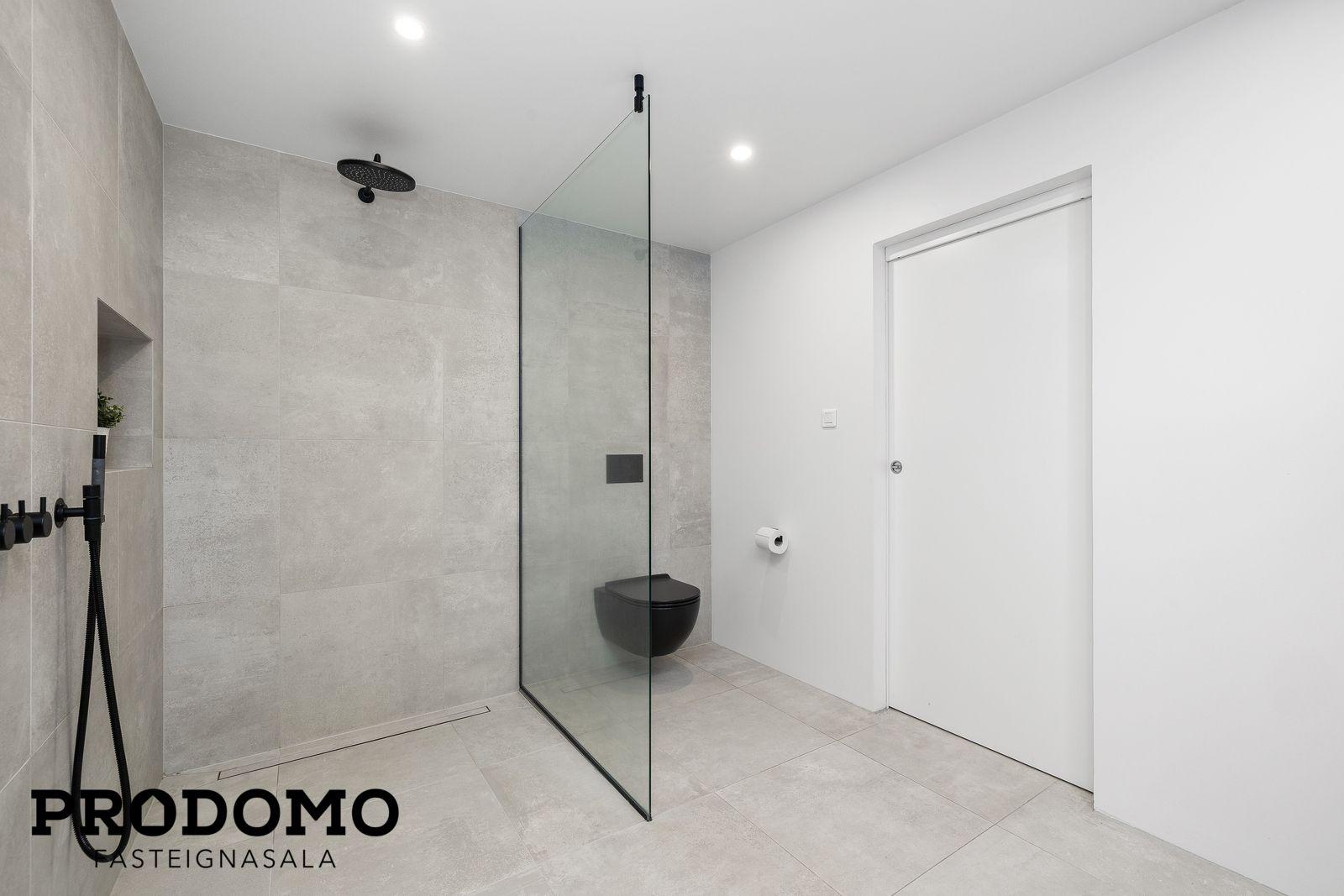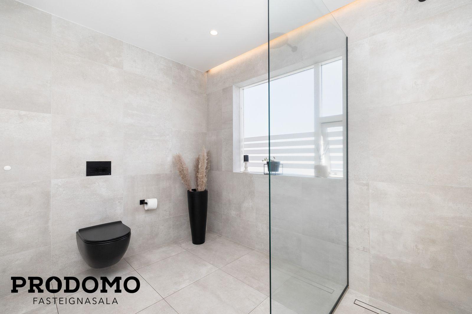 Baðherbergi með flísum á gólfi og veggjum að hluta. Þar er stílhrein svört innrétting, upphengt salerni, handklæðaofn og sturta með innbyggðum tækjum. Hitaveitugrind er á baði.