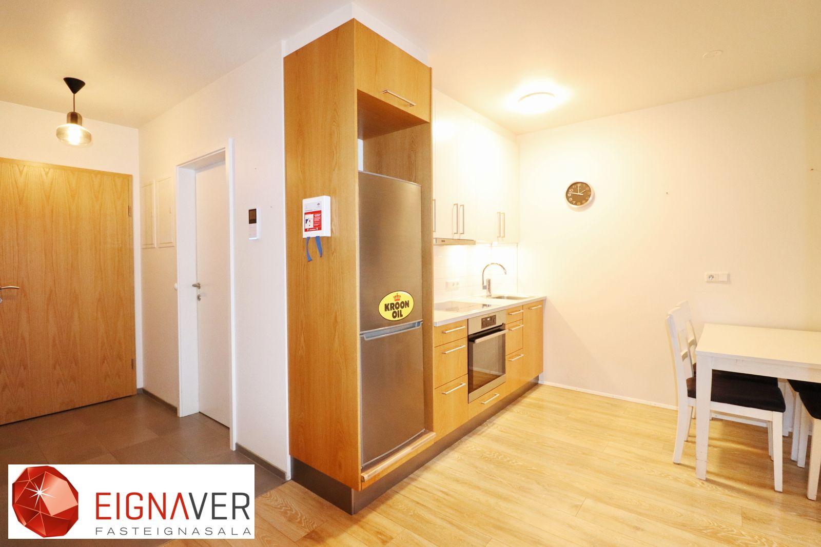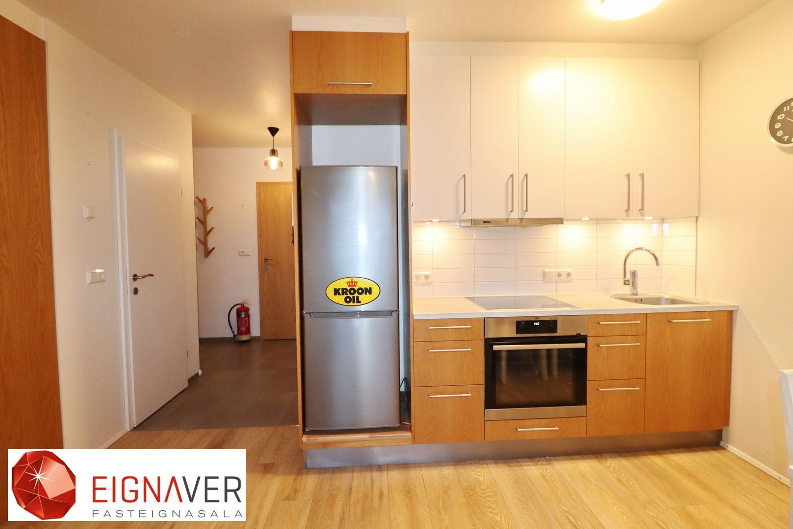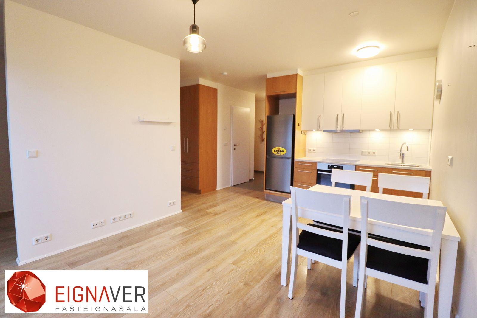 Stofa og eldhús koma saman í einu rými, parket á gólfi, góð útgönguhurð út á suður svalir. Góð eikarinnrétting og hvítir efri skápar.