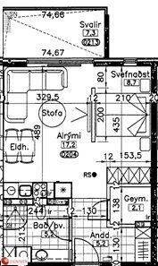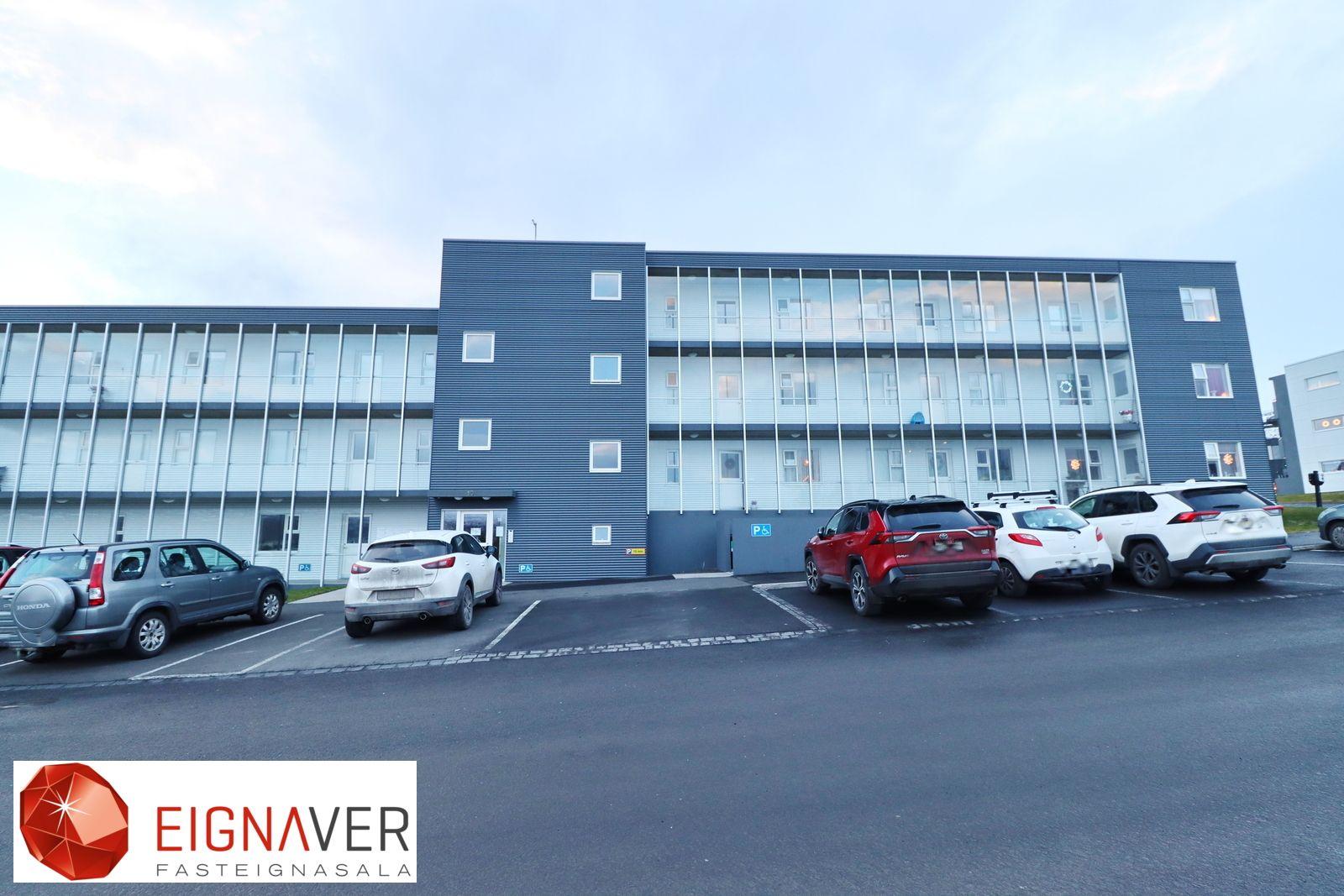 Eignin skiptist í forstofu, geymslu, eldhús og stofu í einu rými, svefnherbergi/svefnrými er stúkað af frá stofu og er með góðum skápum. Baðherbergi með aðstöðu fyrir þvottavélog sér geymslu í sameign.