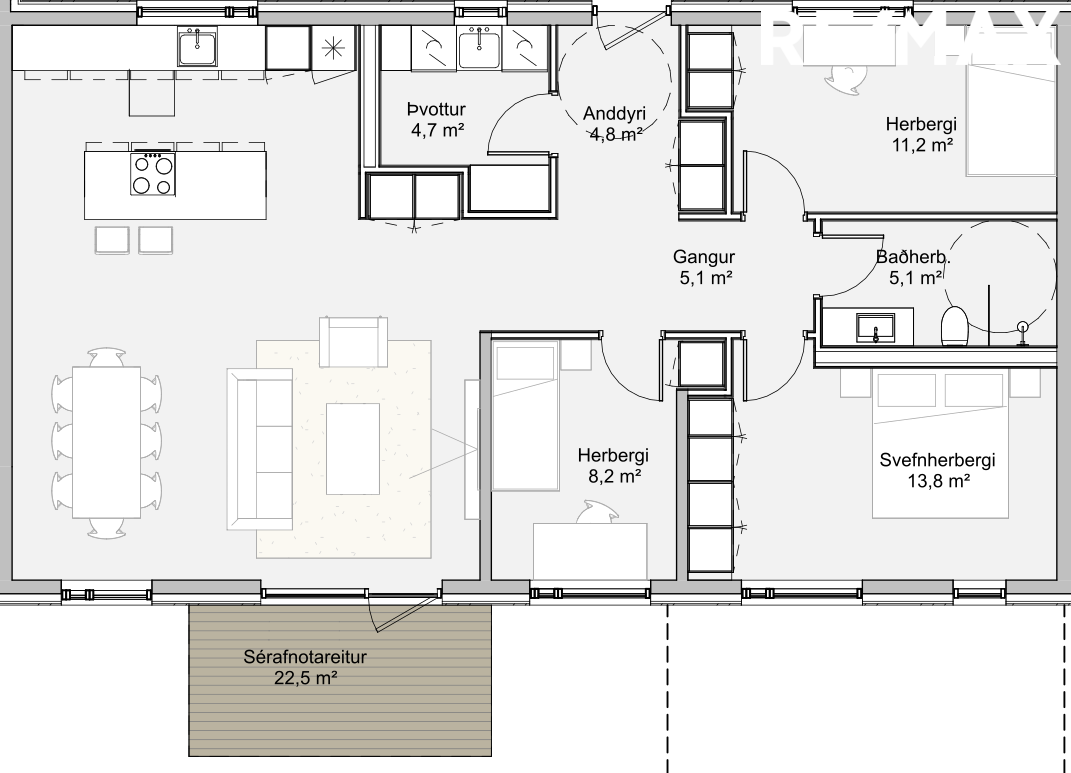 Stofa/borðstofa: Í samliggjandi rými með eldhúsi. Opið og bjart rými. Útgengt út á 22,5 fm sérafnotarétt.