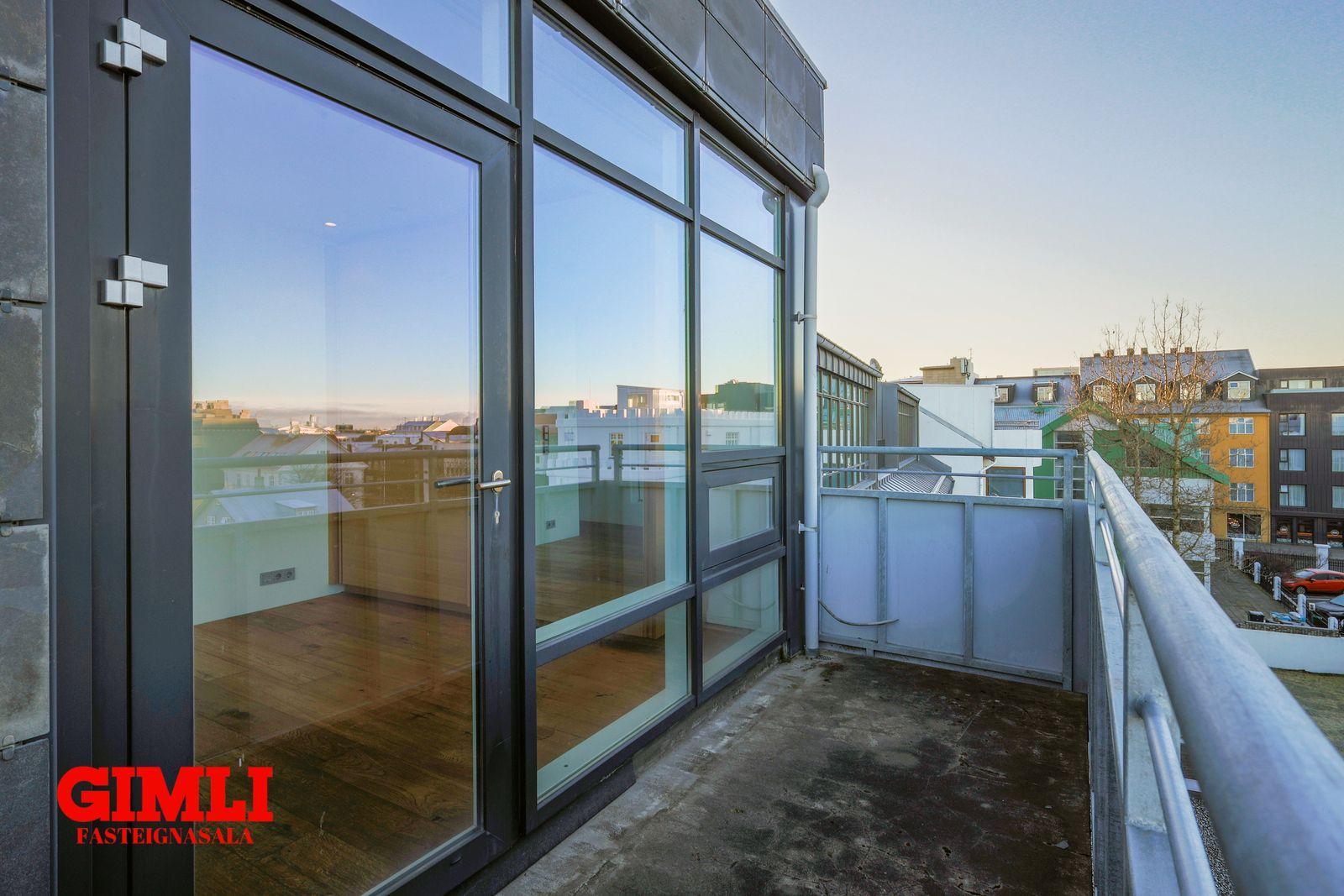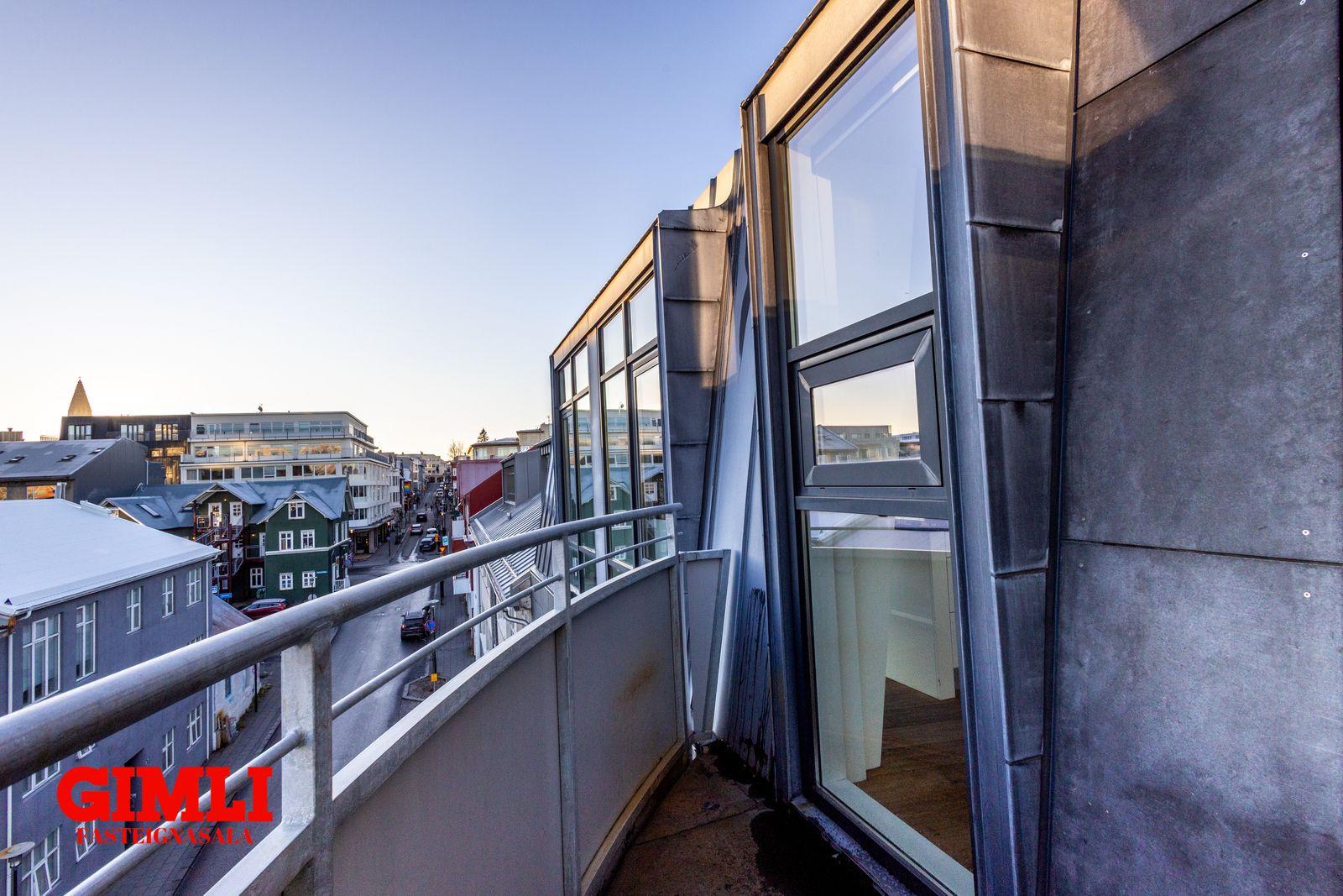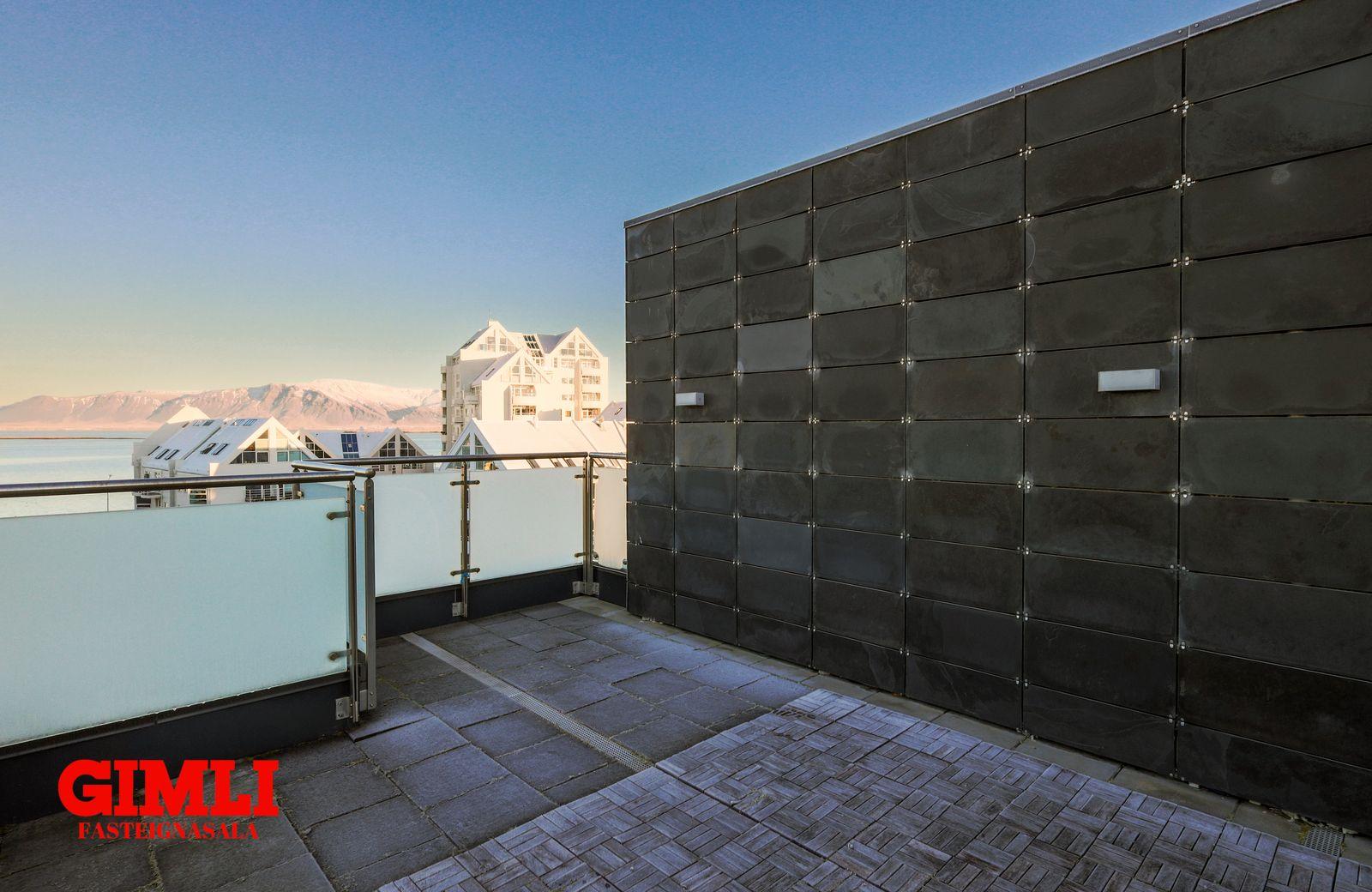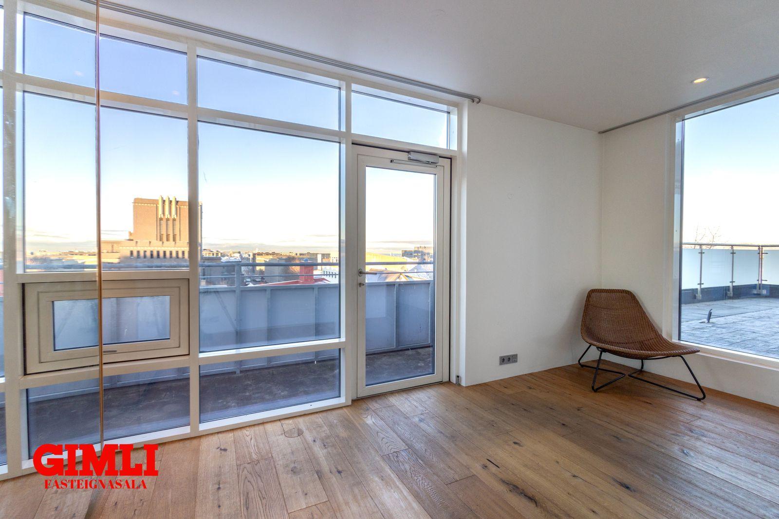 KLAPPARSTÍGUR 14 - GLÆSILEG PENTHOUSE ÍBÚÐUm er að ræða einstaka 117,5 fm penthouse/þakíbúð á 5.hæð í 8 íbúða húsi byggt 2006 sem stendur mjög vel með tilliti til útsýnis sem er 360 gr og er sjávarútsýnið einstakt. Lyfta er upp í íbúðina með sérstökum aðgangscóða. Mikil lofthæð er í íbúðinni og þá sérstaklega í stofunni og miklir gluggar á þrjá vegu. Tvennar svalir ásamt 45 fm verönd með miklu útsýni.
