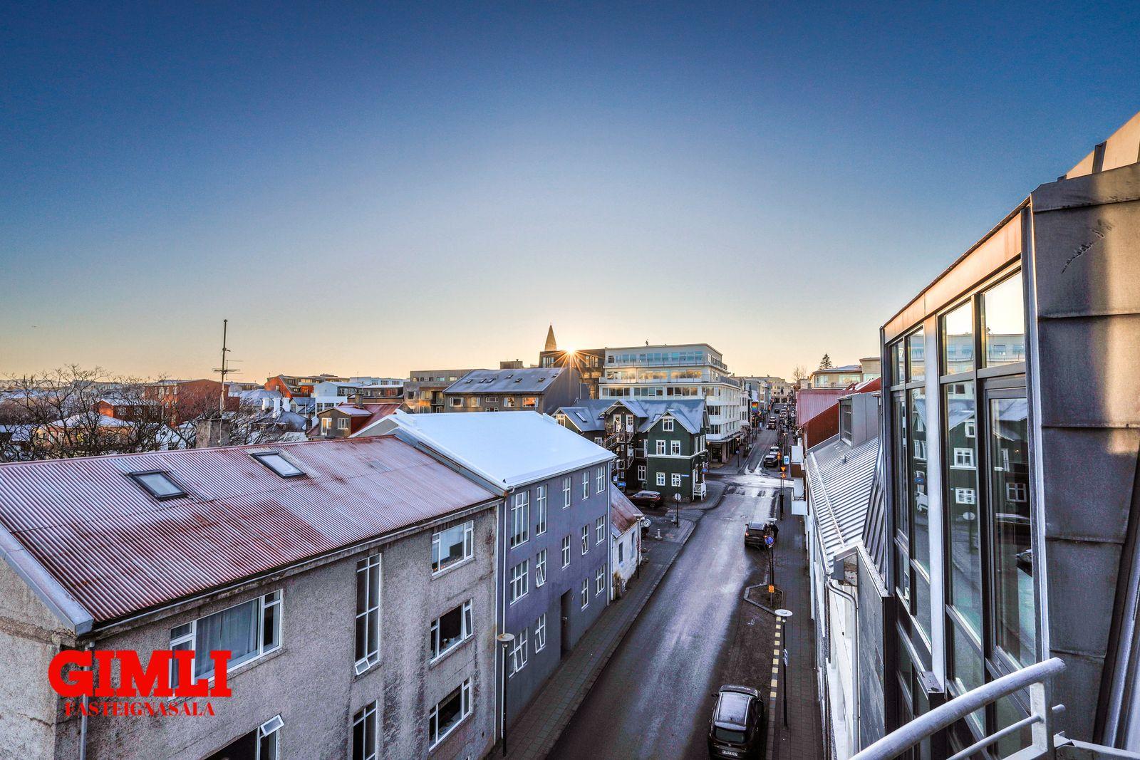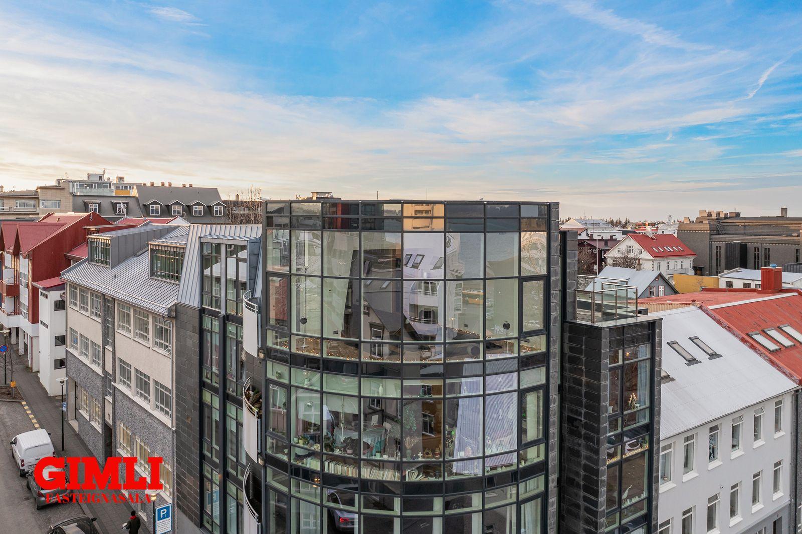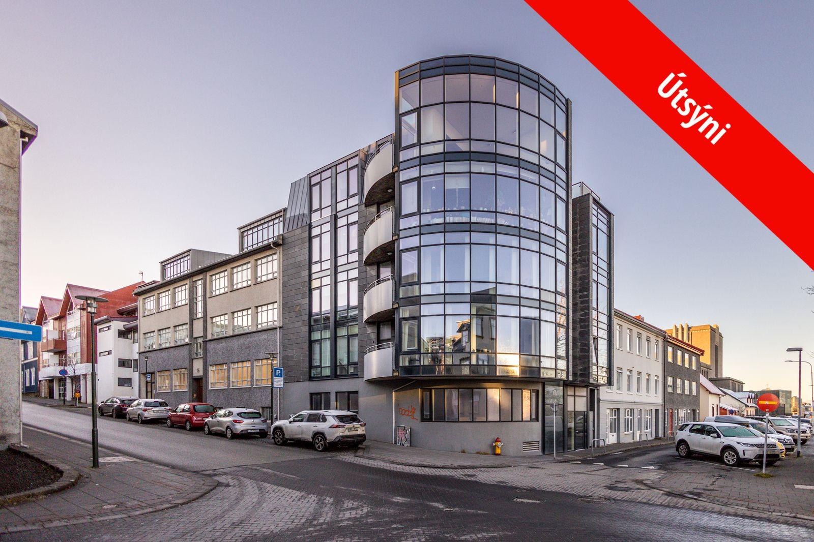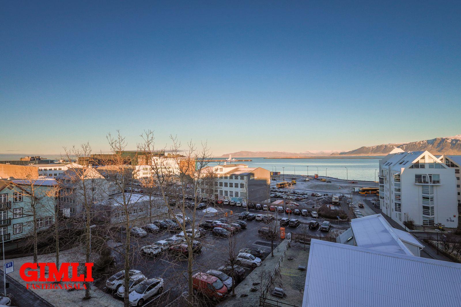 KLAPPARSTÍGUR 14 - GLÆSILEG PENTHOUSE ÍBÚÐUm er að ræða einstaka 117,5 fm penthouse/þakíbúð á 5.hæð í 8 íbúða húsi byggt 2006 sem stendur mjög vel með tilliti til útsýnis sem er 360 gr og er sjávarútsýnið einstakt. Lyfta er upp í íbúðina með sérstökum aðgangscóða. Mikil lofthæð er í íbúðinni og þá sérstaklega í stofunni og miklir gluggar á þrjá vegu. Tvennar svalir ásamt 45 fm verönd með miklu útsýni.