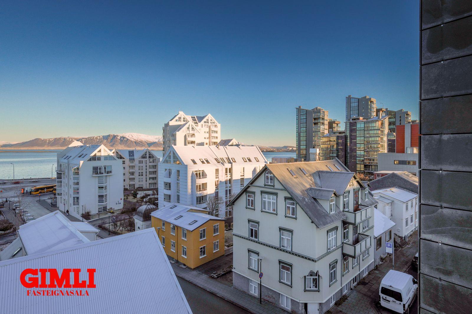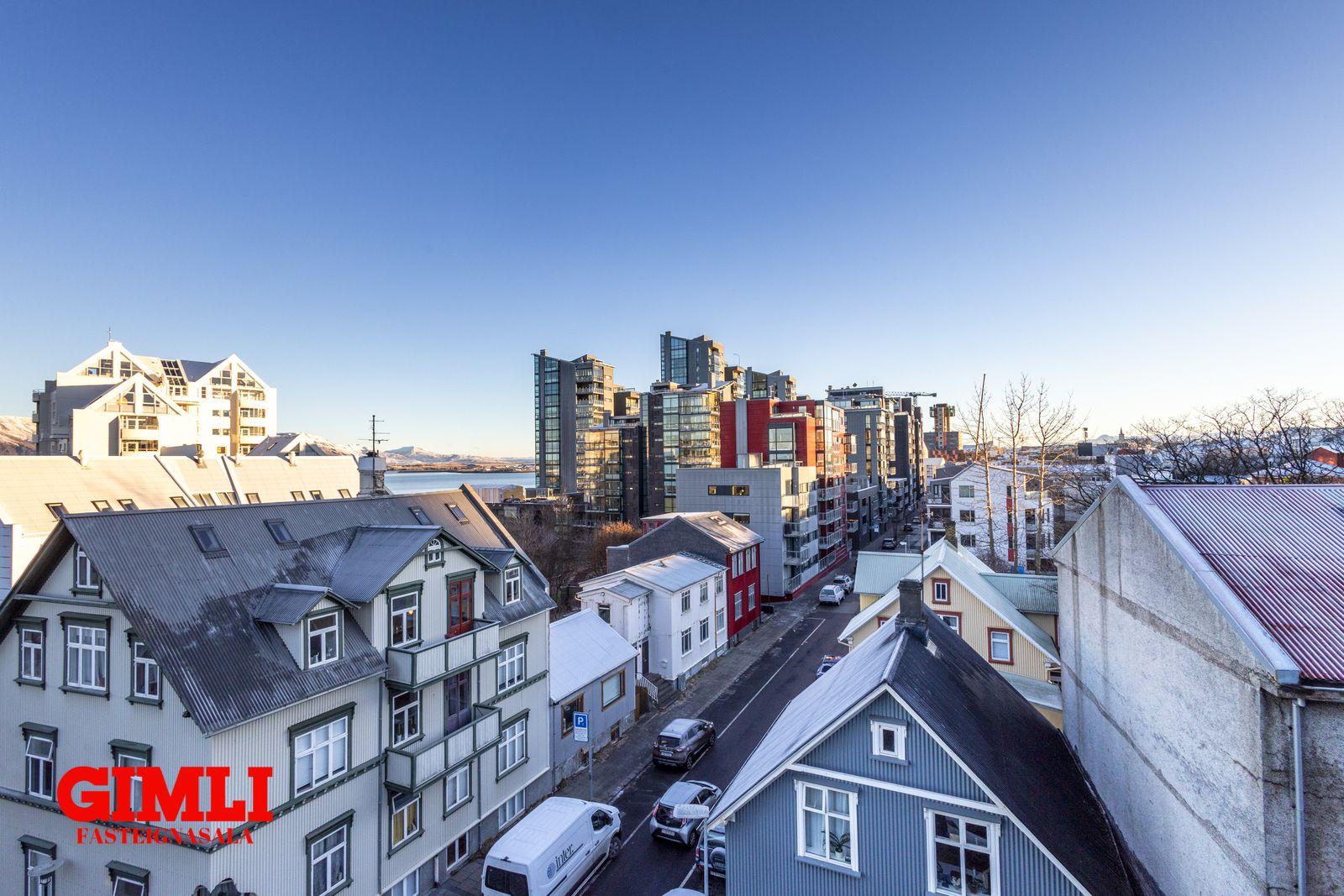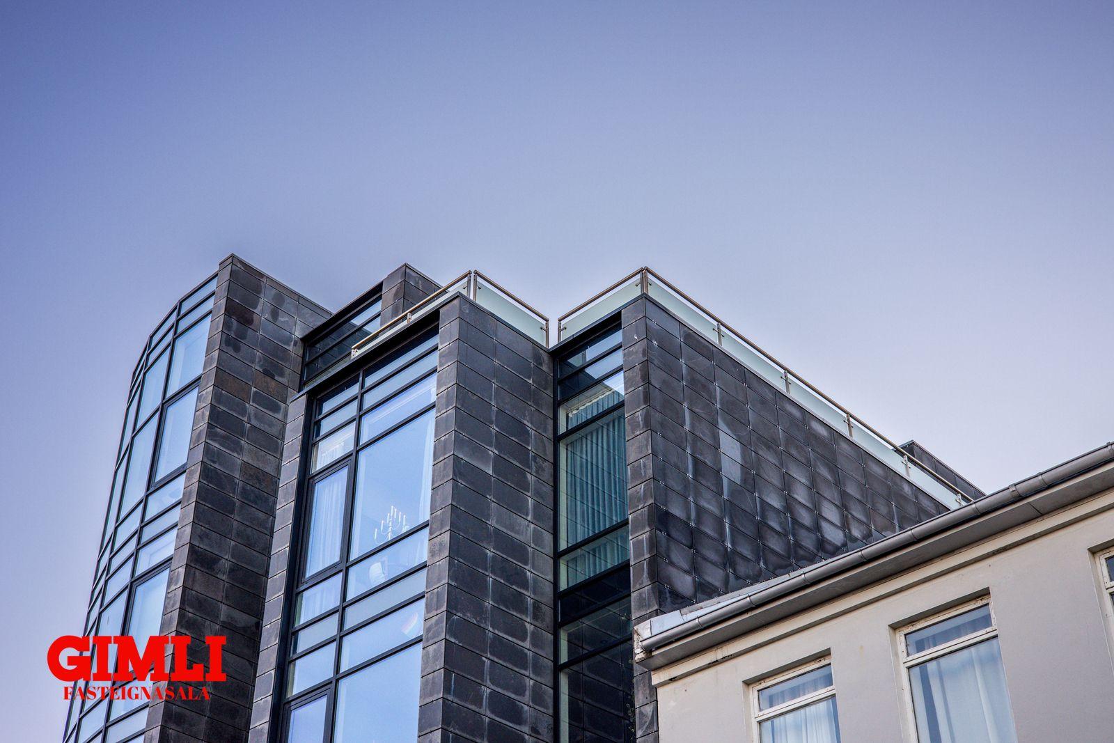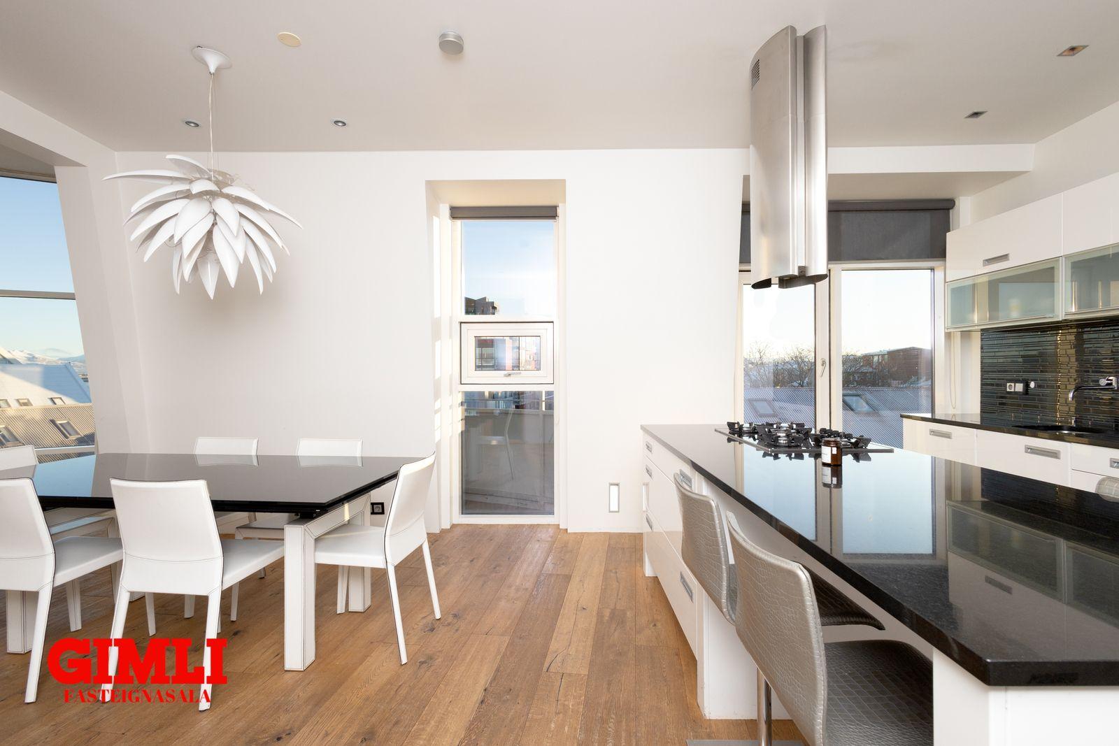 KLAPPARSTÍGUR 14 - GLÆSILEG PENTHOUSE ÍBÚÐUm er að ræða einstaka 117,5 fm penthouse/þakíbúð á 5.hæð í 8 íbúða húsi byggt 2006 sem stendur mjög vel með tilliti til útsýnis sem er 360 gr og er sjávarútsýnið einstakt. Lyfta er upp í íbúðina með sérstökum aðgangscóða. Mikil lofthæð er í íbúðinni og þá sérstaklega í stofunni og miklir gluggar á þrjá vegu. Tvennar svalir ásamt 45 fm verönd með miklu útsýni.