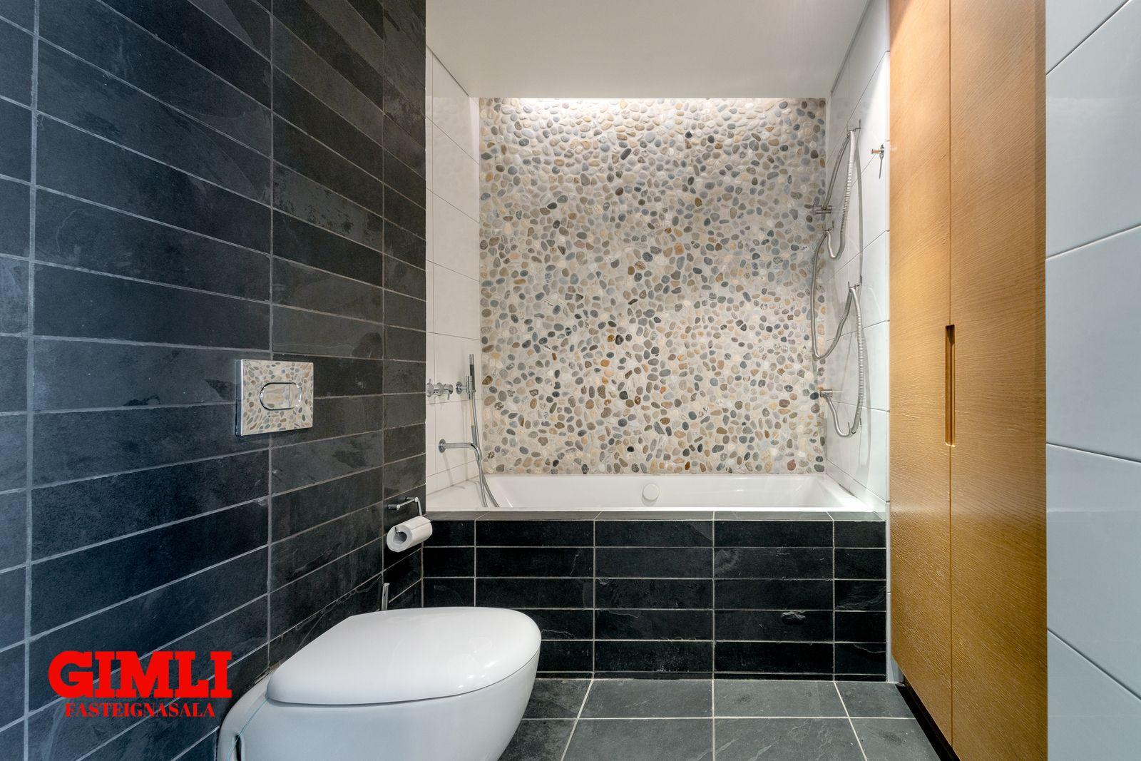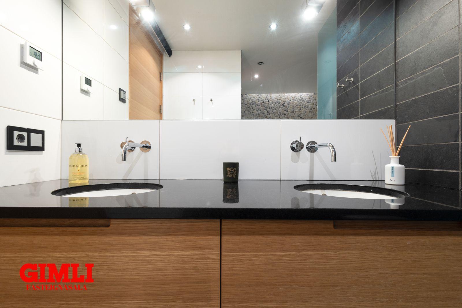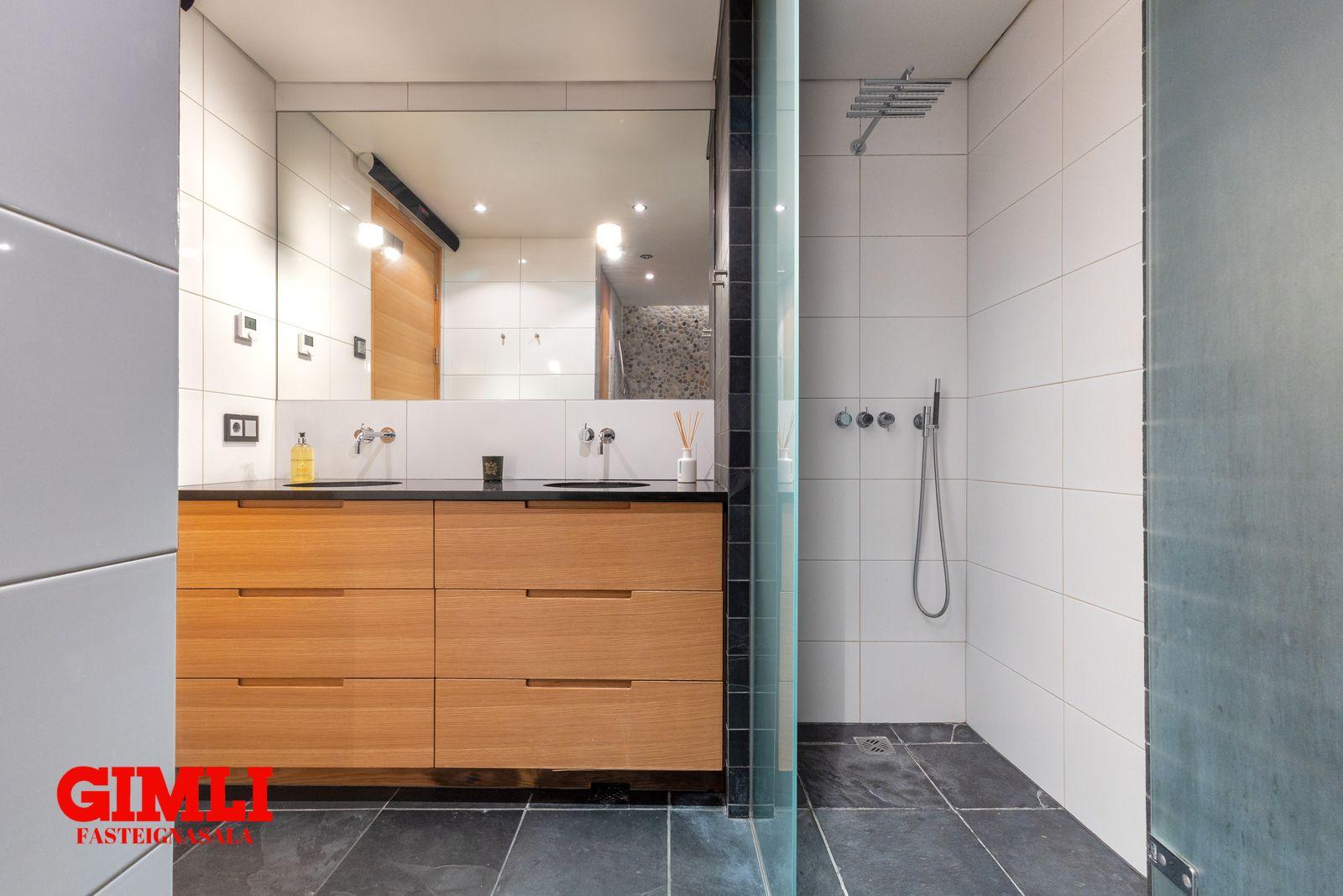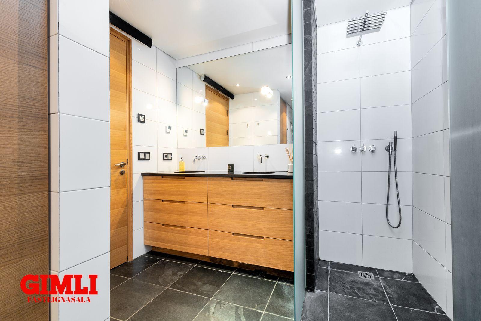 Baðherbergið er einstaklega glæsilegt með vandaðri flísalögn, innrétting með tveim vöskum, innfelldur vaskur, baðkar og walk in sturta ásamt handklæðaofni og eru öll blöndunartæki innbyggð frá Vola.