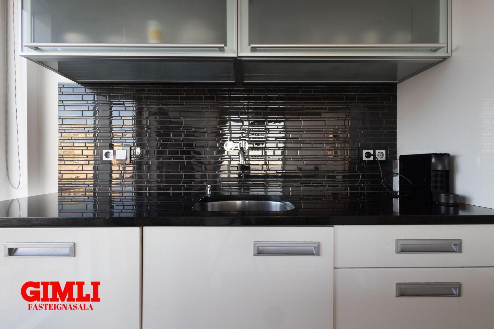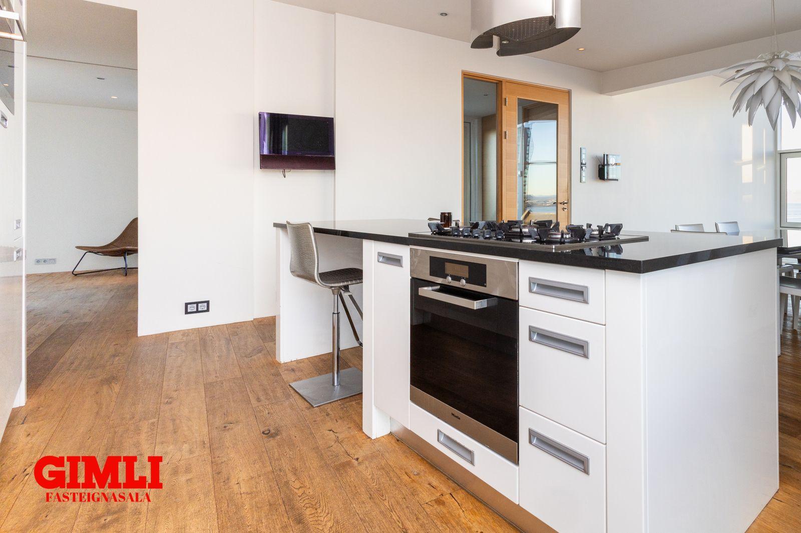 Eldhúsið er með vandaðri háglanslakkaðri innréttingu með svörtum granítstein, eldaeyja með svartri granítborðplötu og gashelluborði.