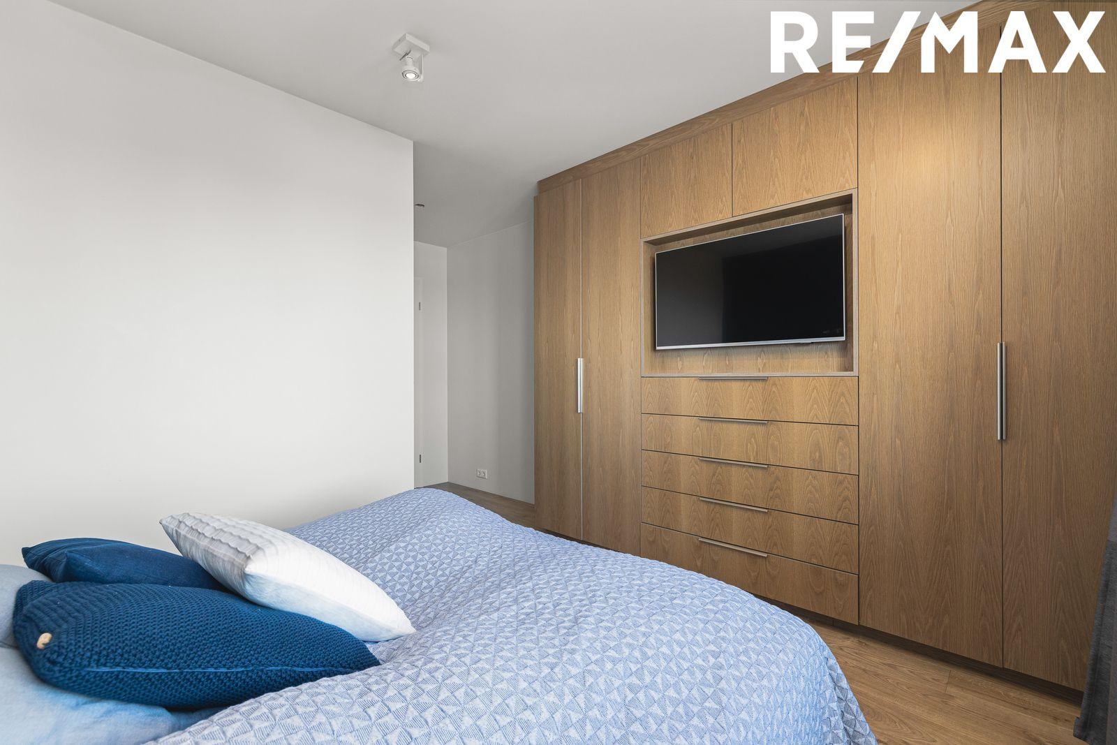 Hjónaherbergi er rúmgott með góðum skápum og sérsmíðuðum sjónvarpsskáp.