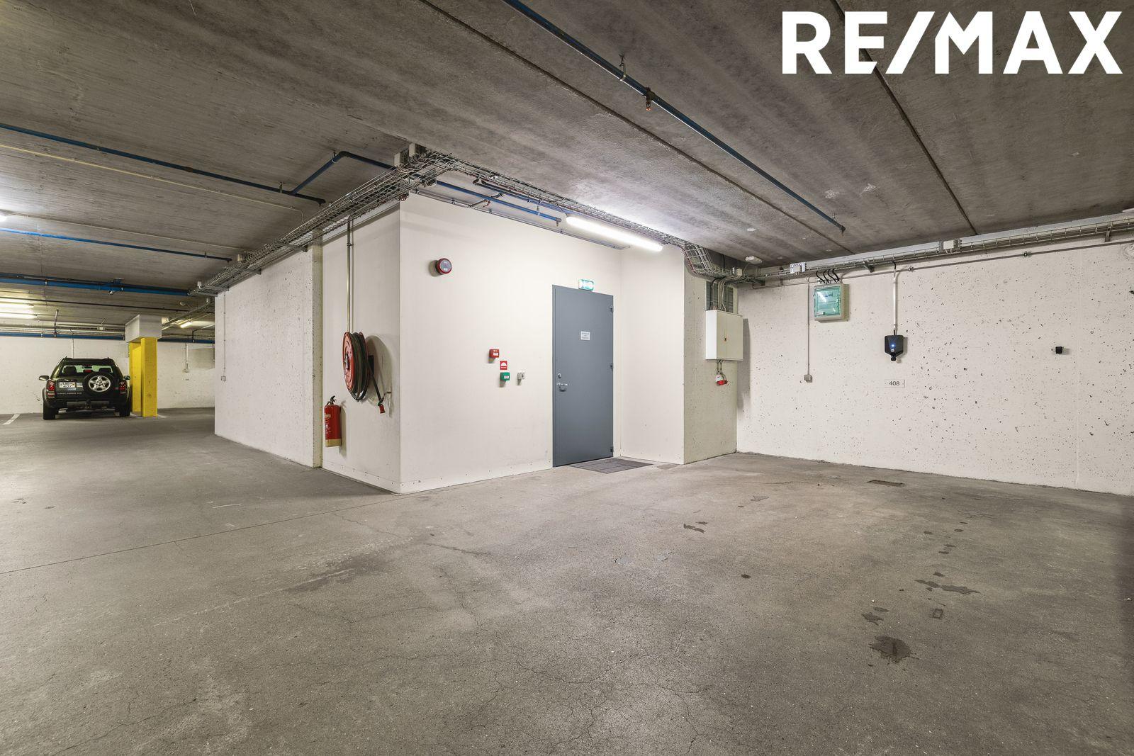 Rúmgott stæði með rafbílahleðslu alveg við inngang í lokaðri bílageymslu.